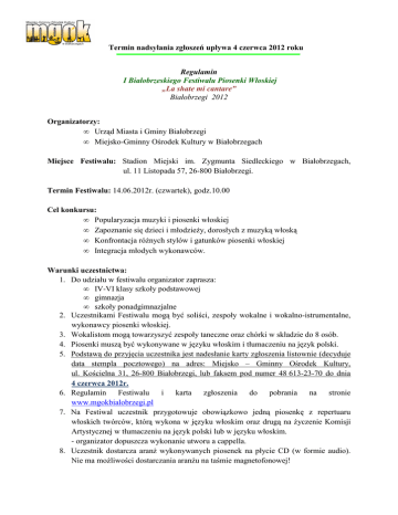 Termin nadsyłania zgłoszeń upływa 4 czerwca 2012 roku Regulamin I Białobrzeskiego Festiwalu Piosenki Włoskiej „La shate mi cantare” Białobrzegi 2012 Organizatorzy: • Urząd Miasta i Gminy Białobrzegi • Miejsko-Gminny Ośrodek Kultury w Białobrzegach Miejsce Festiwalu: Stadion Miejski im. Zygmunta Siedleckiego w Białobrzegach, ul. 11 Listopada 57, 26-800 Białobrzegi. Termin Festiwalu: 14.06.2012r. (czwartek), godz.10.00 Cel konkursu: • Popularyzacja muzyki i piosenki włoskiej • Zapoznanie się dzieci i młodzieŜy, dorosłych z muzyką włoską • Konfrontacja róŜnych stylów i gatunków piosenki włoskiej • Integracja młodych wykonawców. Warunki uczestnictwa: 1. Do udziału w festiwalu organizator zaprasza: • IV-VI klasy szkoły podstawowej • gimnazja • szkoły ponadgimnazjalne 2. Uczestnikami Festiwalu mogą być soliści, zespoły wokalne i wokalno-istrumentalne, wykonawcy piosenki włoskiej. 3. Wokalistom mogą towarzyszyć zespoły taneczne oraz chórki w składzie do 8 osób. 4. Piosenki muszą być wykonywane w języku włoskim i tłumaczeniu na język polski. 5. Podstawą do przyjęcia uczestnika jest nadesłanie karty zgłoszenia listownie (decyduje data stempla pocztowego) na adres: Miejsko – Gminny Ośrodek Kultury, ul. Kościelna 31, 26-800 Białobrzegi, lub faksem pod numer 48 613-23-70 do dnia 4 czerwca 2012r. 6. Regulamin Festiwalu i karta zgłoszenia do pobrania na stronie www.mgokbialobrzegi.pl 7. Na Festiwal uczestnik przygotowuje obowiązkowo jedną piosenkę z repertuaru włoskich twórców, którą wykona w języku włoskim oraz drugą na Ŝyczenie Komisji Artystycznej w tłumaczeniu na język polski lub w języku włoskim. - organizator dopuszcza wykonanie utworu a cappella. 8. Uczestnik dostarcza aranŜ wykonywanych piosenek na płycie CD (w formie audio). Nie ma moŜliwości dostarczania aranŜu na taśmie magnetofonowej! 9. W przypadku gry na instrumencie uczestnik przywozi własny. 10. W czasie Festiwalu oceny występujących solistów i zespołów dokona Jury. Kryteria oceny: 1. Czystość intonacji 2. Poziom języka włoskiego 3. Warunki głosowe i muzykalność 4. Dykcja 5. Interpretacja i wartości estetyczne 6. Dobór repertuaru do wieku, moŜliwości i warunków głosowych wykonawcy 7. Ogólny wyraz artystyczny. Nagrody: 1. Wszyscy uczestnicy otrzymają pamiątkowe dyplomy za udział. 2. Laureaci Festiwalu otrzymają nagrody rzeczowe ufundowane przez organizatorów Festiwalu. Postanowienia końcowe: 1. Koszty związane z przejazdem pokrywa uczestnik lub placówka delegująca. 2. Ubezpieczenie uczestników dokonuje placówka delegująca. 3. Uczestnicy występują zgodnie z harmonogramem ustalonym przez organizatorów. 4. Organizator zapewnia profesjonalne nagłośnienie. 5. Zespoły i soliści wykonują dwie piosenki jedną w języku włoskim, drugą w języku polskim lub włoskim (druga piosenka na Ŝyczenie Jury) i przyjeŜdŜają z własnym podkładem. 6. Jury zastrzega sobie prawo do ostatecznej interpretacji regulaminu i jego werdykt jest ostateczny. Adresy kontaktowe: Miejsko – Gminny Ośrodek Kultury ul. Kościelna 31 26-800 Białobrzegi Tel/fax. 48 613-23-70 Piosenką finałową w wykonaniu finalistów będzie „L'italiano” L’italiano (fonetycznie) Ref: Lasziatemi kantare kon la gitarraj mano lasziatemi kantare - sono n’italiano BondŜior Italia gli spagetti al dente Un partidŜiano kome Prezidente Kon l'autoradio sempre nella mano destra un kanarino sopra la finestra BondŜior Italia kon i tłoi artisti Kon troppa merica sui manifesti Kon le kanconi kon amore kon il kłore Kon piu' donne sempre meno słore BondŜior Italia bondŜiorno Maria Kon glioki pieni di malinkonija BondŜior Dio lo sajke czi son ankijo Ref: Lasziatemi kantare kon la gitarraj mano Lasziatemi kantare una kancone piano, piano Lasziatemi kantare perke ne sono fiero Sono n’italiano, un italiano wero. BondŜior Italia ke non si spawenta e kon la krema da barba la menta kon un westito dŜesato sul blu, e la mowiola la domenikan tiwu BondŜior Italia col caffe' ristretto le kalce nowe nel primo casetto kon la bandiera in tintoria una sejczento dŜiu' di carroceria BondŜior Italia BondŜiorno Maria kon glioki pieni di malinkonija BondŜior Dio lo sajke czi son ankijo Ref: La la la la la la la la... ZAPRASZAMY !!!