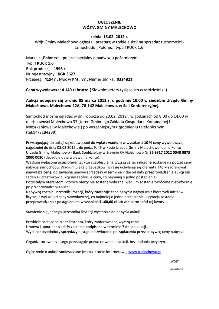 OGŁOSZENIE WÓJTA GMINY MALECHOWO z dnia 15.02. 2012 r. Wójt Gminy Malechowo ogłasza I przetarg w trybie aukcji na sprzedaż ruchomości samochodu ,,Polonez” typu TRUCK 1,6. Marka : ,,Polonez” - pojazd specjalny o nadwoziu pożarniczym Typ: TRUCK 1,6 Rok produkcji : 1996 r. Nr rejestracyjny : KGK 3627 Przebieg : 41947 ; Moc w KM : 87 ; Numer silnika: 0324821 Cena wywoławcza: 4 140 zł brutto.( Słownie: cztery tysiące sto czterdzieści zł.). Aukcja odbędzie się w dniu 05 marca 2012 r. o godzinie 10.00 w siedzibie Urzędu Gminy Malechowo, Malechowo 22A, 76-142 Malechowo, w Sali Konferencyjnej. Samochód można oglądać w dni robocze od 20.02. 2012r. w godzinach od 8.00 do 14.00 w miejscowości Malechowo 37 (teren Gminnego Zakładu Gospodarki Komunalnej i Mieszkaniowej w Malechowie ) po wcześniejszym uzgodnieniu telefonicznym (tel.94/3184239). Przystępujący do aukcji są zobowiązani do wpłaty wadium w wysokości 10 % ceny wywoławczej najpóźniej do dnia 05.03 2012r. do godz. 9, 45 w kasie Urzędu Gminy Malechowo lub na konto Urzędu Gminy Malechowo - Bank Spółdzielczy w Sławnie O/Malechowo Nr 36 9317 1012 0040 0073 2000 0030 (decyduje data wpływu na konto). Wadium wpłacone przez oferenta, który zaoferuje najwyższą cenę, zaliczone zostanie na poczet ceny nabycia samochodu. Wadium ulega przepadkowi w razie uchylenia się oferenta, który zaoferował najwyższą cenę, od zawarcia umowy sprzedaży w terminie 7 dni od daty przeprowadzenia aukcji lub żaden z uczestników aukcji nie zaoferuje ceny, co najmniej o jedno postąpienie. Pozostałym oferentom, których oferty nie zostaną wybrane, wadium zostanie zwrócone niezwłocznie po przeprowadzeniu aukcji. Nabywcą zostaje uczestnik licytacji, który zaoferuje cenę nabycia najwyższą z biorących udział w licytacji i wyższą od ceny wywoławczej, co najmniej o jedno postąpienie. Licytacja zostanie przeprowadzona z postąpieniem w wysokości 160,00 zł lub wielokrotności tej kwoty. Stawienie się jednego uczestnika licytacji wystarcza do odbycia aukcji. Przybicie nastąpi na rzecz licytanta, który zaoferował najwyższą cenę. Umowa kupna – sprzedaży zostanie podpisana w terminie 7 dni po aukcji. Wydanie przedmioty sprzedaży nastąpi niezwłocznie po zapłaceniu przez nabywcę ceny nabycia. Organizatorowi przetargu przysługuje prawo odwołania aukcji, bez podania przyczyn. Ogłoszenie o aukcji zamieszczone jest na stronie internetowej www.malechowo.pl WÓJT Jan Szlufik