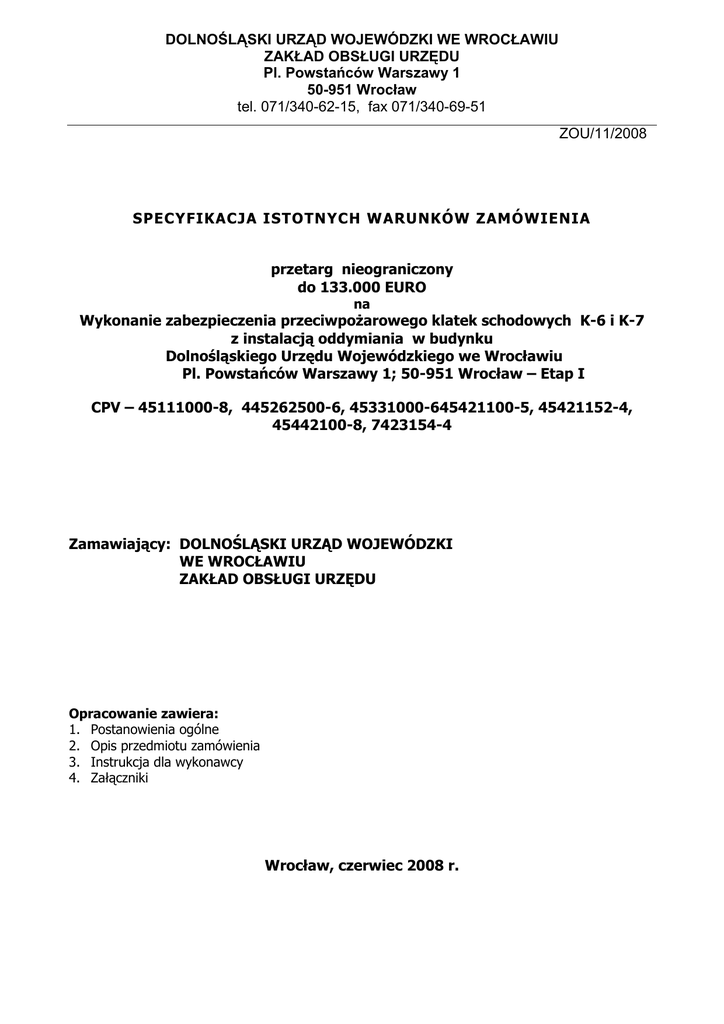 DOLNOŚLĄSKI URZĄD WOJEWÓDZKI WE WROCŁAWIU ZAKŁAD OBSŁUGI URZĘDU Pl. Powstańców Warszawy 1 50-951 Wrocław tel. 071/340-62-15, fax 071/340-69-51 ZOU/11/2008 SPECYFIKACJA ISTOTNYCH WARUNKÓW ZAMÓWIENIA przetarg nieograniczony do 133.000 EURO na Wykonanie zabezpieczenia przeciwpożarowego klatek schodowych K-6 i K-7 z instalacją oddymiania w budynku Dolnośląskiego Urzędu Wojewódzkiego we Wrocławiu Pl. Powstańców Warszawy 1; 50-951 Wrocław – Etap I CPV – 45111000-8, 445262500-6, 45331000-645421100-5, 45421152-4, 45442100-8, 7423154-4 Zamawiający: DOLNOŚLĄSKI URZĄD WOJEWÓDZKI WE WROCŁAWIU ZAKŁAD OBSŁUGI URZĘDU Opracowanie zawiera: 1. Postanowienia ogólne 2. Opis przedmiotu zamówienia 3. Instrukcja dla wykonawcy 4. Załączniki Wrocław, czerwiec 2008 r. SPIS TREŚCI SPECYFIKACJA ISTOTNYCH WARUNKÓW ZAMÓWIENIA Do przetargu nieograniczonego na wykonanie zabezpieczenia przeciwpożarowego klatek schodowych K-6 i K-7 z instalacją oddymiania w budynku Dolnośląskiego Urzędu Wojewódzkiego we Wrocławiu Pl. Powstańców Warszawy 1; 50-951 Wrocław – Etap I. Tel. (071) 340-62-15, fax (071) 340-69-51 CPV – 45111000-8, 445262500-6, 45331000-645421100-5, 45421152-4, 45442100-8, 7423154-4 ZOU/11/2008 I. Postanowienia ogólne II. Opis przedmiotu zamówienia III. Instrukcja dla wykonawcy 1. 2. 3. 4. 5. 6. 7. 8. 9. 10. 11. 12. 13. 14. 15. Opis przygotowania oferty. Informacje dotyczące warunków wymaganych od wykonawców. W yma ga ne do ku me nt y. Kryteria oceny ofert i zasady ich oceny. Opis sposobu obliczenia ceny. Ocena oferty – najniższa cena. Wymagany termin realizacji zadania. Udzielanie wyjaśnień dotyczących SIWZ. Sposób, miejsce i termin składania oferty. Miejsce i termin otwarcia ofert. Wymagania dotyczące wadium. Termin związania ofertą. Informacje o zasadach otwarcia i ocenie ofert. Osoby uprawnione do kontaktowania się z wykonawcami. Istotne postanowienia do umowy oraz formalności jakie musi spełnić wykonawca przed podpisaniem umowy. 16. Środki ochrony prawnej przysługujące wykonawcy. IV. Załączniki Załącznik Załącznik Załącznik Załącznik Załącznik Załącznik Załącznik Załącznik Załącznik nr nr nr nr nr nr nr nr nr 1 2 3 4 5 6 7 8 9 – – – – – – – – – Formularz oferty. Oświadczenia wykonawcy. kosztorys ofertowy Doświadczenie zawodowe (techniczne) Wykaz kadry Projekt umowy. Dokumentacja projektowa Specyfikacje techniczne wykonania i odbioru robót budowlanych. Przedmiar robót 2 SPECYFIKACJA ISTOTNYCH WARUNKÓW ZAMÓWIENIA I. Postanowienia ogólne Dolnośląski Urząd Wojewódzki we Wrocławiu Zakład Obsługi Urzędu, z siedzibą przy pl. Powstańców Warszawy 1, 50-951 Wrocław, tel. (071) 340-62-15, fax (071) 340–69–51, zwany dalej Zamawiającym, zaprasza do udziału w przetargu nieograniczonym na zadanie pod nazwą „Wykonanie zabezpieczenia przeciwpożarowego klatek schodowych K-6 i K-7 z instalacją oddymiania w budynku Dolnośląskiego Urzędu Wojewódzkiego we Wrocławiu Pl. Powstańców Warszawy 1; 50-951 Wrocław – Etap I, zgodnie z niniejszą specyfikacją istotnych warunków zamówienia. 1. Postępowanie prowadzone jest zgodnie z ustawą z dnia 29 stycznia 2004 r. - Prawo zamówień publicznych (tekst jednolity z 2007 r. Dz. U, Nr 223, poz. 1655, z późn. zm.), zwaną w dalszej części „ustawą” lub „PZP”. 2. Do czynności podejmowanych przez Zamawiającego i Wykonawcę stosować się będzie przepisy ustawy z dnia 23 kwietnia 1964 r. – Kodeks cywilny (Dz. U. Nr 16, poz. 93 z późn. zm.), jeżeli przepisy PZP nie stanowią inaczej. 3. Ogłoszenie o zamówieniu zamieszczono: w Biuletynie Zamówień Publicznych na Portalu UZP, na tablicy ogłoszeń w siedzibie Zamawiającego oraz na stronie internetowej Zamawiającego www.duw.pl. 4. Zgodnie z art. 27 PZP, wszelkie oświadczenia, wnioski, zawiadomienia, pytania i informacje Zamawiający i Wykonawcy muszą przekazywać pisemnie. Zamawiający nie dopuszcza porozumiewania się drogą elektroniczną. Dopuszcza się formę faksu, pod warunkiem niezwłocznego potwierdzenia oryginałem. 5. SIWZ dostępna jest na stronie internetowej Zamawiającego www.duw.pl. Na stronie tej znajdować się będą pytania zadawane przez Wykonawców i odpowiedzi, modyfikacje SIWZ dokonywane przez Zamawiającego oraz ewentualne informacje o środkach ochrony prawnej. 6. Rozliczenia między Zamawiającym a Wykonawcą prowadzone będą w PLN. 7. Wymaga się, aby Wykonawca zdobył wszystkie informacje, które są niezbędne do przygotowania oferty oraz podpisania umowy. 8. Wybrany Wykonawca jest zobowiązany do zawarcia umowy w terminie i miejscu wyznaczonym przez Zamawiającego. 9. Zamawiający nie dopuszcza składania ofert częściowych. 10. Oferta musi obejmować całość zamówienia, nie dopuszcza się składania ofert wariantowych. 11. Zamawiający nie przewiduje udzielenia zamówień uzupełniających, o których mowa w art. 67 ust. 1 pkt 6 PZP, aukcji elektronicznej, dynamicznego systemu zakupów i umów ramowych. 12. Zamawiający nie przewiduje zebrania wykonawców. 13. W przypadku realizacji zadania przy udziale podwykonawcy, Zamawiający żąda od Wykonawcy wskazania w ofercie którą część zamówienia powierzy podwykonawcy. 14. Wykonawca winien zaakceptować warunki zawarte w niniejszej specyfikacji. 15. Wykonawca powinien zapoznać się ze wszystkimi wymaganiami określonymi w niniejszej specyfikacji. 16. Wykonawca ponosi wszelkie koszty związane z przygotowaniem i złożeniem oferty. Wymaga się, aby wykonawca zdobył wszystkie informacje, które mogą być konieczne do przygotowania oferty oraz podpisania umowy. 17. Zgodnie z art. 42 ust. 2 Zamawiający przekazuje SIWZ Wykonawcy w terminie 5 dni od otrzymania wniosku. Opłata w wysokości 8,10 zł, jakiej Zamawiający będzie żądał za SIWZ to koszt jej druku. Przy wysyłce pocztą doliczone będą koszty przekazania. 3 II. Opis przedmiotu zamówienia. Przedmiotem zamówienia 