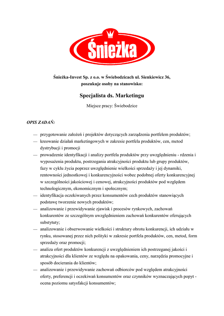 Śnieżka-Invest Sp. z o.o. w Świebodzicach ul. Sienkiewicz 36, poszukuje osoby na stanowisko: Specjalista ds. Marketingu Miejsce pracy: Świebodzice OPIS ZADAŃ: przygotowanie założeń i projektów dotyczących zarządzenia portfelem produktów;  kreowanie działań marketingowych w zakresie portfela produktów, cen, metod dystrybucji i promocji  prowadzenie identyfikacji i analizy portfela produktów przy uwzględnieniu - rdzenia i wyposażenia produktu, postrzegania atrakcyjności produktu lub grupy produktów, fazy w cyklu życia poprzez uwzględnienie wielkości sprzedaży i jej dynamiki,  rentowności jednostkowej i konkurencyjności wobec podobnej oferty konkurencyjnej w szczególności jakościowej i cenowej, atrakcyjności produktów pod względem technologicznym, ekonomicznym i społecznym;  identyfikacja oczekiwanych przez konsumentów cech produktów stanowiących podstawę tworzenie nowych produktów;  analizowanie i przewidywanie zjawisk i procesów rynkowych, zachowań konkurentów ze szczególnym uwzględnieniem zachowań konkurentów oferujących substytuty;  analizowanie i obserwowanie wielkości i struktury obrotu konkurencji, ich udziału w rynku, stosowanej przez nich polityki w zakresie portfela produktów, cen, metod, form sprzedaży oraz promocji; analiza ofert produktów konkurencji z uwzględnieniem ich postrzeganej jakości i atrakcyjności dla klientów ze względu na opakowania, ceny, narzędzia promocyjne i sposób docierania do klientów;  analizowanie i przewidywanie zachowań odbiorców pod względem atrakcyjności oferty, preferencji i oczekiwań konsumentów oraz czynników wyznaczających popyt ocena poziomu satysfakcji konsumentów;        przygotowywanie i zorganizowanie badan marketingowych wewnętrznych oraz opracowanie ich wyników w celu osiągnięcia zamierzonych celów; organizowanie i uczestnictwo w targach zarówno krajowych jak i międzynarodowych; opracowywanie materiałów informacyjnych o firmie z zamiarem kreowania pozytywnego wizerunku; przygotowywanie i wybór wzorów nowych opakowań lub modyfikacja, lifting starych w celu lepszego wizerunku produktów na rynku; współpraca z drukarniami przygotowującymi opakowania - negocjowanie warunków współpracy, akceptacja wydruków; przygotowywanie ofert handlowych celem pozyskania nowych odbiorców zarówno na rynku krajowym jak w zakresie ofert eksportowych - nawiązanie kontaktu, przygotowanie ofert cenowych, katalogów i próbek. WYMAGANIA:      wykształcenie wyższe kierunkowe – marketing, marketing i zarządzanie itp.; biegła znajomość języka angielskiego (znajomość innych języków obcych będzie atutem); dobra organizacja pracy, komunikatywność, wysoka kultura osobista; dobra znajomość pakietu MS Office; prawo jazdy kat. B. OFERUJEMY: pracę w stabilnej firmie;  możliwość rozwoju zawodowego;  umowę o pracę.  Osoby zainteresowane prosimy o przesyłanie aplikacji na adres [email protected] Prosimy o zawarcie w CV klauzuli: „Wyrażam zgodę na przetwarzanie danych osobowych zawartych w mojej ofercie pracy dla potrzeb niezbędnych do realizacji procesu rekrutacji prowadzonego przez Śnieżka-Invest sp. z o.o. z siedzibą w Świebodzicach, ul.H.Sienkiewicza 36,zgodnie z ustawą z dnia 29 sierpnia 1997 r. o ochronie danych osobowych (tj. Dz. U. z 2014 r. poz. 1182, 1662)”. Informujemy, że Administratorem danych jest Śnieżka-Invest sp. z o.o. z siedzibą w Świebodzicach przy ul.H.Sienkiewicza 36. Dane zbierane są dla potrzeb rekrutacji. Ma Pani/Pan prawo dostępu do treści swoich danych oraz ich poprawiania. Podanie danych w zakresie określonym przepisami ustawy z dnia 26 czerwca 1974 r. Kodeks pracy oraz aktów wykonawczych jest obowiązkowe. Podanie dodatkowych danych osobowych jest dobrowolne.