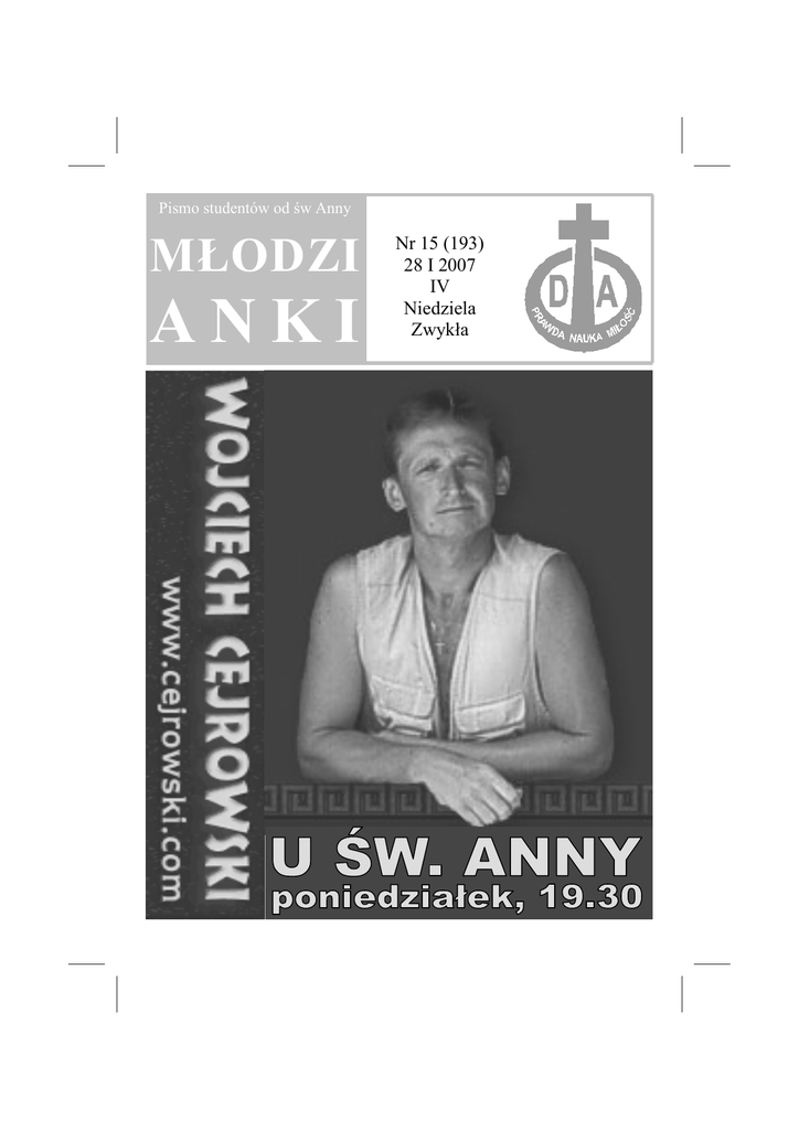 Pismo studentów od św Anny MŁODZI ANKI Nr 15 (193) 28 I 2007 IV Niedziela Zwykła KOMENTARZ DO NIEDZIELNEJ EWANGELII (Łk 4,21-30) Począł więc mówić do nich: Dziś spełniły się te słowa Pisma, któreście słyszeli. A wszyscy przyświadczali Mu i dziwili się pełnym wdzięku słowom, które płynęły z ust Jego. I mówili: Czy nie jest to syn Józefa? Wtedy rzekł do nich: Z pewnością powiecie Mi to przysłowie: Lekarzu, ulecz samego siebie; dokonajże i tu w swojej ojczyźnie tego, co wydarzyło się, jak słyszeliśmy, w Kafarnaum. I dodał: Zaprawdę, powiadam wam: żaden prorok nie jest mile widziany w swojej ojczyźnie. Naprawdę, mówię wam: Wiele wdów było w Izraelu za czasów Eliasza, kiedy niebo pozostawało zamknięte przez trzy lata i sześć miesięcy, tak że wielki głód panował w całym kraju; a Eliasz do żadnej z nich nie został posłany, tylko do owej wdowy w Sarepcie Sydońskiej. I wielu trędowatych było w Izraelu za proroka Elizeusza, a żaden z nich nie został oczyszczony, tylko Syryjczyk Naaman. Na te słowa wszyscy w synagodze unieśli się gniewem. Porwali Go z miejsca, wyrzucili Go z miasta i wyprowadzili aż na stok góry, na której ich miasto było zbudowane, aby Go strącić. On jednak przeszedłszy pośród W poprzednią niedzielę Chrystus odczytywał proroctwo z księgi Izajasza, czym wprowadził wszystkich słuchaczy w przedziwny stan skupienia połączonego z zaskoczeniem i niedowierzaniem. Jak czytamy w relacji Ewangelisty: „oczy wszystkich w synagodze były w Nim utkwione”. W takim właśnie momencie Chrystus rozpoczął swoją naukę i wciąż nie przestaje zaskakiwać zgromadzonych w synagodze. Oto znany im przecież dobrze „syn Józefa” mówi o wypełnieniu się słów starotestamentowego proroctwa. Doprawdy przedziwna sytuacja. Warto jednak zauważyć, że Chrystus wcale nie ograniczył się do zaskoczenia słuchaczy. Nie zawahał się, aby w kilku bezpośrednich słowach wytknąć „swoim” brak wiary i zatwardziałość serc. Można w tym miejscu zapytać, czy ta ewangeliczna scena nie powtarza się często także i dziś. Wielokrotnie gromadzimy się przecież na liturgii i wsłuchujemy się w kierowane do nas słowa Chrystusa, który nie przestaje powtarzać: „nawracajcie się i wierzcie w Ewangelię” (Mk 1, 15). Jaka jest nasza odpowiedź? Niestety bardzo często swoim zachowaniem przypominamy owych ludzi z dzisiejszej Ewangelii. Potrafimy przyjmować Boga do momentu, w którym wszystko układa się po naszej myśli, a nasze chrześcijaństwo nie wiąże z żadnym obciążeniem czy osobistą ofiarą. Kiedy tylko pojawiają się problemy i stajemy wobec trudnych wyzwań oraz konieczności kolejnego nawrócenia, wielu z nas ogarnia nie tylko rezygnacja, ale wręcz oburzenie. Powraca wówczas mechanizm relacji z Bogiem, w którym traktujemy Go wyłącznie jako osobę spełniającą wszystkie nasze prośby i życzenia. Chrystus przypomina dziś, jak bardzo ważna w życiu każdego człowieka jest pokora i zawierzenie temu, który chce realizować swój plan wobec każ- 2 dego człowieka. Każdy jest bowiem zaproszony do świętości, nawet ci, którzy w powszechnym odczuciu traktowani są często z pogardą czy lekceważeniem. Nie ma w życiu takiej sytuacji, w której Bóg mógłby zrezygnować z człowieka i wycofać skierowaną do niego ofertę zbawienia. Wystarczy jedynie, że pozwolimy mu działać. Wydarzenia opisane w dzisiejszej Ewangelii to także okazja do głębszej refleksji nad tym, czy my sami mamy na co dzień dość odwagi, aby mówić prawdę. Bardzo często stajemy przecież w obliczu sytuacji, które są w oczywisty sposób sprzeczne z systemem wartości chrześcijańskich osadzonych na gruncie Ewangelii. Nie trzeba daleko szukać, aby w dzisiejszym świecie dostrzec wiele przykładów łamania podstawowych prawd naszej wiary. Na ile jesteśmy gotowi jej bronić? Czy staramy się w praktyce realizować te wszystkie zasady, do których odwołujemy się w swoich codziennych modlitwach, czy są one jedynie pewną formą wciąż powtarzanego rytuału? Jak wiele jesteśmy w tanie zaryzykować, aby podobnie jak Chrystus dawać świadectwo o prawdzie? Nie ulega najmniejszej wątpliwości, że jest to bardzo trudne zadanie. Szczególnie, kiedy trzeba się sprzeciwić różnym sytuacjom w gronie najbliższych znajomych czy w rodzinie. Może nam się czasem wydawać, że nie mamy przecież dostatecznej siły przebicia, że jesteśmy po prostu za słabi. Przychodzi wówczas pokusa, aby to czy owo przemilczeć, nie wychylać się niepotrzebnie z mało popularnym stanowiskiem i to jeszcze w grupie kolegów czy koleżanek. Ogromna pokusa pozostania biernym obserwatorem. Zupełnie jak beznamiętni obserwatorzy drogi krzyżowej i konania Chrystusa na kalwarii. Czy rzeczywiście do tego zostaliśmy wezwani? Marcin. Czy prawicowe pokolenie JP2? W mediach funkcjonuje wiele, niekiedy sprzecznych, sposobów rozumienia pojęcia pokolenie JP2. Niektórzy w ogóle kwestionują jego istnienie, lub traktują z przymrużeniem oka ludzi, którzy się z nim utożsamiają. Krytykom chcę spokojnie odpowiedzieć: pokolenie JP2 istnieje! Nawet więcej niż jedno. Pod tym pojęciem rozumiem przede wszystkim część młodszej generacji, dla której chrześcijaństwo jest konsekwentnym życiowym wyborem, a Jan Paweł II był najważniejszym współczesnym nauczycielem wiary i wzorcem etycznym. To ludzie, którzy mimo obiekcji otoczenia nie wstydzą się swojej wiary, lecz świadczą o niej w sposób jednoznaczny, a przy tym trafiający do ich pokolenia – lepiej wykształconego i przyzwyczajonego do życia w społeczeństwie, w którym trwa otwarty spór między różnymi systemami wartości. Pokolenie JP2 nie jest bardzo liczne, jednak ma ambicję świadczenia o wierze również tam, gdzie procesy laicyzacji są najmocniejsze – w środowiskach wielkomiejskich i inteligenckich. Ludzie z pokolenia JP2 angażują się, wi