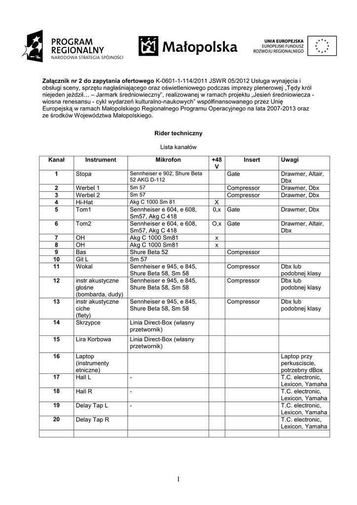 Załącznik nr 2 do zapytania ofertowego K-0601-1-114/2011 JSWR 05/2012 Usługa wynajęcia i obsługi sceny, sprzętu nagłaśniającego oraz oświetleniowego podczas imprezy plenerowej „Tędy król niejeden jeździł… – Jarmark średniowieczny”, realizowanej w ramach projektu „Jesień średniowiecza wiosna renesansu - cykl wydarzeń kulturalno-naukowych” współfinansowanego przez Unię Europejską w ramach Małopolskiego Regionalnego Programu Operacyjnego na lata 2007-2013 oraz ze środków Województwa Małopolskiego. Rider techniczny Lista kanałów Kanał Instrument Mikrofon Sennheiser e 902, Shure Beta 52 AKG D-112 Sm 57 Sm 57 Akg C 1000 Sm 81 1 Stopa 2 3 4 5 Werbel 1 Werbel 2 Hi-Hat Tom1 6 Tom2 7 8 9 10 11 OH OH Bas Git L Wokal 12 14 instr akustyczne głośne (bombarda, dudy) instr akustyczne ciche (flety) Skrzypce 15 Lira Korbowa 16 17 Laptop (instrumenty etniczne) Hall L - 18 Hall R - 19 Delay Tap L - 20 Delay Tap R 13 Sennheiser e 604, e 608, Sm57, Akg C 418 Sennheiser e 604, e 608, Sm57, Akg C 418 Akg C 1000 Sm81 Akg C 1000 Sm81 Shure Beta 52 Sm 57 Sennheiser e 945, e 845, Shure Beta 58, Sm 58 Sennheiser e 945, e 845, Shure Beta 58, Sm 58 Sennheiser e 945, e 845, Shure Beta 58, Sm 58 +48 V Insert Gate X 0,x Uwagi Compressor Compressor Drawmer, Altair, Dbx Drawmer, Dbx Drawmer, Dbx Gate Drawmer, Dbx O,x Gate Drawmer, Altair, Dbx x x Compressor Compressor Compressor Compressor Dbx lub podobnej klasy Dbx lub podobnej klasy Dbx lub podobnej klasy Linia Direct-Box (własny przetwornik) Linia Direct-Box (własny przetwornik) Laptop przy perkusciscie, potrzebny dBox T.C. electronic, Lexicon, Yamaha T.C. electronic, Lexicon, Yamaha T.C. electronic, Lexicon, Yamaha T.C. electronic, Lexicon, Yamaha 1 SYSTEM F.O.H. Mixer 24-kanałowy z co najmniej podwójną parametryczną korekcją, regulowanym filtrem górno przepustowym, phantom (+48V). W insert sumy wpięty korektor tercjowy (preferowany KLARK TECHNIK, DBX). Wymagane są takŜe 2 multiefekty Hall i Delay TAP (Yamaha spx990, T.C. M-One i T.C. D-Two lub urządzenie podobnej klasy). Moc muzyczna systemu musi być dostosowana do nagłaśnianej powierzchni. Niedopuszczalne są kolumny robionych tak zwanym „domowym sposobem”. MONITORY: Perkusista (Tor 6 na planie sceny) korzysta z własnego miksera odsłuchowego, proszę podać mu miksdown kablem z końcówką Jack TS (mono). Wokalista (Tor 3 na planie sceny) stosuje bezprzewodowy douszny system odsłuchowy Sennheiser. Zespół posiada własny nadajnik i odbiornik – wejście 2 x XLR (stereo) lub 1 x XLR (mono). Wedge - min. 5 szt. (min. po 1 dla kaŜdego muzyka z wyj. perkusisty ). KaŜdy tor monitorowy powinien posiadać osobny korektor. 2 Laptop (własny - instrumenty etniczne) dBox (z moŜliwością rozgałęzienia sygnału) Tor 6 Podest Perkusyjny sygnał kablem z końcówką Jack TS (mono) do (własnego) miksera odsłuchowego perkusisty Perkusja 230V Bas Skrzypce Dudy, flety Tor 5 dBox Tor 1 Tor2 Wok, Lira korbowa 230V 230 V Gitara Tor 3 Tor 4 Bezprzewodowy odsłuch douszny (własny), opcjonalnie DODATKOWO monitor (wedge) 3