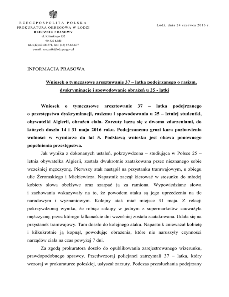 RZECZPOSPOLITA POLSKA PROKURATURA OKRĘGOWA W ŁODZI Łódź, dnia 24 czerwca 2016 r. RZE CZNIK P RASOWY ul. Kilińskiego 152 90-322 Łódź tel.: (42) 67-68-771, fax.: (42) 67-68-607 e-mail : [email protected] INFORMACJA PRASOWA Wniosek o tymczasowe aresztowanie 37 – latka podejrzanego o rasizm, dyskryminacje i spowodowanie obrażeń u 25 - latki Wniosek o tymczasowe aresztowanie 37 – latka podejrzanego o przestępstwa dyskryminacji, rasizmu i spowodowania u 25 – letniej studentki, obywatelki Algierii, obrażeń ciała. Zarzuty łączą się z dwoma zdarzeniami, do których doszło 14 i 31 maja 2016 roku. Podejrzanemu grozi kara pozbawienia wolności w wymiarze do lat 5. Podstawą wniosku jest obawa ponownego popełnienia przestępstwa. Jak wynika z dokonanych ustaleń, pokrzywdzona – studiująca w Polsce 25 – letnia obywatelka Algierii, została dwukrotnie zaatakowana przez nieznanego sobie wcześniej mężczyznę. Pierwszy atak nastąpił na przystanku tramwajowym, u zbiegu ulic Żeromskiego i Mickiewicza. Napastnik zaczął kierować w stosunku do młodej kobiety słowa obelżywe oraz szarpać ją za ramiona. Wypowiedziane słowa i zachowania wskazywały na to, że powodem ataku są jego uprzedzenia na tle narodowym i wyznaniowym. Kolejny atak miał miejsce 31 maja. Z relacji pokrzywdzonej wynika, że robiąc zakupy w jednym z supermarketów zauważyła mężczyznę, przez którego kilkanaście dni wcześniej została zaatakowana. Udała się na przystanek tramwajowy. Tam doszło do kolejnego ataku. Napastnik znieważał kobietę i kilkukrotnie ją kopnął, powodując obrażenia, które nie naruszyły czynności narządów ciała na czas powyżej 7 dni. Za zgodą prokuratora doszło do opublikowania zarejestrowanego wizerunku, prawdopodobnego sprawcy. Przedwczoraj policjanci zatrzymali 37 – latka, który wczoraj w prokuraturze poleskiej, usłyszał zarzuty. Podczas przesłuchania podejrzany 2 przyznał się do zarzutu. Jego postawa i treść złożonych wyjaśnień dają podstawy do przypuszczeń, że zachodzi realna obawa ponownego popełnienia przez niego przestępstwa. 37 – latek był już wcześniej karany za kradzież. Przebywał w Wielkiej Brytanii . Do Polski wrócił we wrześniu 2015 roku. Z jego wyjaśnień wynika, że ataki na 25 – latkę to nie jedyny przejaw agresji wobec wyznawców islamu. Jak podał, jego zachowanie wynika z niechęci do wyznawców tej religii i strach o ich zachowanie. W śledztwie planowane jest poddanie podejrzanego badaniom sądowo – psychiatrycznym, których celem będzie w szczególności ustalenie czy jest on poczytalny i czy z jego strony realnie zachodzi poważne zagrożenie ponownym popełnieniem przestępstwa. Rzecznik Prasowy Prokuratury Okręgowej w Łodzi Krzysztof Kopania