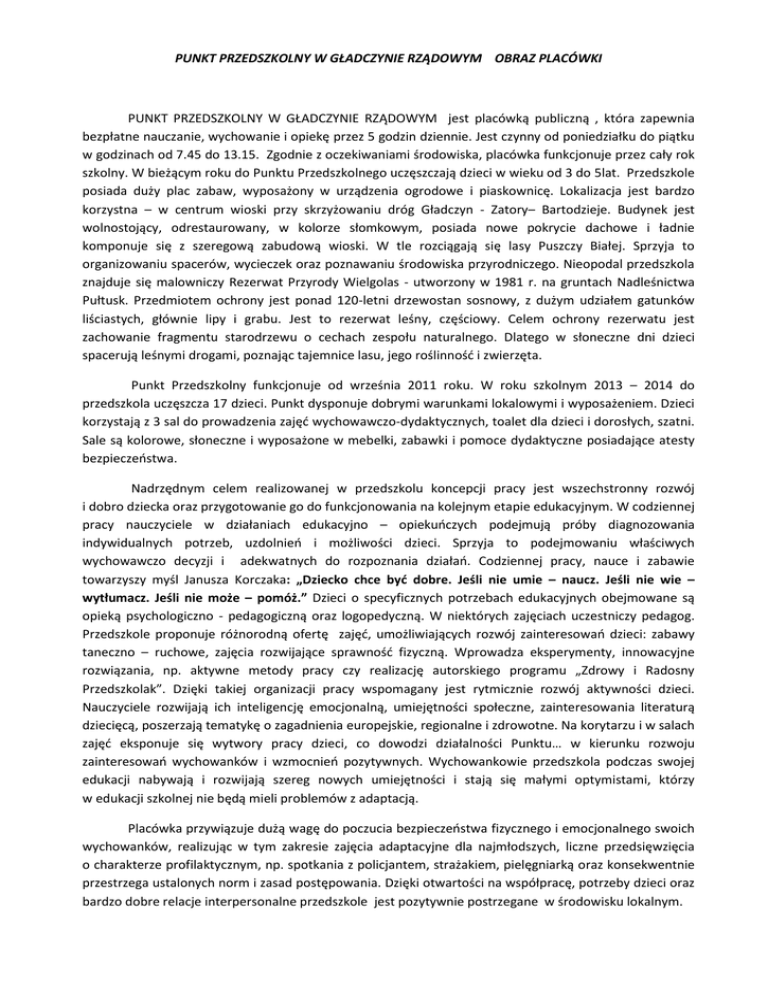 PUNKT PRZEDSZKOLNY W GŁADCZYNIE RZĄDOWYM OBRAZ PLACÓWKI PUNKT PRZEDSZKOLNY W GŁADCZYNIE RZĄDOWYM jest placówką publiczną , która zapewnia bezpłatne nauczanie, wychowanie i opiekę przez 5 godzin dziennie. Jest czynny od poniedziałku do piątku w godzinach od 7.45 do 13.15. Zgodnie z oczekiwaniami środowiska, placówka funkcjonuje przez cały rok szkolny. W bieżącym roku do Punktu Przedszkolnego uczęszczają dzieci w wieku od 3 do 5lat. Przedszkole posiada duży plac zabaw, wyposażony w urządzenia ogrodowe i piaskownicę. Lokalizacja jest bardzo korzystna – w centrum wioski przy skrzyżowaniu dróg Gładczyn - Zatory– Bartodzieje. Budynek jest wolnostojący, odrestaurowany, w kolorze słomkowym, posiada nowe pokrycie dachowe i ładnie komponuje się z szeregową zabudową wioski. W tle rozciągają się lasy Puszczy Białej. Sprzyja to organizowaniu spacerów, wycieczek oraz poznawaniu środowiska przyrodniczego. Nieopodal przedszkola znajduje się malowniczy Rezerwat Przyrody Wielgolas - utworzony w 1981 r. na gruntach Nadleśnictwa Pułtusk. Przedmiotem ochrony jest ponad 120-letni drzewostan sosnowy, z dużym udziałem gatunków liściastych, głównie lipy i grabu. Jest to rezerwat leśny, częściowy. Celem ochrony rezerwatu jest zachowanie fragmentu starodrzewu o cechach zespołu naturalnego. Dlatego w słoneczne dni dzieci spacerują leśnymi drogami, poznając tajemnice lasu, jego roślinność i zwierzęta. Punkt Przedszkolny funkcjonuje od września 2011 roku. W roku szkolnym 2013 – 2014 do przedszkola uczęszcza 17 dzieci. Punkt dysponuje dobrymi warunkami lokalowymi i wyposażeniem. Dzieci korzystają z 3 sal do prowadzenia zajęć wychowawczo-dydaktycznych, toalet dla dzieci i dorosłych, szatni. Sale są kolorowe, słoneczne i wyposażone w mebelki, zabawki i pomoce dydaktyczne posiadające atesty bezpieczeństwa. Nadrzędnym celem realizowanej w przedszkolu koncepcji pracy jest wszechstronny rozwój i dobro dziecka oraz przygotowanie go do funkcjonowania na kolejnym etapie edukacyjnym. W codziennej pracy nauczyciele w działaniach edukacyjno – opiekuńczych podejmują próby diagnozowania indywidualnych potrzeb, uzdolnień i możliwości dzieci. Sprzyja to podejmowaniu właściwych wychowawczo decyzji i adekwatnych do rozpoznania działań. Codziennej pracy, nauce i zabawie towarzyszy myśl Janusza Korczaka: „Dziecko chce być dobre. Jeśli nie umie – naucz. Jeśli nie wie – wytłumacz. Jeśli nie może – pomóż.” Dzieci o specyficznych potrzebach edukacyjnych obejmowane są opieką psychologiczno - pedagogiczną oraz logopedyczną. W niektórych zajęciach uczestniczy pedagog. Przedszkole proponuje różnorodną ofertę zajęć, umożliwiających rozwój zainteresowań dzieci: zabawy taneczno – ruchowe, zajęcia rozwijające sprawność fizyczną. Wprowadza eksperymenty, innowacyjne rozwiązania, np. aktywne metody pracy czy realizację autorskiego programu „Zdrowy i Radosny Przedszkolak”. Dzięki takiej organizacji pracy wspomagany jest rytmicznie rozwój aktywności dzieci. Nauczyciele rozwijają ich inteligencję emocjonalną, umiejętności społeczne, zainteresowania literaturą dziecięcą, poszerzają tematykę o zagadnienia europejskie, regionalne i zdrowotne. Na korytarzu i w salach zajęć eksponuje się wytwory pracy dzieci, co dowodzi działalności Punktu… w kierunku rozwoju zainteresowań wychowanków i wzmocnień pozytywnych. Wychowankowie przedszkola podczas swojej edukacji nabywają i rozwijają szereg nowych umiejętności i stają się małymi optymistami, którzy w edukacji szkolnej nie będą mieli problemów z adaptacją. Placówka przywiązuje dużą wagę do poczucia bezpieczeństwa fizycznego i emocjonalnego swoich wychowanków, realizując w tym zakresie zajęcia adaptacyjne dla najmłodszych, liczne przedsięwzięcia o charakterze profilaktycznym, np. spotkania z policjantem, strażakiem, pielęgniarką oraz konsekwentnie przestrzega ustalonych norm i zasad postępowania. Dzięki otwartości na współpracę, potrzeby dzieci oraz bardzo dobre relacje interpersonalne przedszkole jest pozytywnie postrzegane w środowisku lokalnym.