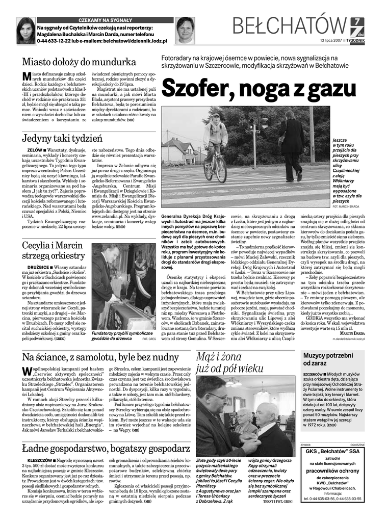 BEŁCHATÓW CZEKAMY NA SYGNAŁY Na sygnały od Czytelników czekają nasi reporterzy: Magdalena Buchalska iMarcin Darda, numer telefonu 0-44 633-12-22 lub e-mailem: [email protected] Miasto dołoży do mundurka M iasto dofinansuje zakup szkolnych mundurków dla części dzieci. Rodzic każdego z bełchatowskich uczniów podstawówek z klas I-III i przedszkolaków, którego dochód w rodzinie nie przekracza 351 zł, będzie mógł się ubiegać o taką pomoc. Wnioski wraz z zaświadczeniem o wysokości dochodów lub zaświadczeniem o korzystaniu ze świadczeń pieniężnych pomocy społecznej, rodzice powinni złożyć u dyrekcji szkoły do 19 lipca. Magistrat nie ma ustalonej puli na mundurki, a jak mówi Marta Blada, asystent prasowy prezydenta Bełchatowa, będą to porozumienia między dyrektorami a rodzicami, bo w szkołach ustalono różne kwoty na zakup mundurków. (MD) 13 lipca 2007 đ TYGODNIK Fotoradary na krajowej ósemce w powiecie, nowa sygnalizacja na skrzyżowaniu w Szczercowie, modyfikacja skrzyżowań w Bełchatowie Szofer, noga z gazu Jedyny taki tydzień ZELÓW đ Warsztaty, dyskusje, seminaria, wykłady i koncerty czekają uczestników Tygodnia Ewangelizacyjnego. To jedyna tego typu impreza w centralnej Polsce. Uczestnicy będą się uczyć klowningu, lalkarstwa i skeczbordu. Wykłady i seminaria organizowane są pod hasłem „I jak tu żyć?”. Zajęcia poprowadzą teologowie warszawskiej diecezji kościoła reformowanego i luterańskiego. Nad warsztatami będą czuwać specjaliści z Polski, Niemiec i USA. Tydzień Ewangelizacyjny rozpocznie w niedzielę, 22 lipca uroczy- ste nabożeństwo. Tego dnia odbędzie się również prezentacja warsztatów. Impreza w Zelowie odbywa się już po raz drugi z rzędu. Organizują ją wspólnie zelowskie Parafie Ewangelicko-Reformowana i Ewangelicko -Augsburska, Centrum Misji i Ewangelizacji w Dzięgielowie i Komisja ds. Misji i Ewangelizacji Diecezji Warszawskiej Kościoła Ewangelicko-Augsburskiego. Program kolejnych dni dostępny jest na stronie www.zelandia.pl. Na wykłady, dyskusje, seminaria i koncerty wstęp będzie wolny. (EMD) Cecylia i Marcin strzegą orkiestry DRUŻBICE đ Własny sztandar ma już orkiestra „Suchcice i okolice”. W kościele w Suchcicach poświęcono go i przekazano orkiestrze. Fundatorzy dokonali wcześniej symbolicznego przybijania gwoździ do drzewca sztandaru. Na sztandarze umieszczono z jednej strony wizerunek św. Cecyli, patronki muzyki, a z drugiej – św. Marcina, pierwszego patrona kościoła w Drużbicach. Po mszy odbył się recital suchcickiej orkiestry, występy młodzieży szkolnej z gminy oraz kapeli podwórkowej. (GREG) Fundatorzy przybili symboliczne FOT. GREG gwoździe do drzewca Jeszcze w tym roku przejścia dla pieszych przy skrzyżowaniu ulicy Czaplinieckiej z aleją Włókniarzy mają być wyposażone w tzw. azyle dla pieszych FOT. MARCIN DARDA Generalna Dyrekcja Dróg Krajowych i Autostrad ma jeszcze kilka innych pomysłów na poprawę bezpieczeństwa na ósemce, m.in. budowę azyli dla pieszych oraz chodników i zatok autobusowych. Wszystko ma być gotowe do końca roku, program inwestycyjny nie koliduje z planami przystosowania drogi do standardów drogi ekspresowej. Ósemkę statystycy i eksperci uznali za najbardziej niebezpieczną drogę w kraju. Na terenie powiatu bełchatowskiego trasa przebiega jednojezdniowo, dlatego usprawnień inżynieryjnych, które mają zwiększyć bezpieczeństwo, będzie tu mniej niż np. między Warszawą a Piotrkowem. Wiadomo, że w gminie Szczerców, w okolicach Dzbanek, zainstalowane zostaną dwa fotoradary, druga para stanie tuż przed Bełchatowem od strony Gomulina. W Szczer- Na ściance, z samolotu, byle bez nudny W ogólnopolskiej kampanii pod hasłem „Czerwiec aktywnych społeczności” uczestniczyła bełchatowska jednostka Związku Strzeleckiego „Strzelec”. Organizatorem kampanii jest Centrum Wspierania Aktywności Lokalnej. W ramach akcji Strzelcy przeszli kilkudniowy obóz wspinaczkowy na Jurze Krakowsko-Częstochowskiej. Szkoliło się tam ponad dwadzieścia osób, umiejętności doskonalili też instruktorzy, którzy obsługują ściankę wspinaczkową w bełchatowskiej hali „Energia”. Jak mówi Jarosław Terkalski z bełchatowskie- go Strzelca, celem kampanii jest zapewnienie młodzieży zajęcia w wolnym czasie. Przez cały czas czynna jest też świetlica środowiskowa prowadzona na terenie bełchatowskiej jednostki. Do dyspozycji, kilka razy w tygodniu, a także w soboty, jest tam m.in. stół bilardowy, piłkarzyki, stół do tenisa. Pod koniec przyszłego tygodnia bełchatowscy Strzelcy wybierają się na obóz spadochronowy na Litwę. Tam szkolili się także przed rokiem. Być może jeszcze w te wakacje uda się im również wyjechać na kolejne szkolenie – na Węgry. (MB) cowie, na skrzyżowaniu z drogą z Łasku, które jest jednym z najbardziej niebezpiecznych odcinków na ósemce w powiecie, postawiony zostanie zupełnie nowy sygnalizator świetlny. – To nadmierna prędkość kierowców powoduje najwięcej wypadków – mówi Maciej Zalewski, rzecznik łódzkiego oddziału Generalnej Dyrekcji Dróg Krajowych i Autostrad w Łodzi. – Teraz w Szczercowie nie trzeba będzie zwalniać. Kierowcy po prostu będą musieli się zatrzymywać i czekać na swą kolej. W Bełchatowie przy ulicy Lipowej, wszędzie tam, gdzie obecnie pasażerowie autobusów wysiadają na pobocze jezdni, mają powstać chodniki. Sygnalizację świetlną przy skrzyżowaniu ulic Lipowej z alei Włókniarzy i Wyszyńskiego czeka zmiana sterowników, które wydłużą cykle świateł. Z kolei na skrzyżowaniu alei Włókniarzy z ulicą Czapli- Mąż i żona już od pół wieku sób gromadzenia i odprowadzania ścieków komunalnych, a także zabezpieczenia przeciwpożarowe budynków, selektywną zbiórkę śmieci i utrzymanie terenu przed posesją, np. rowów. Zgłoszenia od właścicieli posesji przyjmowane będą do 18 lipca, wynik