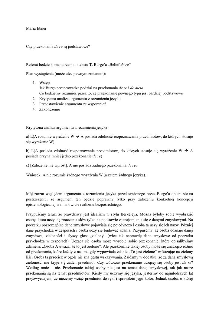Maria Ebner Czy przekonania de re są podstawowe? Referat będzie komentarzem do tekstu T. Burge’a „Belief de re” Plan wystąpienia (może ulec pewnym zmianom): 1. Wstęp Jak Burge przeprowadza podział na przekonania de re i de dicto Co będziemy rozumieć przez to, że przekonanie pewnego typu jest bardziej podstawowe 2. Krytyczna analiza argumentu z rozumienia języka 3. Przedstawienie argumentu ze wspomnień 4. Zakończenie Krytyczna analiza argumentu z rozumienia języka a) L(A rozumie wyrażenie W à A posiada zdolność rozpoznawania przedmiotów, do których stosuje się wyrażenie W) b) L(A posiada zdolność rozpoznawania przedmiotów, do których stosuje się wyrażenie W à A posiada przynajmniej jedno przekonanie de re) c) [Założenie nie wprost]: A nie posiada żadnego przekonania de re. Wniosek: A nie rozumie żadnego wyrażenia W (a zatem żadnego języka). Mój zarzut względem argumentu z rozumienia języka przedstawionego przez Burge’a opiera się na postrzeżeniu, że argument ten będzie poprawny tylko przy założeniu konkretnej koncepcji epistemologicznej, a mianowicie realizmu bezpośredniego. Przypuśćmy teraz, że prawdziwy jest idealizm w stylu Berkeleya. Można byłoby sobie wyobrazić osobę, która uczy się znaczenia słów tylko na podstawie zaznajomienia się z danymi zmysłowymi. Na początku poszczególne dane zmysłowe pojawiają się pojedynczo i osoba ta uczy się ich nazw. Później dane przychodzą w zespołach i osoba uczy się budować zdania. Przypuśćmy, że osoba doznaje danej zmysłowej zieloności i słyszy głos: „zielony” (więc tak naprawdę dane zmysłowe od początku przychodzą w zespołach). Ucząca się osoba może wyrobić sobie przekonanie, które opisalibyśmy zdaniem: „Osoba A uważa, że to jest zielone”. Ale przekonanie takiej osoby może się znacząco różnić od przekonania, które każdy z nas ma gdy wypowiada zdanie „To jest zielone” wskazując na zielony liść. Osoba ta przecież w ogóle nie zna gestu wskazywania. Załóżmy w dodatku, że za daną zmysłową zieloności nie kryje się żaden przedmiot. Czy wówczas przekonanie uczącej się osoby jest de re? Według mnie – nie. Przekonanie takiej osoby nie jest na temat danej zmysłowej, tak jak nasze przekonania są na temat przedmiotów. Kiedy my uczymy się języka, jesteśmy od najmłodszych lat przyzwyczajeni, że możemy wziąć przedmiot do ręki i sprawdzić jego kolor. Jednak osoba, o której mowa nie ma takiej możliwości; dane zmysłowe wyświetlają się tylko w jej świadomości; osoba ta żyje trochę tak, jak my śnimy. Nikt nie powiedziałby chyba, że przekonania, które mamy w snach są to przekonania de re. Przekonania tak nietypowo uczącej się osoby przypominają przekonania, które my mamy na temat własnych myśli. Mogę być na przykład przekonana, że moja poprzednia myśl dotyczyła imienin cioci Basi. Czy to jest przekonanie de re? Jakiego rodzaju przedmiotem jest myśl? Ja bym powiedziała, że to jest przekonanie de dicto. Osoba z przykładu rozumie zatem pewien język, a nie ma żadnego przekonania de re. Załóżmy teraz, że prawdziwy jest realizm pośredni. Doznajemy pewnych wrażeń i zakładamy, że wrażenia te wywoływane są przez przedmioty. Skąd mamy wiedzieć, że to co postrzegamy to same przedmioty? A jeśli doznajemy danych zmysłowych i nabywamy przekonania na temat tych danych, to te nasze przekonania są de dicto. Ktoś mógłby odpowiedzieć, że kiedy widzimy kota i mamy przekonanie, że ten kot jest czarny, nie jest to wcale przekonanie na temat zbioru danych zmysłowych, lecz na temat przedmiotu. Ale czy rzeczywiście? A jeśli słowem „kot” nazywamy po prostu zbiór danych zmysłowych, pewien typ wyglądu, nawet jeśli za tym wyglądem stoi jakiś przedmiot? Mogłabym zobaczyć kota, który wygląda jak prawdziwy kot, a jest w rzeczywistości robotem i być przekonana, że kot jest czarny. Czy moje przekonanie jest na temat przedmiotu – kota, czy na temat pewnego wyglądu – czegoś, co wygląda jak kot? Kiedy mam halucynacje i widzę obraz czarnego kota moje przekonanie, że kot jest czarny jest de dicto. Skoro docierają do mnie tylko dane zmysłowe, to wszystkie moje przekonania są de dicto. Złośliwy naukowiec z przyszłości mógłby przysłać specjalnym wehikułem czasu otrzymaną w swoim laboratorium substancję, którą nasi naukowcy uznaliby za wodę, jednak budowa tej substancji na poziomie bardzo małych elementów, które nie zostały jeszcze przez nas odkryte różniłaby się w znaczący sposób. Czy przekonanie naszego naukowca, że woda w karafce jest zimna (w karafce znajdowałaby się substancja złośliwego naukowca) byłoby na temat przedmiotu, czy na temat czegoś, co przy badaniu chemicznym i fizycznym wygląda i zachowuje się w określony sposób? Kiedy używamy wyrażeń okazjonalnych w sposób wskazujący ucząc kogoś języka, posługujemy się wyglądami, żeby wyodrębnić pewne przedmioty. Możemy na przykład nauczyć dziecko znaczenia słowa „słoń” posługując się obrazkiem. Jest to kolejny przykład, który przeczy twierdzeniu Burge’a, że każdy system poznawczy rozumiejący język musi posiadać przekonania de re.
