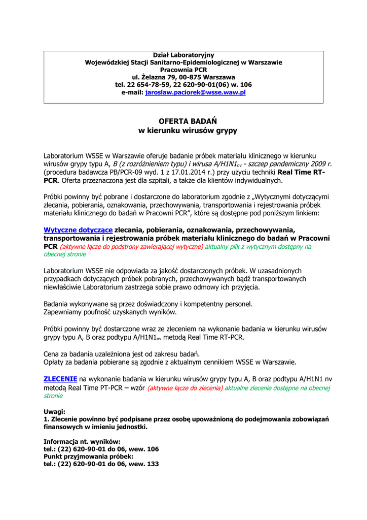 Dział Laboratoryjny Wojewódzkiej Stacji Sanitarno-Epidemiologicznej w Warszawie Pracownia PCR ul. Żelazna 79, 00-875 Warszawa tel. 22 654-78-59, 22 620-90-01(06) w. 106 e-mail: [email protected] OFERTA BADAŃ w kierunku wirusów grypy Laboratorium WSSE w Warszawie oferuje badanie próbek materiału klinicznego w kierunku wirusów grypy typu A, B (z rozróżnieniem typu) i wirusa A/H1N1nv - szczep pandemiczny 2009 r. (procedura badawcza PB/PCR-09 wyd. 1 z 17.01.2014 r.) przy użyciu techniki Real Time RTPCR. Oferta przeznaczona jest dla szpitali, a także dla klientów indywidualnych. Próbki powinny być pobrane i dostarczone do laboratorium zgodnie z „Wytycznymi dotyczącymi zlecania, pobierania, oznakowania, przechowywania, transportowania i rejestrowania próbek materiału klinicznego do badań w Pracowni PCR”, które są dostępne pod poniższym linkiem: Wytyczne dotyczące zlecania, pobierania, oznakowania, przechowywania, transportowania i rejestrowania próbek materiału klinicznego do badań w Pracowni PCR (aktywne łącze do podstrony zawierającej wytyczne) aktualny plik z wytycznym dostępny na obecnej stronie Laboratorium WSSE nie odpowiada za jakość dostarczonych próbek. W uzasadnionych przypadkach dotyczących próbek pobranych, przechowywanych bądź transportowanych niewłaściwie Laboratorium zastrzega sobie prawo odmowy ich przyjęcia. Badania wykonywane są przez doświadczony i kompetentny personel. Zapewniamy poufność uzyskanych wyników. Próbki powinny być dostarczone wraz ze zleceniem na wykonanie badania w kierunku wirusów grypy typu A, B oraz podtypu A/H1N1nv metodą Real Time RT-PCR. Cena za badania uzależniona jest od zakresu badań. Opłaty za badania pobierane są zgodnie z aktualnym cennikiem WSSE w Warszawie. ZLECENIE na wykonanie badania w kierunku wirusów grypy typu A, B oraz podtypu A/H1N1 nv metodą Real Time PT-PCR – wzór (aktywne łącze do zlecenia) aktualne zlecenie dostępne na obecnej stronie Uwagi: 1. Zlecenie powinno być podpisane przez osobę upoważnioną do podejmowania zobowiązań finansowych w imieniu jednostki. Informacja nt. wyników: tel.: (22) 620-90-01 do 06, wew. 106 Punkt przyjmowania próbek: tel.: (22) 620-90-01 do 06, wew. 133
