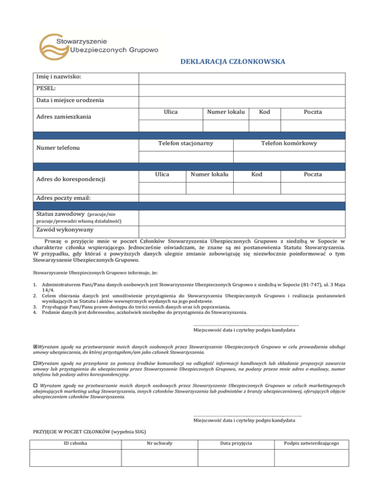 deklaracja członkowska - Stowarzyszenie Ubezpieczonych Grupowo