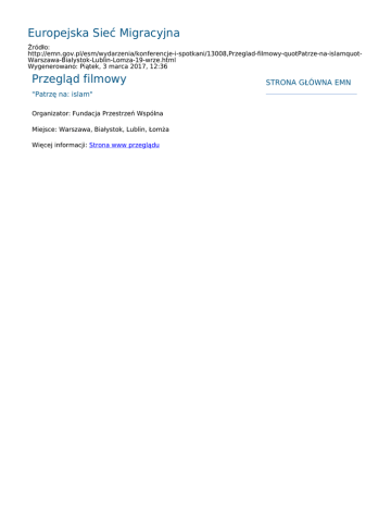 Europejska Sieć Migracyjna Źródło: http://emn.gov.pl/esm/wydarzenia/konferencje-i-spotkani/13008,Przeglad-filmowy-quotPatrze-na-islamquotWarszawa-Bialystok-Lublin-Lomza-19-wrze.html Wygenerowano: Piątek, 3 marca 2017, 12:36 Przegląd filmowy "Patrzę na: islam" Organizator: Fundacja Przestrzeń Wspólna Miejsce: Warszawa, Białystok, Lublin, Łomża Więcej informacji: Strona www przeglądu STRONA GŁÓWNA EMN