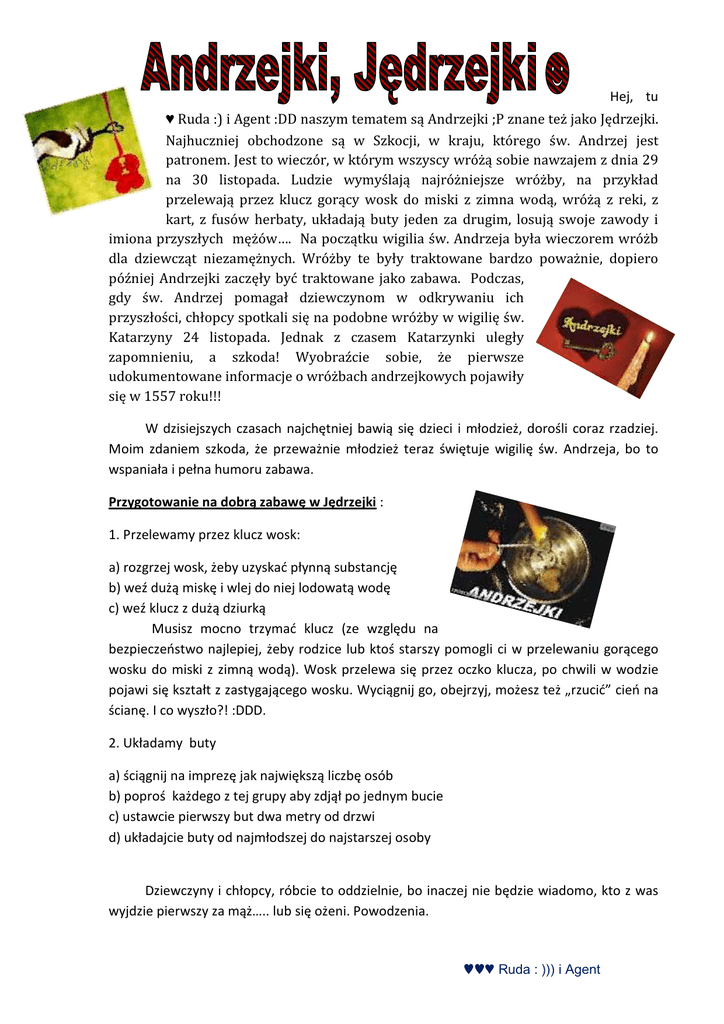 Hej, tu ♥ Ruda :) i Agent :DD naszym tematem są Andrzejki ;P znane też jako Jędrzejki. Najhuczniej obchodzone są w Szkocji, w kraju, którego św. Andrzej jest patronem. Jest to wieczór, w którym wszyscy wróżą sobie nawzajem z dnia 29 na 30 listopada. Ludzie wymyślają najróżniejsze wróżby, na przykład przelewają przez klucz gorący wosk do miski z zimna wodą, wróżą z reki, z kart, z fusów herbaty, układają buty jeden za drugim, losują swoje zawody i imiona przyszłych mężów…. Na początku wigilia św. Andrzeja była wieczorem wróżb dla dziewcząt niezamężnych. Wróżby te były traktowane bardzo poważnie, dopiero później Andrzejki zaczęły być traktowane jako zabawa. Podczas, gdy św. Andrzej pomagał dziewczynom w odkrywaniu ich przyszłości, chłopcy spotkali się na podobne wróżby w wigilię św. Katarzyny 24 listopada. Jednak z czasem Katarzynki uległy zapomnieniu, a szkoda! Wyobraźcie sobie, że pierwsze udokumentowane informacje o wróżbach andrzejkowych pojawiły się w 1557 roku!!! W dzisiejszych czasach najchętniej bawią się dzieci i młodzież, dorośli coraz rzadziej. Moim zdaniem szkoda, że przeważnie młodzież teraz świętuje wigilię św. Andrzeja, bo to wspaniała i pełna humoru zabawa. Przygotowanie na dobrą zabawę w Jędrzejki : 1. Przelewamy przez klucz wosk: a) rozgrzej wosk, żeby uzyskać płynną substancję b) weź dużą miskę i wlej do niej lodowatą wodę c) weź klucz z dużą dziurką Musisz mocno trzymać klucz (ze względu na bezpieczeństwo najlepiej, żeby rodzice lub ktoś starszy pomogli ci w przelewaniu gorącego wosku do miski z zimną wodą). Wosk przelewa się przez oczko klucza, po chwili w wodzie pojawi się kształt z zastygającego wosku. Wyciągnij go, obejrzyj, możesz też „rzucić” cień na ścianę. I co wyszło?! :DDD. 2. Układamy buty a) ściągnij na imprezę jak największą liczbę osób b) poproś każdego z tej grupy aby zdjął po jednym bucie c) ustawcie pierwszy but dwa metry od drzwi d) układajcie buty od najmłodszej do najstarszej osoby Dziewczyny i chłopcy, róbcie to oddzielnie, bo inaczej nie będzie wiadomo, kto z was wyjdzie pierwszy za mąż….. lub się ożeni. Powodzenia. ♥♥♥ Ruda : ))) i Agent