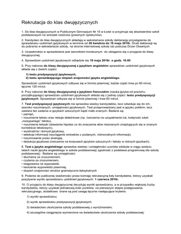 Rekrutacja do klas dwujęzycznych 1. Do klas dwujęzycznych w Publicznym Gimnazjum Nr 15 w Łodzi w przyjmuje się absolwentów szkół podstawowych na wniosek rodziców (prawnych opiekunów). 2. Kandydaci do klas dwujęzycznych składają w sekretariacie szkoły deklarację przystąpienia do sprawdzianu uzdolnień językowych w terminie od 26 kwietnia do 16 maja 2016r. Druki deklaracji są do pobrania w sekretariacie szkoły, na stronie internetowej szkoły lub podczas Drzwi Otwartych. 3. Uczestnictwo w sprawdzianie jest warunkiem koniecznym do ubiegania się o przyjęcie do klasy dwujęzycznej. 4. Sprawdzian uzdolnień językowych odbędzie się 18 maja 2016r. o godz. 16.00 5. Przy naborze do klasy dwujęzycznej z językiem angielskim sprawdzian uzdolnień językowych składa się z dwóch części: 1) testu predyspozycji językowych, 2) testu sprawdzającego stopień znajomości języka angielskiego. Sprawdzian uzdolnień językowych odbywa się w formie pisemnej, każda część trwa po 60 minut, łącznie 120 minut. 6. Przy naborze do klasy dwujęzycznej z językiem francuskim (nauka języka od poziomu początkującego) sprawdzian uzdolnień językowych składa się z jednej części: testu predyspozycji językowych. Sprawdzian odbywa się w formie pisemnej i trwa 60 minut. 7. Test predyspozycji językowych nie sprawdza wiedzy kandydatów, lecz odwołuje się do ich, szeroko rozumianych, umiejętności językowych. Test przeprowadzany jest w języku polskim, lecz zawiera też zadania w językach sztucznych bądź mało znanych. Badane są: • pamięć, • rozumienie tekstu oraz relacje składniowe (np. ćwiczenia na uzupełnianie luk, kolejność zdań „rozsypanego” tekstu), • rozumienie leksyki (stawianie hipotez co do znaczenia słów nieznanych znajdujących się w znanym kontekście tekstowym), • wyobraźnia i domysł językowy, • selekcja informacji (wyciąganie wniosków z podanych, różnorodnych informacji), • rozumowanie przez analogię, • dedukcja językowa (ćwiczenia na korpusach języków sztucznych i teksty w różnych językach). 8. Test z języka angielskiego sprawdza wiedzę i umiejętności uczniów zdobyte w ciągu sześciu latach nauki języka angielskiego w szkole podstawowej( zgodność z podstawa programową dla szkoły podstawowej). Badane są umiejętności: • słuchania ze zrozumieniem, • czytania ze zrozumieniem, • reagowania na wypowiedź, • tworzenia wypowiedzi pisemnej, • stopień znajomości struktur gramatyczno-leksykalnych 9. Podanie do publicznej wiadomości przez komisję rekrutacyjną listy kandydatów, którzy uzyskali pozytywne wyniki sprawdzianu uzdolnień językowych: 1 czerwca 2016r. 10. O przyjęciu do klasy dwujęzycznej decydują wyniki sprawdzianu, a w przypadku większej liczby kandydatów, którzy uzyskali jednakową ilość punktów, na pierwszym etapie postępowania rekrutacyjnego, dodatkowo brane są pod uwagę łącznie następujące kryteria: 1) wyniki sprawdzianu; 2) wynik sprawdzianu predyspozycji językowych; 3) świadectwo ukończenia szkoły podstawowej z wyróżnieniem; 4) szczególne osiągnięcia wymienione na świadectwie ukończenia szkoły podstawowej: a) uzyskanie wysokiego miejsca nagrodzonego lub uhonorowanego zwycięskim tytułem w zawodach wiedzy, artystycznych i sportowych, organizowanych przez kuratora oświaty albo organizowanych co najmniej na szczeblu powiatowym przez inne podmioty działające na terenie szkoły, z wyjątkiem tytułu laureata konkursu przedmiotowego o zasięgu wojewódzkim lub ponadwojewódzkim, b) osiągnięcia w zakresie aktywności społecznej, w tym na rzecz środowiska szkolnego, w szczególności w formie wolontariatu. 11. W przypadku równorzędnych wyników uzyskanych na pierwszym etapie postępowania rekrutacyjnego, na drugim etapie postępowania rekrutacyjnego są brane pod uwagę łącznie kryteria konstytucyjne: 1) wielodzietność rodziny kandydata; 2) niepełnosprawność kandydata; 3) niepełnosprawność jednego z rodziców kandydata; 4) niepełnosprawność obojga rodziców kandydata; 5) niepełnosprawność rodzeństwa kandydata; 6) samotne wychowywanie kandydata w rodzinie; 7) objęcie kandydata pieczą zastępczą. 12. Laureaci ogólnopolskich olimpiad przedmiotowych oraz laureaci konkursów przedmiotowych o zasięgu co najmniej wojewódzkim, przyjmowani są do gimnazjum w pierwszej kolejności. 13. Złożenie wniosku o przyjecie do gimnazjum ( w przypadku prowadzenia naboru elektronicznego wniosek składa się tylko do szkoły pierwszego wyboru) wraz z dokumentami potwierdzającymi spełnienie przez kandydata warunków lub kryteriów rekrutacyjnych): od 1 do 22 czerwca 2016r. do godz. 12.00 14. Uzupełnienie wniosku o przyjęcie do gimnazjum o kopię świadectwa ukończenia szkoły podstawowej oraz zaświadczenie o wynikach sprawdzianu: od 24 do 28 czerwca 2016r. godz.12.00 15 .Weryfikacja przez komisję rekrutacyjną wniosków o przyjęcie do gimnazjum i dokumentów potwierdzających spełnianie przez kandydata warunków lub kryteriów branych pod uwagę w postępowaniu rekrutacyjnym: od 29 czerwca do 1 lipca 2016r. 16. Podanie do publicznej wiadomości przez komisję rekrutacyjną listy kandydatów zakwalifikowanych i kandydatów niezakwalifikowanych: 6 lipca 2016r. do godz. 12.00. 17. Potwierdzenie przez rodzica kandydata woli przyjęcia w postaci przedłożenia oryginału świadectwa ukończenia szkoły podstawowej i oryginału zaświadczenia o wynikach sprawdzianu, o ile nie zostały one złożone w uzupełnieniu wniosku o przyjęcie do gimnazjum: 6 lipca od godz. 12.00 do do 8 lipca 2016r. do godz. 12.00. 18. Podanie do publicznej wiadomości przez komisję rekrutacyjną listy kandydatów przyjętych i kandydatów nieprzyjętych: 11 lipca 2016r. do godz. 12.00.