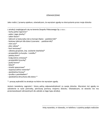 OŚWIADCZENIE Jako rodzic / prawny opiekun, oświadczam, że wyrażam zgodę na skorzystanie przez moje dziecko ……………………………………………………………………………………………………………………………………………………….. z atrakcji znajdujących się na terenie Zespołu Pałacowego Sp. z o.o. : - lochy pełne tajemnic* - pałac i jego skarby* - safari bizon* - labirynt w kukurydzy lub w konopi (lipiec - październik)* - bukowy labirynt dla dzieci (czerwiec - październik)* - mini zoo* - plac zabaw* - kort tenisowy* - zabawy grupowe, (np. szukanie skarbów)* - przejażdżki na kucyku i osiołku* - pokazy koni* - kulig (okres zimowy)* - przejażdżki bryczką* - jazdy konne* - bilard* - ścieżki spacerowe* - wypożyczalnia rowerów* - zjeżdżalnia linowa* - tyrolka z paintballem* - zjeżdżalnia dmuchana dla dzieci * *- proszę wykreślić te atrakcje na które nie wyrażam zgody. Jestem świadomy zagrożeń i biorę pełną odpowiedzialność za swoje dziecko. Wyrażam też zgodę na udzielenie w razie potrzeby, pierwszej pomocy mojemu dziecku. Oświadczam, że dziecko nie ma przeciwwskazań zdrowotnych do udziału w tego typu atrakcji. …………………………………………………………………………………………………….. Imię nazwisko, nr dowodu, nr telefonu i czytelny podpis rodziców