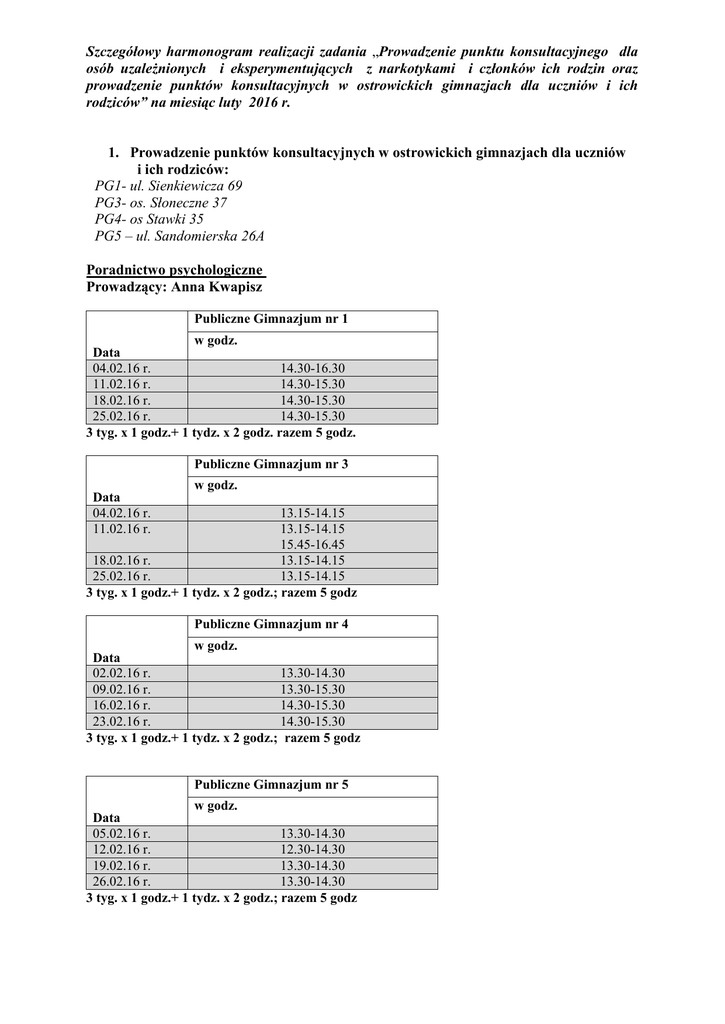 Szczegółowy harmonogram realizacji zadania „Prowadzenie punktu konsultacyjnego dla osób uzależnionych i eksperymentujących z narkotykami i członków ich rodzin oraz prowadzenie punktów konsultacyjnych w ostrowickich gimnazjach dla uczniów i ich rodziców” na miesiąc luty 2016 r. 1. Prowadzenie punktów konsultacyjnych w ostrowickich gimnazjach dla uczniów i ich rodziców: PG1- ul. Sienkiewicza 69 PG3- os. Słoneczne 37 PG4- os Stawki 35 PG5 – ul. Sandomierska 26A Poradnictwo psychologiczne Prowadzący: Anna Kwapisz Publiczne Gimnazjum nr 1 w godz. Data 04.02.16 r. 14.30-16.30 11.02.16 r. 14.30-15.30 18.02.16 r. 14.30-15.30 25.02.16 r. 14.30-15.30 3 tyg. x 1 godz.+ 1 tydz. x 2 godz. razem 5 godz. Publiczne Gimnazjum nr 3 w godz. Data 04.02.16 r. 11.02.16 r. 13.15-14.15 13.15-14.15 15.45-16.45 18.02.16 r. 13.15-14.15 25.02.16 r. 13.15-14.15 3 tyg. x 1 godz.+ 1 tydz. x 2 godz.; razem 5 godz Publiczne Gimnazjum nr 4 w godz. Data 02.02.16 r. 13.30-14.30 09.02.16 r. 13.30-15.30 16.02.16 r. 14.30-15.30 23.02.16 r. 14.30-15.30 3 tyg. x 1 godz.+ 1 tydz. x 2 godz.; razem 5 godz Publiczne Gimnazjum nr 5 w godz. Data 05.02.16 r. 13.30-14.30 12.02.16 r. 12.30-14.30 19.02.16 r. 13.30-14.30 26.02.16 r. 13.30-14.30 3 tyg. x 1 godz.+ 1 tydz. x 2 godz.; razem 5 godz Poradnictwo terapeutyczne Prowadzenie : Katarzyna Sobczyk Publiczne Gimnazjum nr 1 w godz. Data 01.02.16 r. 08.02.16 r. 15.02.16 r. 22.02.16 r. 4 tyg. x 1 godz.; razem 4 godz. 13.30-14.30 13.30-14.30 13.30-14.30 13.30-14.30 Publiczne Gimnazjum nr 3 w godz. Data 04.02.16 r. 11.02.16 r. 18.02.16 r. 25.02.16 r. 4 tyg. x 1 godz.; razem 4 godz. 13.30-14.30 13.30-14.30 13.30-14.30 13.30-14.30 Publiczne Gimnazjum nr 4 w godz. Data 02.02.16 r. 09.02.16 r. 16.02.16 r. 23.02.16 r. 4 tyg. x 1 godz.; razem 4 godz. 13.30-14.30 13.30-14.30 13.30-14.30 13.30-14.30 Publiczne Gimnazjum nr 5 w godz. Data 03.02.16 r. 12.02.16 r. 19.02.16 r. 26.02.16 r. 4 tyg. x 1 godz.; razem 4 godz. 13.30-14.30 12.30-13.30 13.30-14.30 13.30-14.30 2. Prowadzenie punktu konsultacyjnego dla osób uzależnionych i eksperymentujących z narkotykami ul. Sienkiewicza 70, 27-400 Ostrowiec Św. Konsultacje terapeutyczne: Prowadzący: Katarzyna Sobczyk, Łukasz Niewczas 2,9,16,23 lutego 2016 r.; godz. 16.15-20.15; Konsultacje psychologiczne: Prowadzący: Anna Kwapisz 3,10 lutego 2016 r.; godz. 16.00-19.00.