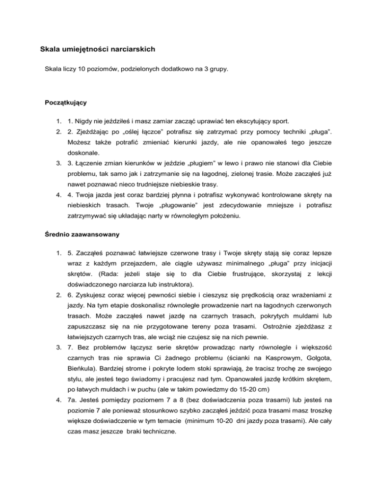 Skala umiejętności narciarskich Skala liczy 10 poziomów, podzielonych dodatkowo na 3 grupy. Początkujący 1. 1. Nigdy nie jeździłeś i masz zamiar zacząć uprawiać ten ekscytujący sport. 2. 2. Zjeżdżając po „oślej łączce” potrafisz się zatrzymać przy pomocy techniki „pługa”. Możesz także potrafić zmieniać kierunki jazdy, ale nie opanowałeś tego jeszcze doskonale. 3. 3. Łączenie zmian kierunków w jeździe „pługiem” w lewo i prawo nie stanowi dla Ciebie problemu, tak samo jak i zatrzymanie się na łagodnej, zielonej trasie. Może zacząłeś już nawet poznawać nieco trudniejsze niebieskie trasy. 4. 4. Twoja jazda jest coraz bardziej płynna i potrafisz wykonywać kontrolowane skręty na niebieskich trasach. Twoje „pługowanie” jest zdecydowanie mniejsze i potrafisz zatrzymywać się układając narty w równoległym położeniu. Średnio zaawansowany 1. 5. Zacząłeś poznawać łatwiejsze czerwone trasy i Twoje skręty stają się coraz lepsze wraz z każdym przejazdem, ale ciągle używasz minimalnego „pługa” przy inicjacji skrętów. (Rada: jeżeli staje się to dla Ciebie frustrujące, skorzystaj z lekcji doświadczonego narciarza lub instruktora). 2. 6. Zyskujesz coraz więcej pewności siebie i cieszysz się prędkością oraz wrażeniami z jazdy. Na tym etapie doskonalisz równoległe prowadzenie nart na łagodnych czerwonych trasach. Może zacząłeś nawet jazdę na czarnych trasach, pokrytych muldami lub zapuszczasz się na nie przygotowane tereny poza trasami. Ostrożnie zjeżdżasz z łatwiejszych czarnych tras, ale wciąż nie czujesz się na nich pewnie. 3. 7. Bez problemów łączysz serie skrętów prowadząc narty równolegle i większość czarnych tras nie sprawia Ci żadnego problemu (ścianki na Kasprowym, Golgota, Bieńkula). Bardziej strome i pokryte lodem stoki sprawiają, że tracisz trochę ze swojego stylu, ale jesteś tego świadomy i pracujesz nad tym. Opanowałeś jazdę krótkim skrętem, po łatwych muldach i w puchu (ale w takim powiedzmy do 15-20 cm) 4. 7a. Jesteś pomiędzy poziomem 7 a 8 (bez doświadczenia poza trasami) lub jesteś na poziomie 7 ale ponieważ stosunkowo szybko zacząłeś jeździć poza trasami masz troszkę większe doświadczenie w tym temacie (minimum 10-20 dni jazdy poza trasami). Ale cały czas masz jeszcze braki techniczne. Zaawansowany 1. 8. Potrafisz jeździć po wszystkich przygotowanych trasach w dobrym stylu i z dobrą techniką. Opanowałeś stromizny, muldy i zlodowaciałe odcinki, nie tracąc nic ze swojego stylu, Potrafisz bez problemów łączyć krótkie i długie skręty, dostosowywać styl jazdy do warunków terenowych. Jeździsz poprawnie, szybko, ze stylem, w każdych warunkach. No, prawie . Jeździsz w miarę swobodnie w puchu do 70 cm. Uwaga! Jeżeli nie jeździłeś poza trasami to ponieważ masz bardzo dobra technikę twoja jazda po za trasami z dnia na dzień będzie lepsza. Pamiętaj tylko o zmianie nart. Będzie łatwiej Na początku więcej będzie nauki (i upadków) niż jazdy, nie poddawaj się, zajmie Ci to trochę czasu, ale warto! 2. 9. Jazda poza trasami już nie jest walką, a Ty potrafisz wykonywać i cieszyć się wszystkimi rodzajami skrętów na wszelkich trasach. Na tym etapie możesz rozważyć profesjonalne lekcje na przykład w celu doskonalenia jazdy poza trasami, poprawy jazdy i techniki podczas zawodów czy też zostania instruktorem. 3. 10. Jesteś doskonałym narciarzem który potrafi jeździć wszędzie i w każdych warunkach. I robisz to wspaniale stylowo i technicznie. Może szkolisz instruktorów narciarskich lub jesteś byłym zawodnikiem? Warto poprosić jakiegoś znajomego o sfilmowanie naszej jazdy w rożnych warunkach. Zdarza się, ze nasza samoocena zmienia się radykalnie po obejrzeniu takiego filmu. Tekst na podstawie: - skali umiejętności opracowanej przez Administratora SkiForum.PL - uwag Tytusa_Atomicusa