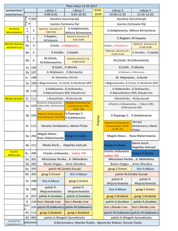 Karolina Mierzejewska Monika Duchan -wolontariusz Joanna Zastawna Ryl A.Gołębiewska, Rytmi ka -Kornel i a B. 9:00-9:30 Milena Brimoniene przed B p. A Ang Ang B A zastepstwa/ klasa/sala wolontariusz 404 Plan Lekcji 21.01.2017 10:30 Lekcja 1 Lekcja 2 10:50 9:00-9:45 9:45-10:30 Karolina Karczmarzyk 2 0a 3 A.Kula , A.Miądowicz 0b 5 K.Smułka , S.Sajdak 0b 6 1 E.Bogdan, M.Szyputa M.Zietek, M.Dobrowolska Joanna Zastawna Ryl A.Gołębiewska, Milena Brimoniene Rytmi ka -Kornel i a B. 9:30-10:00 E.Bogdan, M.Szyputa A.Kula , A.Miądowicz Rytmi ka -Kornel i a B. 11:00-11:30 Rytmi ka -Kornel i a B. 10:00-10:30 K.Smułka , S.Sajdak 1a 106 B.Galik , D.Miarka B.Galik , D.Miarka 1b 107 A.Wójtowicz , D.Berowska A.Wójtowicz , D.Berowska 1c 108 W. Majewska, A.Kurek W. Majewska , A.Kurek J.Boguszewska, A.Cecot, A.Herdman SEN A.Radkowska , D.Serkowska , K.Mazurkiewicz SEN, Klaudia Jez I.Brzezińska , M.Szczesiak I.Brzezińska , M.Szczesiak 3a 103 A.Pereira, A.Skowrońska , Rytmi ka B.Drzewi ecki , I.Sikora SEN , M.Wrześniak A.Czechows ka 9:45SEN 10:15, 101 A.Pereira, A.Skowrońska , I.Sikora SEN , M.Wrześniak SEN 3b 104 Rytmi ka B.Drzewi ecki , A.Czechows ka 9:15-9:45 Beata Serwin 2c 111 K.Ropenga S , K.Golebiewska 3c 112 Renata Demkiewicz, Marta Pilska 4a 204 Magda Mazur , Religia D.Dadia Roza Małachowska 4b 212 Marta Kocik , Angelika Galczak 4c 206 Dorota Jaśkowska , Judyta Hill 5a 201 5b 202 Miroslawa Pestka , A. Mehedintu 6a 203 polski M.Zareba Kuszyk Beata Drygas , Anna Waraksa Przerwa A.Radkowska , D.Serkowska , K.Mazurkiewicz SEN, Klaudia Jez 2b 110 K.Ropenga S , K.Golebiewska Rytmi ka B.Drzewi ecki , A.Czechows ka 10:5011:20, 101 Renata Demkiewicz, Marta Pilska Magda Mazur , Roza Małachowska Religia D.Dadia Marta Kocik , Angelika Galczak Dorota Jaśkowska , Religia D.Dadia Judyta Hill Miroslawa Pestka , A. Mehedintu Beata Drygas , Anna Waraksa geog E.Ernest hist A.Mazur 6b 205 geog E.Ernest hist A.Mazur 7a 208 hist A.Mazur geog E.Ernest polski R. Wojciechowska polski R. Wojciechowska 7b 209 polski R. Wojciechowska polski R. Wojciechowska hist A.Mazur geog E.Ernest polski A.Zerebiec geog S.Stodolak geog S.Stodolak polski A.Zerebiec polski A.Zerebiec 8 207 polski A.Zerebiec 9 210 hist J.Renda Line GCS E hist J.Renda Line 105 polski M.Sobkowicz polski M.Sobkowicz AS 113 A2 403 na ucza ni e i ndywi dua l ne Rytmi ka -Kornel i a B. 11:30-12:00 M.Zietek, M.Dobrowolska 2a 109 J.Boguszewska , A.Cecot, A.Herdman SEN Kamila Mielcarek Lekcja 3 Lekcja 4 10:50-11:35 11:35-12:20 Karolina Karczmarzyk biblioteka geog S.Stodolak geog S.Stodolak polski A.Weigelt Garwolinska polski M.Zareba Kuszyk hist J.Renda Line hist J.Renda Line polski M.Sobkowicz polski M.Sobkowicz polski A.Weigelt Garwolinska A.Bejnarowicz, Monika Rodak , Agnieszka Babiak, Danuta Dadia