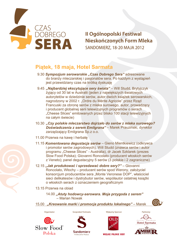 Piątek, 18 maja, Hotel Sarmata 9.30 Sympozjum serowarskie „Czas Dobrego Sera” adresowane do branży mleczarskiej i pasjonatów sera. Po każdym z wystąpień jest przewidziany czas na krótką dyskusję 9.45 „Najbardziej ekscytujące sery świata” – Will Studd, Brytyjczyk żyjący od 30 lat w Australii (jeden z największych światowych autorytetów w dziedzinie serów, autor dwóch książek serowarskich, nagrodzony w 2002 r. „Ordre du Mérite Agricole” przez Rząd Francuski za obronę serów z mleka surowego, autor, prowadzący i producent globalnej serii telewizyjnych programów o serach „Cheese Slices” emitowanych przez blisko 100 stacji telewizyjnych na całym świecie) 10.30 „Czy polskie mleczarstwo dojrzało do serów z mleka surowego? Doświadczenia z serem Emilgrana” – Marek Prauziński, dyrektor zarządzający Emilgrana Sp.z o.o. 11.00 Przerwa na kawę i herbatę 11.15 Komentowana degustacja serów – Gieno Mientkiewicz (odkrywca i promotor serów zagrodowych), Will Studd (znawca serów i autor programu „Cheese Slices” - Australia), dr Jacek Szklarek (prezes Slow Food Polska); Giovanni Roncolato (producent włoskich serów z Veneto); panel degustacyjny 5 serów (3 polskie i 2 zagraniczne) 12.15 „Jak produkować i sprzedawać dobre sery?” – Giovanni Roncolato, Włochy – producent serów spod Werony, założyciel konsorcjum producentów sera „Monte Veronese DOP”, właściciel sieci delikatesów i dystrybutor serów, współautor ostatniej książki o włoskich serach z oznaczeniem geograficznym 13.15 Przerwa na obiad 14.00 „Atuty hodowcy-serowara. Moja przygoda z serem” – Marian Nowak 15.00 „Kreowanie marki i promocja produktu lokalnego” – Marek Sztark, promotor produktów lokalnych, w przeszłości dyrektor Opery Zachodniopomorskiej, dyrektor Szczecin 2016 Europejska Stolica Kultury oraz Jarosław Pająkowski, dyrektor „Festiwalu Smaku” w Grucznie, twórca marek powideł śliwkowych z Dolnej Wisły, współautor publikacji i propagator starych odmian drzew owocowych 15.45 „Najczęstsze wady serów i jak ich uniknąć” – Wojciech Styś, główny serowar SM Spomlek 16.30 Wyprawa w grupach na zwiedzanie z przewodnikiem urokliwego Sandomierza 14.00 Równolegle z popołudniową sesją sympozjalną rusza profesjonalna ocena serów zgłoszonych do konkursu na Najlepszy Polski Ser Grand Prix 2012 roku przez międzynarodowe jury (Will Studd – Australia – Przewodniczący Jury, Giovanni Roncolato – Włochy, Anna Wrońska – redaktor naczelna magazynu „Kuchnia”, Adam Chrząstowski – wybitny szef kuchni i restaurator, szef Polskiej Prezydencji, Gieno Mientkiewicz – promotor serów zagrodowych w Polsce, Edward Bajko – Prezes SM Spomlek, dr Jacek Szklarek – Prezes Slow Food Polska,) 20.00 Uroczyste ogłoszenie laureatów konkursu na Najlepszy Polski Ser Grand Prix 2012 r. i wręczenie dyplomów – Przewodniczący Jury, Burmistrz Sandomierza oraz Prezes Slow Food Polska 20.30 Gala Dinner w restauracji Sarmata ze specjalnym menu na bazie świętokrzyskich produktów regionalnych i slowfoodowych, specjalnie dobranymi polskimi i włoskimi winami, niefiltrowanym i niepasteryzowanym piwem „Żywe” z Browaru Amber oraz deską serów Sobota, 19maja, Rynek Starego Miasta 10.00 Oficjalne otwarcie festiwalu „Czas Dobrego Sera” przez Burmistrza Sandomierza Jerzego Borowskiego oraz Prezesa Slow Food Polska Jacka Szklarka – od tej godziny rusza degustacja i sprzedaż serów na festiwalowych stoiskach – otwarcie dużego stoiska z polskimi winami pod patronatem „Magazynu Wino” – w trakcie festiwalu trwa głosowanie publiczności na najlepszy ser – degustacja niepasteryzowanych piw z Browaru Amber oraz win rekomendowanych przez przewodnik „Slow Wine” – co dwie godziny w jednej z sal w Klubie Lapidarium (podziemia sandomierskiego Ratusza) odbywają się „Laboratoria Smaku” z serami w roli głównej pod dyrekcją Giena Mientkiewicza – co dwie godziny projekcja różnych odcinków filmów ”Cheese Slices” Willa Studd’a (przy współpracy z „Kuchnia +”) oraz filmów z nowej serii Giena Mientkiewicza – Kino Starówka – „Bursztynowa Serownia” – wyjątkowe miejsce, w którym specjaliści z różnych dziedzin serowarstwa służyć będą radą oraz prezentować będą sprzęt oraz różnorodne materiały do produkcji serów - stoisko pod patronatem firmy „Spomlek” z Radzynia Podlaskiego) – kraina niekończących się zabaw oraz konkursów dla dzieci – bulwary nadwiślańskie i nowy port wiślany – zagroda z żywymi zwierzętami dającymi mleko (krowy, kozy, owce; różne rasy – bulwary nadwiślańskie) – pokazy wytwarzania prawdziwego oscypka – bacówka Wojtka Komperdy – „Bursztynowa Serownia” 19.00 Zamknięcie stoisk 20.00 Rozpoczęcie „Potańcówki” pod gołym niebem i przy muzyce na żywo zespołu „Blaf” – legenda czeskiej sceny blueagrassowej. Skrzypce, banjo, gitara, bębny i bas - zwariowana taneczna pełna humoru i poezji muzyka. Pochodzą ze Śląska Cieszyńskiego, a śpiewają po czesku i "po naszemu", czyli w języku którym posługują się mieszkańcy Góralii, krainy zwanej w Polsce Zaolziem. Nogi będą was boleć od tańca, a brzuchy od śmiechu; www.blaf.cz – bulwary nadwiślańskie Niedziela, 20 maja 10.00 Otwarcie stoisk z degustacją i sprzedażą serów i wina (program jak w sobotę) 11.00 Pokazy wytwarzania twarogu oraz masła – „Bursztynowa Serownia” 12.30 Rozstrzygnięcie konkursu publiczności i wręczenie nagród 13.30 Spotkanie członków Slow Food Polska z prezydentem i założycielem ruchu Slow Food – Carlo Petrinim (Zamek w Sandomierzu) 17.00 Zakończenie festiwalu