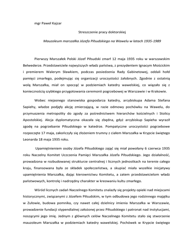 mgr Paweł Kajzar Streszczenie pracy doktorskiej Mauzoleum marszałka Józefa Piłsudskiego na Wawelu w latach 1935-1989 Pierwszy Marszałek Polski Józef Piłsudski zmarł 12 maja 1935 roku w warszawskim Belwederze. Przedstawiciele najwyższych władz państwa, z prezydentem Ignacym Mościckim i premierem Walerym Sławkiem, podczas posiedzenia Rady Gabinetowej, oddali hołd pamięci zmarłego, podejmując się organizacji uroczystości żałobnych. Zgodnie z ostatnią wolą Marszałka, miał on spocząć w podziemiach katedry wawelskiej, co wiązało się z koniecznością szybkiego przygotowania ceremonii pogrzebowej w Warszawie i w Krakowie. Wobec niejasnego stanowiska gospodarza katedry, arcybiskupa Adama Stefana Sapiehy, władze podjęły akcję zmierzającą, w razie odmowy pochówku na Wawelu, do przymuszenia metropolity do zgody za pośrednictwem hierarchów kościelnych i Stolicy Apostolskiej. Akcja dyplomatyczna okazała się zbędna, gdyż arcybiskup Sapieha wyraził zgodę na pogrzebanie Piłsudskiego w katedrze. Pompatyczne uroczystości pogrzebowe rozpoczęte 17 maja, zakończyły się złożeniem trumny z ciałem Marszałka w Krypcie świętego Leonarda 18 maja 1935 roku. Upamiętnieniem osoby Józefa Piłsudskiego zająć się miał powołany 6 czerwca 1935 roku Naczelny Komitet Uczczenia Pamięci Marszałka Józefa Piłsudskiego. Jego działalność, prowadzona w rozbudowanej strukturze centralnej i licznych jednostkach na terenie całego kraju, finansowana była ze składek społeczeństwa, a skupiać miała wszelkie inicjatywy upamiętnienia Marszałka, dając kierownictwu Komitetu, a zatem przedstawicielom władz państwowych, kontrolę i nadrzędny charakter w kreowaniu kultu zmarłego. Wśród licznych zadań Naczelnego Komitetu znalazły się projekty opieki nad miejscami historycznymi, związanymi z Józefem Piłsudskim, w tym odbudowa jego rodzinnego majątku w Zułowie, budowa pomnika, czy nawet całej dzielnicy imienia Marszałka w Warszawie, prowadzenie fundacji stypendialnej założonej przez Piłsudskiego i patronat nad instytucjami, noszącymi jego imię. Jednym z głównych celów Naczelnego Komitetu stało się stworzenie mauzoleum Marszałka w podziemiach katedry wawelskiej. Pochówek w Krypcie świętego Leonarda od początku traktowano tymczasowy. Zarówno forma grobu, jak i stan krypty wymagały szybkiego podjęcia prac przy budowie ostatecznego miejsca spoczynku Naczelnika Państwa. Po przejrzeniu różnych lokalizacji w obrębie katedry, zdecydowano o budowie mauzoleum w krypcie pod Wieżą Srebrnych Dzwonów. Miejsce to, zaakceptowane przez władze kościelne, dawało możliwość stworzenia sanktuarium, będącego scenerią dla hołdu składanego przez cały Naród osobie Marszałka. Głównym projektantem, a później kierownikiem robót budowalnych w Krypcie, został prof. Adolf Szyszko-Bohusz. Stworzył on na zlecenie Naczelnego Komitetu koncepcję adaptacji i rozbudowy romańskiej krypty, dążąc do wyeksponowania historycznego charakteru miejsca i przystosowania go do funkcji sanktuarium Marszałka. Liczne zmiany koncepcji i brak ich aprobaty ze strony władz kościelnych spowodowały opóźnienie w budowie krypty. Kompromisową akceptację uzyskał dopiero szósty wariant projektu, którego realizację rozpoczęto w lutym 1936 roku, a zakończono w marcu 1937 roku. Po ukończeniu prac Naczelny Komitet wytknął prof. Szyszko-Bohuszowi przeprowadzenie części robót bez zgody Komitetu, odmawiając ich przyjęcia. Oskarżono kierownika budowy o chęć umniejszenia czci dla Marszałka, czy nawet zmowę z władzami kościelnymi, w celu ograniczenia wpływu Naczelnego Komitetu na budowę i funkcjonowanie mauzoleum. Ostatecznie akceptacja i odbiór prac w krypcie miał miejsce dopiero 31 maja 1939 roku. W międzyczasie, na polecenie arcybiskupa Sapiehy, do ukończonej krypty przeniesiono 23 czerwca 1937 roku trumnę z ciałem Piłsudskiego. Brak zgody na przeniesienie ze strony Naczelnego Komitetu i władz państwowych doprowadził do eskalacji oskarżeń, na forum politycznym i za pośrednictwem prasy, względem arcybiskupa Sapiehy. Konflikt, zwany wawelskim, załagodził sam metropolita, oficjalnie przepraszając władze za nieuszanowanie ich woli i wyjaśniając motywy swojej decyzji. Od czasu pochówku, wpierw w Krypcie świętego Leonarda, następnie w Krypcie pod Wieżą Srebrnych Dzwonów, przy grobie Piłsudskiego gromadzili się liczni przedstawiciele władz krajowych, delegacje zagraniczne, członkowie organizacji wojskowych, cywilnych i młodzieżowych, pragnący oddać hołd Marszałkowi. Masowe nawiedzanie grobu Piłsudskiego miało charakter ogólnonarodowy, a zakończone zostało przez wybuch II wojny światowej. W czasie okupacji hitlerowskiej wzgórze wawelskie i znajdująca się na nim katedra stały się niedostępne dla Polaków. Krypta Piłsudskiego, na co dzień zamknięta, była okazjonalnie udostępniania odwiedzającym Kraków niemieckim dygnitarzom, chcącym zobaczyć grób Marszałka, którego szacunkiem darzył nawet Hitler. Po zakończeniu okupacji, mimo otwarcia Wawelu i katedry, krypta Piłsudskiego pozostała zamknięta. Nowe komunistyczne władze, dążąc do umniejszenia zasług Marszałka i powolnego wymazania go z narodowej pamięci, nie zgadzały się na udostępnienie miejsca jego kultu. Zmiana sytuacji nastała po 1956 roku. Na fali politycznej odwilży i rozluźnienia polityki historycznej udało się otworzyć kryptę Piłsudskiego dla publiczności. Było to możliwe dzięki staraniom byłych legionistów, wśród których szczególnie aktywnie działali major Józef Herzog i generał Mieczysław Boruta-Spiechowicz. Z ich inicjatywy uporządkowano wnętrze i uzupełniono jego wyposażenie w szereg tablic i pomników, upamiętniających Marszałka i jego żołnierzy. Działalność ta zwróciła uwagę władz, które licznymi przesłuchaniami i rewizjami usiłowały zdobyć dowody na „antypolską dział