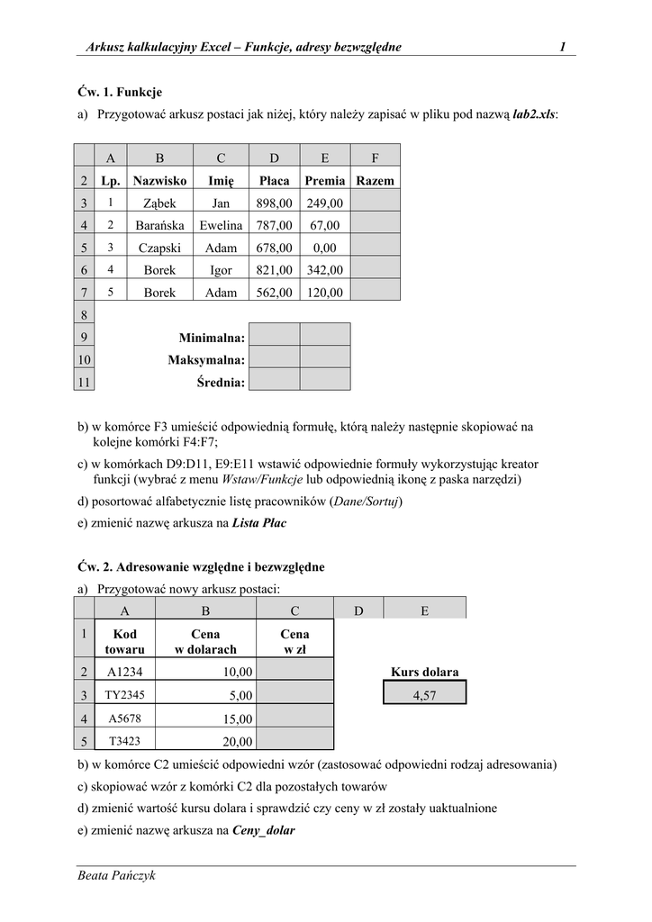 Arkusz kalkulacyjny Excel – Funkcje, adresy bezwzględne 1 Ćw. 1. Funkcje a) Przygotować arkusz postaci jak niżej, który należy zapisać w pliku pod nazwą lab2.xls: A 2 B Lp. Nazwisko C D E Imię Płaca Premia Razem 3 1 Ząbek Jan 898,00 249,00 4 2 Barańska Ewelina 787,00 67,00 5 3 Czapski Adam 678,00 0,00 6 4 Borek Igor 821,00 342,00 7 5 Borek Adam 562,00 120,00 F 8 9 Minimalna: 10 Maksymalna: 11 Średnia: b) w komórce F3 umieścić odpowiednią formułę, którą należy następnie skopiować na kolejne komórki F4:F7; c) w komórkach D9:D11, E9:E11 wstawić odpowiednie formuły wykorzystując kreator funkcji (wybrać z menu Wstaw/Funkcje lub odpowiednią ikonę z paska narzędzi) d) posortować alfabetycznie listę pracowników (Dane/Sortuj) e) zmienić nazwę arkusza na Lista Płac Ćw. 2. Adresowanie względne i bezwzględne a) Przygotować nowy arkusz postaci: A B C D E 1 Kod towaru Cena w dolarach Cena w zł 2 A1234 10,00 Kurs dolara 3 TY2345 5,00 4,57 4 A5678 15,00 5 T3423 20,00 b) w komórce C2 umieścić odpowiedni wzór (zastosować odpowiedni rodzaj adresowania) c) skopiować wzór z komórki C2 dla pozostałych towarów d) zmienić wartość kursu dolara i sprawdzić czy ceny w zł zostały uaktualnione e) zmienić nazwę arkusza na Ceny_dolar Beata Pańczyk Arkusz kalkulacyjny Excel – Funkcje, adresy bezwzględne 2 Ćw. 3. Adresowanie względne i bezwzględne a) Przygotować arkusz postaci: A B C D E F G 1 Regionalne ceny skupu pszenicy 2 Katowice Lublin Olsztyn Poznań Szczecin Warszawa Cena za 1 tonę w PLN 3 183,66 155,83 176,74 168,95 172,45 170,39 4 Odchylenie ceny w regionie od średniej ceny krajowej b) w komórce B5 umieścić wzór na odchylenie postaci: =ŚREDNIA($B$3:$G$3)-B3 c) skopiować wzór do kolejnych pięciu komórek wiersza 5 i sprawdzić poprawność kopiowanych wzorów Ćw. 4. Adresowanie mieszane a) Przygotować arkusz postaci: A 1 B C D E F G Tabliczka mnożenia 2 5 3 5 4 6 6 7 8 9 10 7 8 9 10 b) w komórce B3 umieścić wzór, który po skopiowaniu do pozostałych komórek tabeli da tabliczkę mnożenia (zastosować adresowanie mieszane). Beata Pańczyk