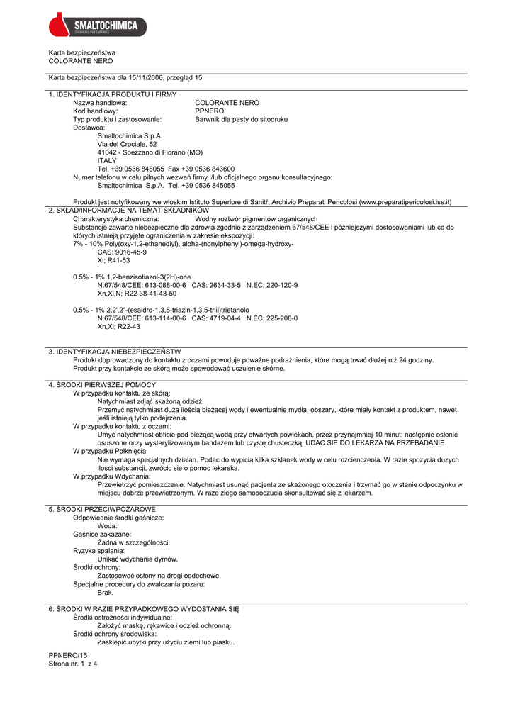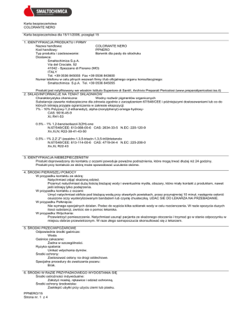 Karta bezpieczeñstwa COLORANTE NERO Karta bezpieczeñstwa dla 15/11/2006, przegl±d 15 1. IDENTYFIKACJA PRODUKTU I FIRMY Nazwa handlowa: COLORANTE NERO Kod handlowy: PPNERO Typ produktu i zastosowanie: Barwnik dla pasty do sitodruku Dostawca: Smaltochimica S.p.A. Via del Crociale, 52 41042 - Spezzano di Fiorano (MO) ITALY Tel. +39 0536 845055 Fax +39 0536 843600 Numer telefonu w celu pilnych wezwañ firmy i/lub oficjalnego organu konsultacyjnego: Smaltochimica S.p.A. Tel. +39 0536 845055 Produkt jest notyfikowany we wloskim Istituto Superiore di Sanità, Archivio Preparati Pericolosi (www.preparatipericolosi.iss.it) 2. SK£AD/INFORMACJE NA TEMAT SK£ADNIKÓW Charakterystyka chemiczna: Wodny roztwór pigmentów organicznych Substancje zawarte niebezpieczne dla zdrowia zgodnie z zarz±dzeniem 67/548/CEE i pó¿niejszymi dostosowaniami lub co do których istniej± przyjête ograniczenia w zakresie ekspozycji: 7% - 10% Poly(oxy-1,2-ethanediyl), alpha-(nonylphenyl)-omega-hydroxyCAS: 9016-45-9 Xi; R41-53 0.5% - 1% 1,2-benzisotiazol-3(2H)-one N.67/548/CEE: 613-088-00-6 CAS: 2634-33-5 N.EC: 220-120-9 Xn,Xi,N; R22-38-41-43-50 0.5% - 1% 2,2',2"-(esaidro-1,3,5-triazin-1,3,5-triil)trietanolo N.67/548/CEE: 613-114-00-6 CAS: 4719-04-4 N.EC: 225-208-0 Xn,Xi; R22-43 3. IDENTYFIKACJA NIEBEZPIECZEÑSTW Produkt doprowadzony do kontaktu z oczami powoduje powa¿ne podra¿nienia, które mog± trwaæ d³u¿ej ni¿ 24 godziny. Produkt przy kontakcie ze skór± mo¿e spowodowaæ uczulenie skórne. 4. ¦RODKI PIERWSZEJ POMOCY W przypadku kontaktu ze skór±: Natychmiast zdj±æ ska¿on± odzie¿. Przemyæ natychmiast du¿± ilo¶ci± bie¿±cej wody i ewentualnie myd³a, obszary, które mia³y kontakt z produktem, nawet je¶li istniej± tylko podejrzenia. W przypadku kontaktu z oczami: Umyæ natychmiast obficie pod bie¿±c± wod± przy otwartych powiekach, przez przynajmniej 10 minut; nastêpnie os³oniæ osuszone oczy wysterylizowanym banda¿em lub czystê chusteczk±. UDAC SIE DO LEKARZA NA PRZEBADANIE. W przypadku Po³kniêcia: Nie wymaga specjalnych dzialan. Podac do wypicia kilka szklanek wody w celu rozcienczenia. W razie spozycia duzych ilosci substancji, zwrócic sie o pomoc lekarska. W przypadku Wdychania: Przewietrzyæ pomieszczenie. Natychmiast usun±æ pacjenta ze ska¿onego otoczenia i trzymaæ go w stanie odpoczynku w miejscu dobrze przewietrzonym. W raze z³ego samopoczucia skonsultowaæ siê z lekarzem. 5. ¦RODKI PRZECIWPO¯AROWE Odpowiednie ¶rodki ga¶nicze: Woda. Ga¶nice zakazane: ¯adna w szczególno¶ci. Ryzyka spalania: Unikaæ wdychania dymów. ¦rodki ochrony: Zastosowaæ os³ony na drogi oddechowe. Specjalne procedury do zwalczania pozaru: Brak. 6. ¦RODKI W RAZIE PRZYPADKOWEGO WYDOSTANIA SIÊ ¦rodki ostro¿no¶ci indywidualne: Za³o¿yæ maskê, rêkawice i odzie¿ ochronn±. ¦rodki ochrony ¶rodowiska: Zasklepiæ ubytki przy u¿yciu ziemi lub piasku. PPNERO/15 Strona nr. 1 z 4 Karta bezpieczeñstwa COLORANTE NERO Je¶li produkt jest rozpuszczony w sp³ywie wodnym, sieci kanalizacyjnej lub skazi³ pod³o¿e terenowe lub ro¶linno¶æ, powiadomiæ o tym kompetente w³adze. Metody oczyszczania: Szybko zebraæ produkt po za³o¿eniu maski i odzie¿y ochronnej. Po zebraniu, umyæ wod± zainteresowan± strefê i materia³y. 7. MANIPULACJA I MAGAZYNOWANIE ¦rodki ostro¿no¶ci przy manipulowaniu: Podczas pracy nie je¶æ ani nie piæ. W miare mozliwosci unikac bezposredniego kontaktu z produktem. Ograniczenie narazenia patrz rozdzial 8. Materia³y niekompatybilne: ¯aden w szczególno¶ci. Zobacz równie¿ nastêpny paragraf 10. Warunki sk³adowania: Produkt przechowywac w oryginalnych opakowaniach, zawsze szczelnie zamknietych. Wskazówka dla pomieszczeñ: Pomieszczenia odpowiednio przewietrzone. 8. KONTROLA EKSPOZYCJI/ OCHRONY INDYWIDUALNEJ ¦rodki ostro¿no¶ci: Zapewnic odpowiednia wentylacje pomieszczen, w których jest produkt przechowywany lub poddawany manipulacji, aby utrzymac poziom narazenia ponizej wartosci granicznej. Ochrona dróg oddechowych: Nie wymaga sie przy normalnym zastosowaniu. W specyficznych sytuacjach przy pracy (przyklad: mycie, konserwacja), przy których istnieje mozliwosc nadmiernego narazenia, stosowac maski lub pól-maski do ochrony przed pylem, lub wyposazone w filtr chroniacy przed parami organicznymi, w zaleznosci od charakteru produktu. Z odniesieniem do przepisów UNI EN 149 (pyly), oraz UNI EN 371 (pary organiczne). Ochrona r±k: Uzywac nieprzemakalne rekawice (przyklad: PCV, neopren, guma). Zywotnosc materialu tworzacego strukture zalezy od czestotliwosci i czasu trwania narazenia. Z odniesieniem do przepisów UNI EN 374-1, 374-2, 374-3. Ochrona oczu: Nie wymaga sie przy normalnym zastosowaniu. W razie operacji, które moglyby prowadzic do przypadkowego kontaktu z oczami, uzywac okulary lub maske ochronna. Z odniesieniem do przepisów UNI EN 166. Ochrona skóry: Przy normalnym zastosowaniu nie wymaga specjalnych zabezpieczen. Ograniczenia ekspozycji zawartych substancji: Zaden Graniczne wartosci narazenia dla zawartych substancji (Zal. VIII dekretu legislacyjnego 626/94): Graniczne wartosci narazenia (Wytyczna 2000/39/WE): Zadna Kontrola narazenia srodowiska. Urzadzenia wentylacyjne powinny byc wyposazone w odpowiedni system filtrujacy substancje zanieczyszczajace, uniemozliwiajac ich emisje do srodowiska, zgodnie z ustaleniami zawartymi w DPR 203/88). Woda, zawierajaca produkt lub jego resztki, musi byc zebrana. Nie wolno jej odprowadzac do kanalizacji lub wodociagów bez uprzedniej zgody, w mysl odnosnej normy (dekret legislacyjny 152/99). 9. W£ASCIWO¦CI FIZYCZNE I CHEMICZNE Aspekt i kolor: pasta nera Zapach: bez zapachu pH: 7.5 OK Temperatura topnienia: brak danych Temperatura wrzenia: >100°C Temperatura zapalania: >100°C W³a¶ciwo¶ci wybuchowe: niewybuchowy W³a¶ciwo¶ci wspó³paliwowe: nie utleniajacy Ci¶nienie pary: brak danych Rozpuszczalno¶æ w wodzie: rozpuszczalny Wspóczynnik rozk³adu (n-oktanol/woda) : brak danych Gêsto¶æ o
