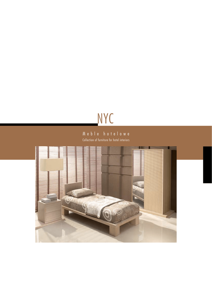 NYC Meble hotelowe Collection of furniture for hotel interiors M e b l e S T Y L > h o t e l o w e AMBASADOR I 2 3 AMBASADOR I M e b l e E L E G A N h o t e l o w e C J AMBASADOR I A > 4 5 Szafa 2D/Wardrobe 2D 1750 x 1000 x 550 120 kg/1.100 m3 K O Pomocnik na bagaże/Auxiliary table 400 x 1000 x 600 27 kg/0.280 m3 M F O R T Biurko/Writing desk 750 x 1400 x 700 71 kg/0.895 m3 > Wymiary w katalogu podane zostały w milimetrach, w kolejności: wysokość/szerokość/głębokość. All dimensions in the catalogue are given in milimetres, in the following order: height/width/depth. Kredens 2D2S/Case 2D2Dr 1200 x 1200 x 350 105 kg/0.600 m3 Komoda 6S/Chest of drawers 6Dr 900 x 900 x 350 71 kg/0.320 m3 Szafka nocna 2S/Bedside cabinet 2Dr Podest/Floor panel 460 x 460 x 350 52 x 1800 x 600 19 kg/0.088 m3 23 kg/0.120 m3 > Wykończenie / wybarwienie: > Finishing / colour: Łóżko 1 os./Single bed 800 x 1010 x 2010 60 kg/0.147 m3 naturalna okleina dąb w kolorze dąb bielony naturalna okleina czereśnia w kolorze naturalnym natural oak veneer, whitened oak tint natural cherry veneer, natural tint 6 7 Waga mebli została podana w kilogramach, objętość w m3. Weight of furniture is given in kilograms, volume in cubic metres.