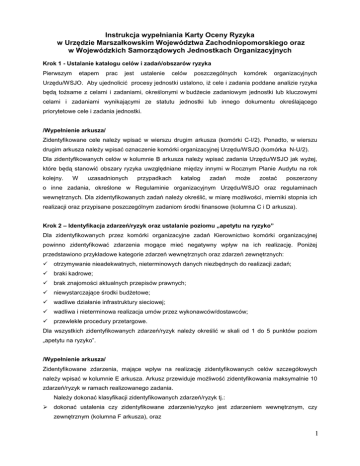 Instrukcja wypełniania Karty Oceny Ryzyka w Urzędzie Marszałkowskim Województwa Zachodniopomorskiego oraz w Wojewódzkich Samorządowych Jednostkach Organizacyjnych Krok 1 - Ustalanie katalogu celów i zadań/obszarów ryzyka Pierwszym etapem prac jest ustalenie celów poszczególnych komórek organizacyjnych Urzędu/WSJO. Aby ujednolicić procesy jednostki ustalono, iż cele i zadania poddane analizie ryzyka będą tożsame z celami i zadaniami, określonymi w budżecie zadaniowym jednostki lub kluczowymi celami i zadaniami wynikającymi ze statutu jednostki lub innego dokumentu określającego priorytetowe cele i zadania jednostki. /Wypełnienie arkusza/ Zidentyfikowane cele należy wpisać w wierszu drugim arkusza (komórki C-I/2). Ponadto, w wierszu drugim arkusza należy wpisać oznaczenie komórki organizacyjnej Urzędu/WSJO (komórka N-U/2). Dla zidentyfikowanych celów w kolumnie B arkusza należy wpisać zadania Urzędu/WSJO jak wyżej, które będą stanowić obszary ryzyka uwzględniane między innymi w Rocznym Planie Audytu na rok kolejny. W uzasadnionych przypadkach katalog zadań może zostać poszerzony o inne zadania, określone w Regulaminie organizacyjnym Urzędu/WSJO oraz regulaminach wewnętrznych. Dla zidentyfikowanych zadań należy określić, w miarę możliwości, mierniki stopnia ich realizacji oraz przypisane poszczególnym zadaniom środki finansowe (kolumna C i D arkusza). Krok 2 – Identyfikacja zdarzeń/ryzyk oraz ustalanie poziomu „apetytu na ryzyko” Dla zidentyfikowanych przez komórki organizacyjne zadań Kierownictwo komórki organizacyjnej powinno zidentyfikować zdarzenia mogące mieć negatywny wpływ na ich realizację. Poniżej przedstawiono przykładowe kategorie zdarzeń wewnętrznych oraz zdarzeń zewnętrznych: otrzymywanie nieadekwatnych, nieterminowych danych niezbędnych do realizacji zadań; braki kadrowe; brak znajomości aktualnych przepisów prawnych; niewystarczające środki budżetowe; wadliwe działanie infrastruktury sieciowej; wadliwa i nieterminowa realizacja umów przez wykonawców/dostawców; przewlekłe procedury przetargowe. Dla wszystkich zidentyfikowanych zdarzeń/ryzyk należy określić w skali od 1 do 5 punktów poziom „apetytu na ryzyko”. /Wypełnienie arkusza/ Zidentyfikowane zdarzenia, mające wpływ na realizację zidentyfikowanych celów szczegółowych należy wpisać w kolumnie E arkusza. Arkusz przewiduje możliwość zidentyfikowania maksymalnie 10 zdarzeń/ryzyk w ramach realizowanego zadania. Należy dokonać klasyfikacji zidentyfikowanych zdarzeń/ryzyk tj.: dokonać ustalenia czy zidentyfikowane zdarzenie/ryzyko jest zdarzeniem wewnętrznym, czy zewnętrznym (kolumna F arkusza), oraz 1 dokonać ustalenia kategorii zdarzenia/ryzyka, wg. podziału określonego w kolumnie G arkusza. Dla zidentyfikowanych zdarzeń należy ustalić poziom akceptowalnego „apetytu na ryzyko”, obrazującego poziom ryzyka, jaki komórki organizacyjne oraz Kierownik jednostki są gotowe podjąć przy realizacji zadań, służących realizacji celów jednostki. Poziom „apetytu na ryzyko” powinien zostać określony dla każdego zdefiniowanego zdarzenia (kolumna N arkusza). Z uwagi na specyfikę funkcjonowania jednostek samorządowych w określonych ramach prawnych, nie powinno przyjmować się „apetytu na ryzyko” na poziomie wyższym niż 1-2 pkt., chyba, że są to zadania własne nie wynikające obligatoryjnie z przepisów prawa. Określone przez Kierowników komórek organizacyjnych poziomy „apetytu na ryzyko”, w dalszym etapie prac podlegać będą weryfikacji Kierownika jednostki. /Wypełnienie arkusza/ Określone poziomy „apetytu na ryzyko” (APR) dla zidentyfikowanych zadań, wyrażone w wartości punktowej w skali od 1 do 5 punktów należy wpisać w kolumnie N arkusza. Krok 3 – Ocena zidentyfikowanych zdarzeń na poziomie ryzyka inherentnego i rezydualnego. Określenie skuteczności mechanizmów kontrolnych. W celu ustalenia stopnia wpływu zdarzeń na cele i zadania należy dokonać oceny zdarzeń pod kątem prawdopodobieństwa ich wystąpienia oraz potencjalnych skutków ich negatywnych następstw. Skala oceny prawdopodobieństwa zawiera się w przedziale liczb naturalnych od 1 do 5 punktów, gdzie: 1 - oznacza przedział prawdopodobieństwa wystąpienia zdarzenia/ryzyka od 0% do 20%; 2 - oznacza przedział prawdopodobieństwa wystąpienia zdarzenia/ryzyka od 21% do 40%; 3 - oznacza przedział prawdopodobieństwa wystąpienia zdarzenia/ryzyka od 41% do 60%; 4 - oznacza przedział prawdopodobieństwa wystąpienia zdarzenia/ryzyka od 61% do 80%; 5 - oznacza przedział prawdopodobieństwa wystąpienia zdarzenia/ryzyka od 81% do 100%. Skala oceny skutków następstw zdarzeń zawiera się w przedziale liczb naturalnych od 1 do 5 punktów, gdzie: 1 – oznacza minimalny, negatywny skutek; 2 – oznacza niewielki skutek; 3 – oznacza średni skutek; 4 – oznacza poważny skutek; 5 – oznacza bardzo poważny skutek. Szablon arkusza umożliwia ocenę maksymalnie 10 zdarzeń/ryzyk w ramach realizowanego zadania. /Wypełnienie arkusza/ Oszacowane prawdopodobieństwo wystąpienia zidentyfikowanego zdarzenia należy wpisać w kolumnie H arkusza. W kolumnie I należy wpisać przewidywane skutki zidentyfikowanych zdarzeń. W kolumnie J przedstawiony zostanie wynik multiplikacji prawdopodobieństwa oraz skutku zdarzenia/ryzyka dla ryzyka inherentnego. 2 W kolumnie K arkusza należy przedstawić istniejące mechanizmy kontrolne wdrożone w jednostce, służące realizacji celów Urzędu/WSJO. W kolumnie L arkusza należy dokonać oceny skuteczności funkcjonujących w jednostce mechanizmów kontrolnych, w skali od 1 do 25 punktów, gdzie: 1 – oznacza bardzo słaba skuteczność mechanizmów kontrolnych, oraz 25 – oznacza bardzo dużą skuteczność mechanizmów kontrolnych. /Wypełnienie arkusza/ Zdefiniowane mechanizmy kontrolne należy wpisać w kolumnie K arkusza. W kolumnie L arkusza należy dokona