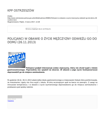 KPP OSTRZESZÓW Źródło: http://www.ostrzeszow.policja.gov.pl/w18/aktualnosci/90804,Policjanci-w-obawie-o-zycie-mezczyzny-odwiezli-go-do-domu-26 112013.html Wygenerowano: Piątek, 3 marca 2017, 12:28 Strona znajduje się w archiwum. POLICJANCI W OBAWIE O ŻYCIE MĘŻCZYZNY ODWIEŹLI GO DO DOMU (26.11.2013) Policjanci podjęli interwencje wobec mężczyzny, który nie chciał wyjść z lokalu gastronomicznego. Poprzednią noc spędził na dworze. W obawie o jego życie funkcjonariusze doprowadzili go do miejsca zamieszkania. Po godzinie 18 dn. 26.11.2013 właścicielka lokalu gastronomicznego w miejscowości Kobyla Góra poinformowała, że mieszkaniec Ligoty nie chce wyjść z lokalu. W dniu wczorajszym spał na ławce na zewnątrz. Z uwagi na minusowe temperatury i w obawie o życie wymienionego doprowadzono go do miejsca zamieszkania i przekazano pod opiekę rodzinie. Ocena: 0/5 (0) Tweetnij