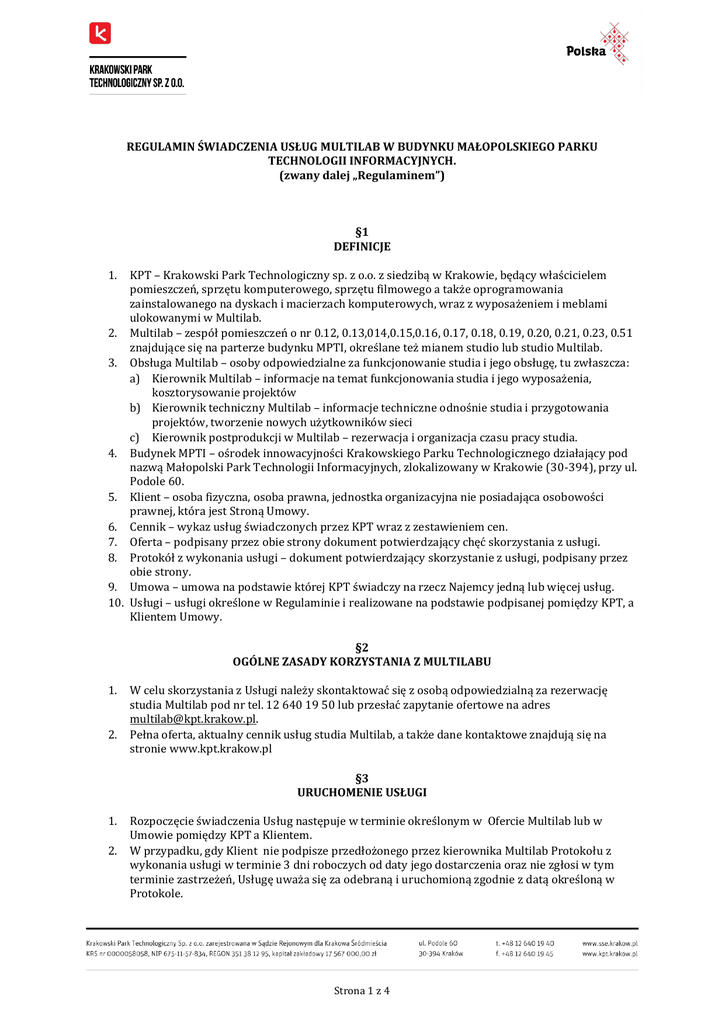 REGULAMIN ŚWIADCZENIA USŁUG MULTILAB W BUDYNKU MAŁOPOLSKIEGO PARKU TECHNOLOGII INFORMACYJNYCH. (zwany dalej „Regulaminem”) §1 DEFINICJE 1. KPT – Krakowski Park Technologiczny sp. z o.o. z siedzibą w Krakowie, będący właścicielem pomieszczeń, sprzętu komputerowego, sprzętu filmowego a także oprogramowania zainstalowanego na dyskach i macierzach komputerowych, wraz z wyposażeniem i meblami ulokowanymi w Multilab. 2. Multilab – zespół pomieszczeń o nr 0.12, 0.13,014,0.15,0.16, 0.17, 0.18, 0.19, 0.20, 0.21, 0.23, 0.51 znajdujące się na parterze budynku MPTI, określane też mianem studio lub studio Multilab. 3. Obsługa Multilab – osoby odpowiedzialne za funkcjonowanie studia i jego obsługę, tu zwłaszcza: a) Kierownik Multilab – informacje na temat funkcjonowania studia i jego wyposażenia, kosztorysowanie projektów b) Kierownik techniczny Multilab – informacje techniczne odnośnie studia i przygotowania projektów, tworzenie nowych użytkowników sieci c) Kierownik postprodukcji w Multilab – rezerwacja i organizacja czasu pracy studia. 4. Budynek MPTI – ośrodek innowacyjności Krakowskiego Parku Technologicznego działający pod nazwą Małopolski Park Technologii Informacyjnych, zlokalizowany w Krakowie (30-394), przy ul. Podole 60. 5. Klient – osoba fizyczna, osoba prawna, jednostka organizacyjna nie posiadająca osobowości prawnej, która jest Stroną Umowy. 6. Cennik – wykaz usług świadczonych przez KPT wraz z zestawieniem cen. 7. Oferta – podpisany przez obie strony dokument potwierdzający chęć skorzystania z usługi. 8. Protokół z wykonania usługi – dokument potwierdzający skorzystanie z usługi, podpisany przez obie strony. 9. Umowa – umowa na podstawie której KPT świadczy na rzecz Najemcy jedną lub więcej usług. 10. Usługi – usługi określone w Regulaminie i realizowane na podstawie podpisanej pomiędzy KPT, a Klientem Umowy. §2 OGÓLNE ZASADY KORZYSTANIA Z MULTILABU 1. 2. W celu skorzystania z Usługi należy skontaktować się z osobą odpowiedzialną za rezerwację studia Multilab pod nr tel. 12 640 19 50 lub przesłać zapytanie ofertowe na adres [email protected]. Pełna oferta, aktualny cennik usług studia Multilab, a także dane kontaktowe znajdują się na stronie www.kpt.krakow.pl §3 URUCHOMENIE USŁUGI 1. 2. Rozpoczęcie świadczenia Usług następuje w terminie określonym w Ofercie Multilab lub w Umowie pomiędzy KPT a Klientem. W przypadku, gdy Klient nie podpisze przedłożonego przez kierownika Multilab Protokołu z wykonania usługi w terminie 3 dni roboczych od daty jego dostarczenia oraz nie zgłosi w tym terminie zastrzeżeń, Usługę uważa się za odebraną i uruchomioną zgodnie z datą określoną w Protokole. Strona 1 z 4 §4 ZASADY KORZYSTANIA I UŻYTKOWANIA MULTILAB 1. Poruszanie się po Multilabie: a) Każda osoba korzystająca z usług Multilabu otrzymuje kartę dostępową do pomieszczenia z którego korzysta, a także indywidualne dane dostępowe do sieci komputerowej Multilab. b) Przed opuszczeniem Budynku MPTI osoby korzystające są zobowiązane do pozostawienia karty dostępowej na recepcji Multilab lub na recepcji Budynku MPTI (po godzinach pracy recepcji Multilab). c) Każdy materiał wprowadzany na macierze studia Multilab i na dyski poszczególnych stacji roboczych musi przejść weryfikacje na stanowisku I/O i z tego stanowiska jest wprowadzany na macierze studia. Osoba korzystająca dostaje informacje o miejscu ulokowania projektu i sposobie poruszania się po sieci Multilab. d) Każdy użytkownik po opuszczeniu stanowiska pracy jest zobowiązany do przekazania stanowiska pracy w stanie w jakim je przejął. 2. Bezwzględnie zabrania się: a) Wprowadzania danych do sieci komputerowej Multilab bez zgody Kierownika Technicznego Multilab. b) Instalowania i odinstalowywania oprogramowania, wtyczek, pluginów, aplikacji bez zgody Kierownika Technicznego Multilab. c) Wprowadzania osób postronnych bez zgody Kierownika Multilab. d)Wynoszenia, wypożyczania sprzętu komputerowego, oprogramowania i innego wyposażenia studia poza teren Multilab bez zgody Kierownika Multilab. e)Spożywania posiłków poza miejscami do tego przeznaczonymi. f)Podłączania do sieci Multilabu urządzeń komputerowych bez właściwego oprogramowania antywirusowego. g)Pobierania nielegalnego oprogramowania na własne urządzenia komputerowe poprzez sieć Multilab. 3. Sprzęt wynajmowany przez Klienta powinien być przez niego ubezpieczony od ryzyka kradzieży i innych zdarzeń losowych. 1. §5 POMOC TECHNICZNA Wszelkie nieprawidłowość w funkcjonowaniu Usług, w tym w szczególności Awarie, Klient niezwłocznie zgłasza Pracownikowi Multilab z wykorzystaniem danych kontaktowych określonych w Umowie. §6 CZAS TRWANIA UMOWY, ZAWIESZENIE ŚWIADCZENIA USŁUG 1. 2. 3. Umowy zawierane są przez Strony na czas określony. Czas trwania Umowy określony jest w Umowie lub w karcie oferty. KPT przysługuje prawo do zawieszenia świadczenia Usług w przypadku, gdy: a. Klient wykorzystuje Usługę i Urządzenia służące do wykonywania Usługi w sposób mogący zagrażać istotnym interesom innych Klientów lub interesom KPT, b. Klient rażąco narusza postanowienia Regulaminu, Umowy oraz obowiązujące przepisy prawa. §7 ODPOWIEDZIALNOŚĆ ZA NIEWYKONANIE LUB NIENALEŻYTE WYKONANIE USŁUG 1. 2. KPT nie będzie odpowiedzialny za jakiekolwiek szkody poniesione przez Klienta w wyniku utraty danych lub opóźnienia w otrzymaniu lub przesłaniu danych spowodowane czynnikami niezależnymi od KPT. W żadnym wypadku KPT nie ponosi odpowiedzialności: Strona 2 z 4 a. b. 3. 4. za uszkodzenia powstałe z przyczyn całkowicie niezależnych od KPT, za szkody poniesione bezpośrednio lub pośrednio przez Klienta, będące następstwem niewłaściwego korzystania z usług KPT, c. za awarie będące następstwem uszkodzeń urządzeń nie będących własnością KPT lub przerw wynikających z działań lub zaniechań Klien
