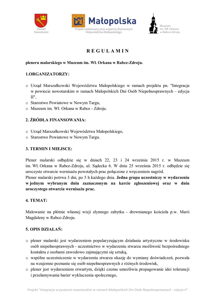 REGULAMIN pleneru malarskiego w Muzeum im. Wł. Orkana w Rabce-Zdroju. 1.ORGANIZATORZY: o Urząd Marszałkowski Województwa Małopolskiego w ramach projektu pn. "Integracja w powiecie nowotarskim w ramach Małopolskich Dni Osób Niepełnosprawnych – edycja II", o Starostwo Powiatowe w Nowym Targu, o Muzeum im. Wł. Orkana w Rabce - Zdroju. 2. ŹRÓDŁA FINANSOWANIA: o Urząd Marszałkowski Województwa Małopolskiego, o Starostwo Powiatowe w Nowym Targu. 3. TERMIN I MIEJSCE: Plener malarski odbędzie się w dniach 22, 23 i 24 września 2015 r. w Muzeum im. Wł. Orkana w Rabce-Zdroju, ul. Sądecka 6. W dniu 25 września 2015 r. odbędzie się uroczyste otwarcie wernisażu powstałych prac połączone z wręczeniem nagród. Plener malarski potrwa 3 dni, po 5 h każdego dnia. Jedna grupa uczestniczy w wydarzeniu w jednym wybranym dniu zaznaczonym na karcie zgłoszeniowej oraz w dniu uroczystego otwarcia wernisażu prac. 4. TEMAT: Malowanie na płótnie własnej wizji słynnego zabytku - drewnianego kościoła p.w. Marii Magdaleny w Rabce-Zdroju. 5. OPIS DZIAŁAŃ: o plener malarski jest wydarzeniem popularyzującym działania artystyczne w środowisku osób niepełnosprawnych - uczestnictwo w wydarzeniu stwarza możliwość bezpośredniego kontaktu z osobami zawodowo zajmującymi się sztuką, o wspólne uczestniczenie w wydarzeniu stwarza okazję do wymiany doświadczeń, pozwala na wzajemne poznanie się osób niepełnosprawnych z różnych środowisk, o plener jest wydarzeniem otwartym, dzięki czemu umożliwia propagowanie idei tolerancji i przełamywania barier wykluczenia społecznego, Projekt "Integracja w powiecie nowotarskim w ramach Małopolskich Dni Osób Niepełnosprawnych - edycja II" o uczestnicy przedstawiając własną wizję zabytku utrwalają walory architektoniczne regionu, o terapia przez sztukę i swobodne działania skierowana jest do uczestników jako forma aktywizująca bez względu na poziom intelektualny i wiekowy, o celem warsztatów jest ponadto utrwalenie świadomości społecznej wagi i roli placówek działających na rzecz osób niepełnosprawnych. 6. POSTANOWIENIA OGÓLNE: Plener malarski w Muzeum im. Wł. Orkana w Rabce-Zdroju ma na celu integrację osób niepełnosprawnych z różnych grup wiekowych i społecznych. W związku z powyższym do udziału w spotkaniach warsztatowych zostali zaproszeni podopieczni placówek działających na rzecz osób niepełnosprawnych z terenu subregionu podhalańskiego. Spośród uczestników pleneru malarskiego wyłonieni zostaną zwycięzcy, którzy otrzymają nagrody. 7. ZGŁOSZENIA: Zgłoszenia prosimy przesyłać na załączonej KARCIE ZGŁOSZENIOWEJ w terminie do 18 września 2015 r. na adres mailowy: [email protected]. Ze względu na ograniczoną ilość miejsc o uczestnictwie w plenerze malarskim decyduje kolejność zgłoszeń. Dodatkowe informacje uzyskać można w Muzeum im. Wł. Orkana w Rabce-Zdroju, pod nr tel.: 18 26 76 289. Organizator zastrzega sobie prawo do publikowania w mediach przebiegu i efektów pleneru malarskiego. Organizator nie pobiera żadnych opłat związanych z uczestnictwem w wydarzeniu. Zgłoszenie do udziału w plenerze jest równoznaczne z akceptacją niniejszego regulaminu. Wysłanie zgłoszenia jest równoznaczne z potwierdzeniem udziału w wydarzeniu i wyrażeniem zgody na przetwarzanie danych osobowych. Prosimy o przywiezienie ze sobą podpisanej zgody na wykorzystanie wizerunku i przetwarzanie danych osobowych. Sprawy nie ujęte w regulaminie rozstrzyga Organizator pleneru malarskiego. Projekt "Integracja w powiecie nowotarskim w ramach Małopolskich Dni Osób Niepełnosprawnych - edycja II" ADRES: MUZEUM IM. WŁADYSŁAWA ORKANA W RABCE-ZDRÓJ ul. Sądecka 6 34-700 Rabka-Zdrój Telefon: 18 26 76 289 Fax: 18 26 76 365 Projekt "Integracja w powiecie nowotarskim w ramach Małopolskich Dni Osób Niepełnosprawnych - edycja II"