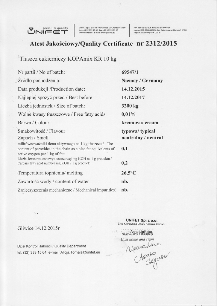 Atest Jakościowy/QualityCertificate nr 231212015