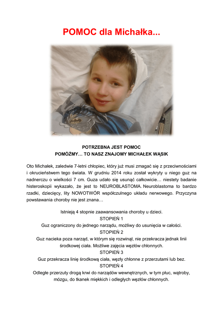 POMOC dla Michałka... POTRZEBNA JEST POMOC POMÓŻMY… TO NASZ ZNAJOMY MICHAŁEK WĄSIK Oto Michałek, zaledwie 7-letni chłopiec, który już musi zmagać się z przeciwnościami i okrucieństwem tego świata. W grudniu 2014 roku został wykryty u niego guz na nadnerczu o wielkości 7 cm. Guza udało się usunąć całkowicie… niestety badanie histeroskopii wykazało, że jest to NEUROBLASTOMA. Neuroblastoma to bardzo rzadki, dziecięcy, lity NOWOTWÓR współczulnego układu nerwowego. Przyczyna powstawania choroby nie jest znana… Istnieją 4 stopnie zaawansowania choroby u dzieci. STOPIEŃ 1 Guz ograniczony do jednego narządu, możliwy do usunięcia w całości. STOPIEŃ 2 Guz nacieka poza narząd, w którym się rozwinął, nie przekracza jednak linii środkowej ciała. Możliwe zajęcia węzłów chłonnych. STOPIEŃ 3 Guz przekracza linię środkową ciała, węzły chłonne z przerzutami lub bez. STOPIEŃ 4 Odległe przerzuty drogą krwi do narządów wewnętrznych, w tym płuc, wątroby, mózgu, do tkanek miękkich i odległych węzłów chłonnych. STOPIEŃ 4s Dotyczy niemowląt z małym guzem nadnercza (stadium 1 i 2), przerzuty do wątroby, szpiku kostnego lub skóry. Po pierwszym badaniu tomograficznym, wykryto na płuckach Michałka liczne guzki, była jednak nadzieja, ponieważ na badaniu scyntygraficznym Michałek nie świecił. Niestety… kolejne badania wykazały wzrost liczby guzków na płucach, pojawiły się także ponownie na nadnerczu oraz w jamie brzusznej. Lekarze określili stan zaawansowania Michałka na 4 stopień! Michałek jest już po pierwszej chemioterapii. Kochani wielka prośba o pomoc, liczy się każdy gest. POTRZEBNA JEST POMOC… Są dwa sposoby: 1. Podaruj swój 1% podatku Michałkowi W formularzu PIT wpisz KRS 0000023852 wpisując w rubryce – informacje uzupełniające- cel szczegółowy 1% MICHAŁ WĄSIK, zaznaczając jednocześnie w zeznaniu pole „wyrażam zgodę” 2. Możesz wpłacić także dowolną kwotę na Fundację: FUNDACJA POMOCY DZIECIOM Z CHOROBAMI NOWOTWOROWYMI W POZNANIU BANK PKO S.A IV Oddział Poznań 72124032201111000035286598 Tytułem: MICHAŁ WĄSIK http://neuroblastomapolska.pl/nasze-dzieciaki/michalek-wasik/ http://neuroblastomapolska.pl/co-to-neuroblastoma/ http://trebaczow.pl/dlamichalka/