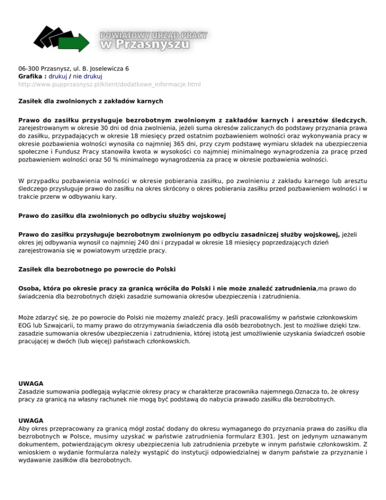 06-300 Przasnysz, ul. B. Joselewicza 6 Grafika : drukuj / nie drukuj http://www.pupprzasnysz.pl/klient/dodatkowe_informacje.html Zasiłek dla zwolnionych z zakładów karnych Prawo do zasiłku przysługuje bezrobotnym zwolnionym z zakładów karnych i aresztów śledczych, zarejestrowanym w okresie 30 dni od dnia zwolnienia, jeżeli suma okresów zaliczanych do podstawy przyznania prawa do zasiłku, przypadających w okresie 18 miesięcy przed ostatnim pozbawieniem wolności oraz wykonywania pracy w okresie pozbawienia wolności wynosiła co najmniej 365 dni, przy czym podstawę wymiaru składek na ubezpieczenia społeczne i Fundusz Pracy stanowiła kwota w wysokości co najmniej minimalnego wynagrodzenia za pracę przed pozbawieniem wolności oraz 50 % minimalnego wynagrodzenia za pracę w okresie pozbawienia wolności. W przypadku pozbawienia wolności w okresie pobierania zasiłku, po zwolnieniu z zakładu karnego lub aresztu śledczego przysługuje prawo do zasiłku na okres skrócony o okres pobierania zasiłku przed pozbawieniem wolności i w trakcie przerw w odbywaniu kary. Prawo do zasiłku dla zwolnionych po odbyciu służby wojskowej Prawo do zasiłku przysługuje bezrobotnym zwolnionym po odbyciu zasadniczej służby wojskowej, jeżeli okres jej odbywania wynosił co najmniej 240 dni i przypadał w okresie 18 miesięcy poprzedzających dzień zarejestrowania się w powiatowym urzędzie pracy. Zasiłek dla bezrobotnego po powrocie do Polski Osoba, która po okresie pracy za granicą wróciła do Polski i nie może znaleźć zatrudnienia,ma prawo do świadczenia dla bezrobotnych dzięki zasadzie sumowania okresów ubezpieczenia i zatrudnienia. Może zdarzyć się, że po powrocie do Polski nie możemy znaleźć pracy. Jeśli pracowaliśmy w państwie członkowskim EOG lub Szwajcarii, to mamy prawo do otrzymywania świadczenia dla osób bezrobotnych. Jest to możliwe dzięki tzw. zasadzie sumowania okresów ubezpieczenia i zatrudnienia, której istotą jest umożliwienie uzyskania świadczeń osobie pracującej w dwóch (lub więcej) państwach członkowskich. UWAGA Zasadzie sumowania podlegają wyłącznie okresy pracy w charakterze pracownika najemnego.Oznacza to, że okresy pracy za granicą na własny rachunek nie mogą być podstawą do nabycia prawado zasiłku dla bezrobotnych. UWAGA Aby okres przepracowany za granicą mógł zostać dodany do okresu wymaganego do przyznania prawa do zasiłku dla bezrobotnych w Polsce, musimy uzyskać w państwie zatrudnienia formularz E301. Jest on jedynym uznawanym dokumentem, potwierdzającym okresy ubezpieczenia lub zatrudnienia przebyte w innym państwie członkowskim. Z wnioskiem o wydanie formularza należy wystąpić do instytucji odpowiedzialnej w danym państwie za przyznanie i wydawanie zasiłków dla bezrobotnych.