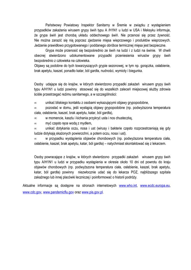 Państwowy Powiatowy Inspektor Sanitarny w Śremie w związku z wystąpieniem przypadków zakażenia wirusem grypy świń typu A /H1N1 u ludzi w USA i Meksyku informuje, że grypa świń jest chorobą układu oddechowego świń. Nie przenosi się przez żywność. Nie można zarazić się nią poprzez zjedzenie mięsa wieprzowego i produktów wieprzowych. Jedzenie prawidłowo przygotowanego i poddanego obróbce termicznej mięsa jest bezpieczne. Grypa może przenosić się bezpośrednio ze świń na ludzi i z ludzi na świnie. W chwili obecnej stwierdzono udokumentowane przypadki przeniesienia wirusów grypy świń bezpośrednio z człowieka na człowieka. Objawy są podobne do tych towarzyszących grypie sezonowej, w tym np. gorączka, osłabienie, brak apetytu, kaszel, ponadto katar, ból gardła, nudności, wymioty i biegunka. Osoby udające się do krajów, w których stwierdzono przypadki zakażeń wirusem grypy świń typu A/H1N1 u ludzi powinny stosować się do wszelkich zaleceń miejscowej służby zdrowia ściśle przestrzegać reżimu sanitarnego, a w szczególności: • • unikać bliskiego kontaktu z osobami wykazującymi objawy grypopodobne, pozostać w domu, jeśli wystąpią objawy grypopodobne (np. podwyższona temperatura ciała, osłabienie, kaszel, brak apetytu, katar, ból gardła), • w momencie, kaszlu i kichania przykryć usta i nos chusteczką, • myć często ręce wodą z mydłem, • unikać dotykania oczu, nosa i ust (wirusy i bakterie często rozprzestrzeniają się gdy ludzie dotykają skażonych powierzchni, a potem oczu, nosa i ust). • w przypadku wystąpienia objawów chorobowych (np. podwyższona temperatura ciała, osłabienie, kaszel, brak apetytu, katar, ból gardła) – natychmiast skontaktować się z lekarzem. Osoby powracające z krajów, w których stwierdzono przypadki zakażeń typu A/H1N1 u ludzi w przypadku wystąpienia w okresie około 10 dni objawów chorobowych (np. podwyższona temperatura ciała, osłabienie, katar, ból gardła) powinny niezwłocznie udać się do lekarza POZ, zakaźnego lub innej placówki leczniczej i poinformować o historii podróży. wirusem grypy świń od powrotu do kraju kaszel, brak apetytu, najbliższego szpitala Aktualne informacje są dostępne na stronach internetowych www.who.int, www.ecdc.europa.eu, www.cdc.gov, www.pandemicflu.gov oraz www.pis.gov.pl.