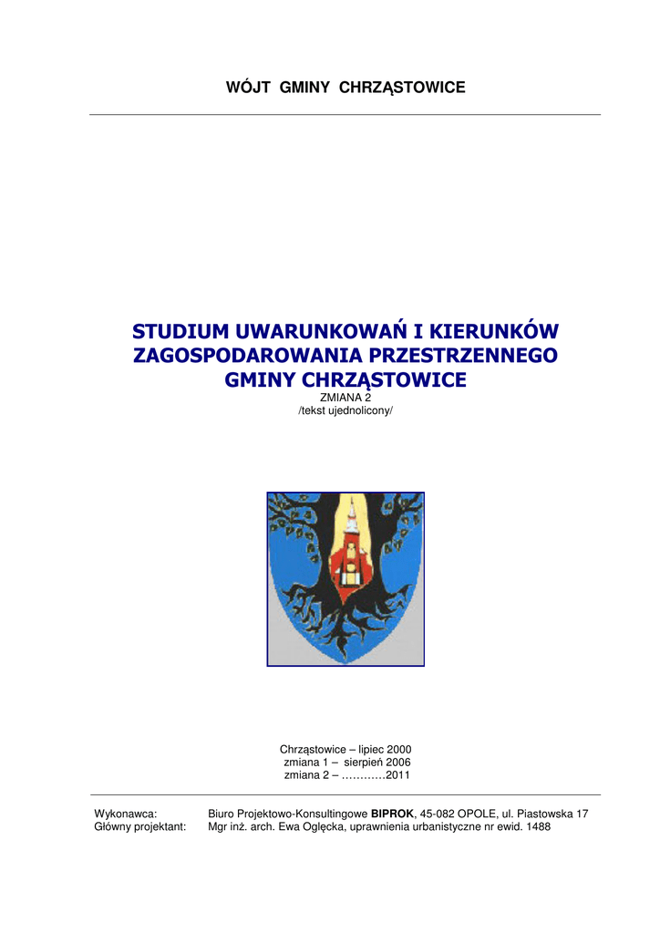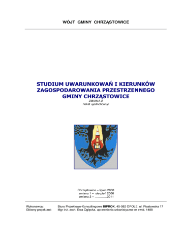 WÓJT GMINY CHRZĄSTOWICE STUDIUM UWARUNKOWAŃ I KIERUNKÓW ZAGOSPODAROWANIA PRZESTRZENNEGO GMINY CHRZĄSTOWICE ZMIANA 2 /tekst ujednolicony/ Chrząstowice – lipiec 2000 zmiana 1 – sierpień 2006 zmiana 2 – …………2011 Wykonawca: Główny projektant: Biuro Projektowo-Konsultingowe BIPROK, 45-082 OPOLE, ul. Piastowska 17 Mgr inż. arch. Ewa Oglęcka, uprawnienia urbanistyczne nr ewid. 1488 Studium uwarunkowań i kierunków zagospodarowania przestrzennego gminy Chrząstowice - uwarunkowania (zmiana 2) _________________________________________________________________________________ Zespół autorski: mgr inż. arch. Ewa Oglęcka - główny projektant prof. Krystian Heffner dr Krzysztof Spałek mgr Artur Rapiński mgr inż. Andrzej Neustein mgr inż. Bernard Harnot - demografia - inwentaryzacja przyrodnicza - inwentaryzacja zasobów archeologicznych - infrastruktura wod. – kan. - elektroenergetyka, telekomunikacja Konsultanci: mgr Eugenia Zawadzka - ochrona środowiska przyrodniczego mgr inż. arch. Bożena Wojakowska - ochrona środowiska kulturowego Fotografie: Jarosław Oglęcki Zmiana 1: mgr inż. arch. Ewa Oglęcka - główny projektant Zmiana 2: mgr inż. arch. Ewa Oglęcka - główny projektant dr Krzysztof Spałek BIPROK - aktualizacja uwarunkowań przyrodniczych 2 Studium uwarunkowań i kierunków zagospodarowania przestrzennego gminy Chrząstowice - uwarunkowania (zmiana 2) _________________________________________________________________________________ WPROWADZENIE BIPROK 3 Studium uwarunkowań i kierunków zagospodarowania przestrzennego gminy Chrząstowice - uwarunkowania (zmiana 2) _________________________________________________________________________________ Studium uwarunkowań i kierunków zagospodarowania przestrzennego gminy Chrząstowice opracowane zostało w 2000r. Pierwsze zmiany do tego dokumentu wprowadzone zostały w 2006r. i przyjęte uchwałą Rady Gminy Nr XXXVIII/269/2006 z dnia 29.08.2006 r. w sprawie uchwalenia zmiany studium uwarunkowań i kierunków zagospodarowania przestrzennego Gminy Chrząstowice. Zakres zmian, zgodnie z wnioskami oceny aktualności studium, obejmował: - doprowadzenie ustaleń Studium do zgodności obowiązującymi planami zagospodarowania przestrzennego, - uzupełnienie i zaktualizowanie problematyki Studium, stosownie do wymogów art. 10 ust. 1 i 2 ustawy z dnia 27 marca 2003r o planowaniu i zagospodarowaniu przestrzennym, - uwzględnienie w ustaleniach Studium wniosków o zmianę przeznaczenia i zagospodarowania terenów, zgodnie z wynikami analizy wniosków rozpatrzonych na etapie sporządzania oceny aktualności Studium, - dostosowanie zapisów Studium do nowych regulacji prawnych, - uwzględnienie w ustaleniach Studium dotyczących zasad ochrony środowiska, uwarunkowań wynikających z opracowań ekofizjogaficznych sporządzonych na potrzeby miejscowych planów zagospodarowania przestrzennego. Zmiany w części tekstowej zostały wprowadzone do pierwotnego tekstu Studium w formie uzupełnień o pojedyncze ustalenia i aktualizacji pojedynczych ustaleń. Wprowadzenie zmian do części graficznej, polegających na uzupełnieniu rysunku Studium o pojedyncze elementy i korekcie niektórych granic stref funkcjonalno-przestrzennych i terenów o różnym przeznaczeniu, wymagało sporządzenia nowego rysunku Studium. W 2009r. podjęta została kolejna zmiana Studium na podstawie uchwały nr XXX / 215 / 2009 Rady Gminy Chrząstowice z dnia 29 października 2009r. w sprawie przystąpienia do sporządzenia zmiany studium uwarunkowań i kierunków zagospodarowania przestrzennego Gminy Chrząstowice. Zakres zmian został w uchwale ograniczony do kilku ściśle określonych terenów. Zgodnie z tym zakresem w kierunkach zagospodarowania przestrzennego gminy: - ustalono nowy przebieg obwodnic wsi Lędziny i Dębska Kuźnia w ciągu drogi krajowej nr 46, - skorygowano ustalenia dotyczące zabudowy i zagospodarowania terenu w miejscowości Niwki, - wprowadzono kilka jednostkowych zmian zagospodarowania terenów polegających na korekcie przebiegu granic stref funkcjonalno-przestrzennych i terenów o różnym przeznaczeniu lub korekcie zapisów ustaleń studium (w obrębie wsi Chrząstowice i w obrębie wsi Dębska Kuźnia). W trakcie procedury drugiej zmiany studium przeprowadzona została strategiczna ocena oddziaływania na środowisko, w ramach której sporządzono prognozę oddziaływania na środowisko. Ponieważ była to pierwsza prognoza, objęto nią pełną problematykę ustaleń studium - jedynie wnioski w prognozie, ze względu na ograniczony zakres zmiany studium, po- BIPROK 4 Studium uwarunkowań i kierunków zagospodarowania przestrzennego gminy Chrząstowice - uwarunkowania (zmiana 2) _________________________________________________________________________________ dzielone zostały na wnioski odnoszące się do projektowanych zmian oraz wnioski ogólne, które powinny być uwzględnione przy podjęciu kolejnej zmiany studium. Przeprowadzenie oceny oddziaływania na środowisko wiązało się z koniecznością zaktualizowania dotychczasowych uwarunkowań przyrodniczych i uzupełnienia studium o nowo utworzone formy prawnej ochrony przyrody, w tym o projektowane obszary NATURA 2000, oraz o nie uwzględnione wcześniej siedliska chronione i stanowiska roślin chronionych. Ponadto w ramach drugiej zmiany studium w części uwarunkowań zaktualizowane zostały niektóre dane o gminie oraz podstawy prawne, bez konsekwencji dla ustaleń kierunków zagospodarowania przestrzennego gminy. Wyjątkiem są ustalenia dotyczące kierunków rozwoju telekomunikacji, których zmianę wymuszają przepisy ustawy z dnia 7 maja 2010 r. o wspieraniu rozwoju usług i sieci telekomunikacyjnych (Dz. U. z 2010 r. Nr 106, poz. 675). Podobnie jak w 2006r., zmiany w części tekstowej zostały wprowadzone do obowiązującego tekstu Studium w formie uzupełnień o pojedyncze ustalenia i aktualizacji pojedynczych ustaleń, natomiast wprowadzenie z
