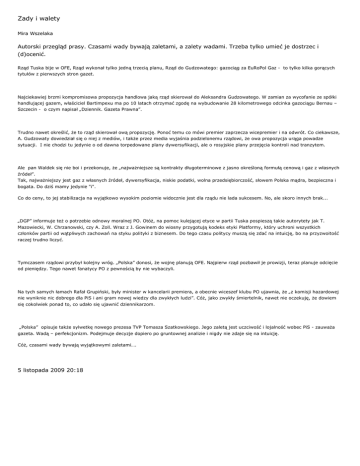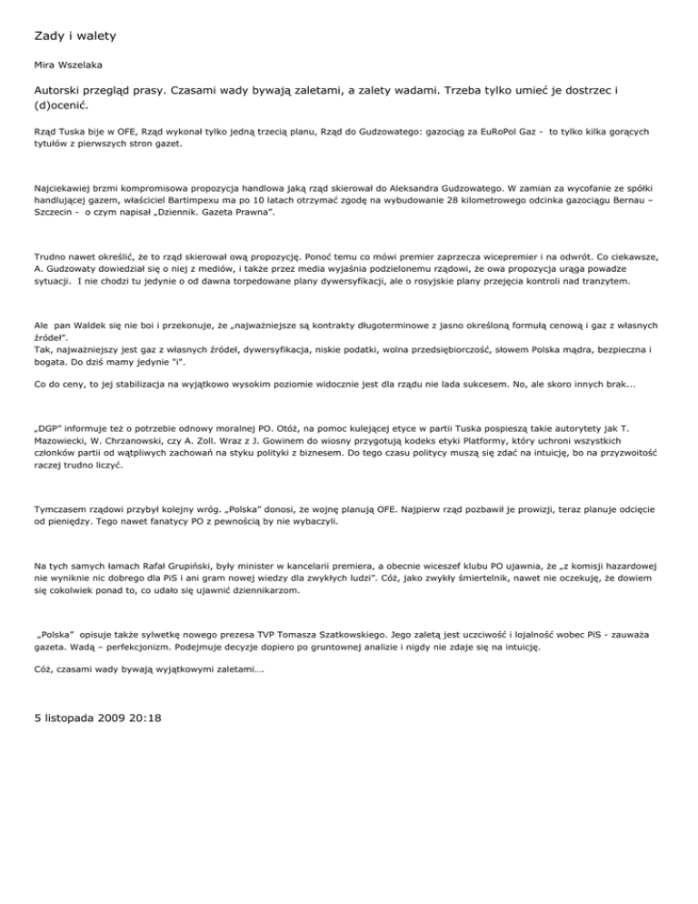 Zady i walety Mira Wszelaka Autorski przegląd prasy. Czasami wady bywają zaletami, a zalety wadami. Trzeba tylko umieć je dostrzec i (d)ocenić. Rząd Tuska bije w OFE, Rząd wykonał tylko jedną trzecią planu, Rząd do Gudzowatego: gazociąg za EuRoPol Gaz - to tylko kilka gorących tytułów z pierwszych stron gazet. Najciekawiej brzmi kompromisowa propozycja handlowa jaką rząd skierował do Aleksandra Gudzowatego. W zamian za wycofanie ze spółki handlującej gazem, właściciel Bartimpexu ma po 10 latach otrzymać zgodę na wybudowanie 28 kilometrowego odcinka gazociągu Bernau – Szczecin - o czym napisał „Dziennik. Gazeta Prawna”. Trudno nawet określić, że to rząd skierował ową propozycję. Ponoć temu co mówi premier zaprzecza wicepremier i na odwrót. Co ciekawsze, A. Gudzowaty dowiedział się o niej z mediów, i także przez media wyjaśnia podzielonemu rządowi, że owa propozycja urąga powadze sytuacji. I nie chodzi tu jedynie o od dawna torpedowane plany dywersyfikacji, ale o rosyjskie plany przejęcia kontroli nad tranzytem. Ale pan Waldek się nie boi i przekonuje, że „najważniejsze są kontrakty długoterminowe z jasno określoną formułą cenową i gaz z własnych źródeł”. Tak, najważniejszy jest gaz z własnych źródeł, dywersyfikacja, niskie podatki, wolna przedsiębiorczość, słowem Polska mądra, bezpieczna i bogata. Do dziś mamy jedynie "i". Co do ceny, to jej stabilizacja na wyjątkowo wysokim poziomie widocznie jest dla rządu nie lada sukcesem. No, ale skoro innych brak... „DGP” informuje też o potrzebie odnowy moralnej PO. Otóż, na pomoc kulejącej etyce w partii Tuska pospieszą takie autorytety jak T. Mazowiecki, W. Chrzanowski, czy A. Zoll. Wraz z J. Gowinem do wiosny przygotują kodeks etyki Platformy, który uchroni wszystkich członków partii od wątpliwych zachowań na styku polityki z biznesem. Do tego czasu politycy muszą się zdać na intuicję, bo na przyzwoitość raczej trudno liczyć. Tymczasem rządowi przybył kolejny wróg. „Polska” donosi, że wojnę planują OFE. Najpierw rząd pozbawił je prowizji, teraz planuje odcięcie od pieniędzy. Tego nawet fanatycy PO z pewnością by nie wybaczyli. Na tych samych łamach Rafał Grupiński, były minister w kancelarii premiera, a obecnie wiceszef klubu PO ujawnia, że „z komisji hazardowej nie wyniknie nic dobrego dla PiS i ani gram nowej wiedzy dla zwykłych ludzi”. Cóż, jako zwykły śmiertelnik, nawet nie oczekuję, że dowiem się cokolwiek ponad to, co udało się ujawnić dziennikarzom. „Polska” opisuje także sylwetkę nowego prezesa TVP Tomasza Szatkowskiego. Jego zaletą jest uczciwość i lojalność wobec PiS - zauważa gazeta. Wadą – perfekcjonizm. Podejmuje decyzje dopiero po gruntownej analizie i nigdy nie zdaje się na intuicję. Cóż, czasami wady bywają wyjątkowymi zaletami…. 5 listopada 2009 20:18