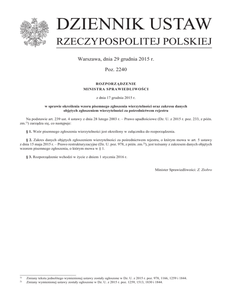 DZIENNIK USTAW RZECZYPOSPOLITEJ POLSKIEJ Warszawa, dnia 29 grudnia 2015 r. Poz. 2240 ROZPORZĄDZENIE MINISTRA SPRAWIEDLIWOŚCI z dnia 17 grudnia 2015 r. w sprawie określenia wzoru pisemnego zgłoszenia wierzytelności oraz zakresu danych objętych zgłoszeniem wierzytelności za pośrednictwem rejestru Na podstawie art. 239 ust. 4 ustawy z dnia 28 lutego 2003 r. – Prawo upadłościowe (Dz. U. z 2015 r. poz. 233, z późn. zm.1)) zarządza się, co następuje: § 1. Wzór pisemnego zgłoszenia wierzytelności jest określony w załączniku do rozporządzenia. § 2. Zakres danych objętych zgłoszeniem wierzytelności za pośrednictwem rejestru, o którym mowa w art. 5 ustawy z dnia 15 maja 2015 r. – Prawo restrukturyzacyjne (Dz. U. poz. 978, z późn. zm.2)), jest tożsamy z zakresem danych objętych wzorem pisemnego zgłoszenia, o którym mowa w § 1. § 3. Rozporządzenie wchodzi w życie z dniem 1 stycznia 2016 r. Minister Sprawiedliwości: Z. Ziobro 1) 2) Zmiany tekstu jednolitego wymienionej ustawy zostały ogłoszone w Dz. U. z 2015 r. poz. 978, 1166, 1259 i 1844. Zmiany wymienionej ustawy zostały ogłoszone w Dz. U. z 2015 r. poz. 1259, 1513, 1830 i 1844. Dziennik Ustaw –2– Poz. 2240 Załącznik do rozporządzenia Ministra Sprawiedliwości z dnia 17 grudnia 2015 r. (poz. 2240) WZÓR strona 1 ZGŁOSZENIE WIERZYTELNOŚCI Sygnatura sprawy Sędzia - komisarz Oznaczenie Sądu Upadły (imię i nazwisko /nazwa) Wierzyciel (imię i nazwisko/nazwa) PESEL lub numer KRS∗ wierzyciela, a w przypadku ich braku inne dane umożliwiające jego jednoznaczną identyfikację Miejsce zamieszkania albo siedziba , Adres Adres do doręczeń (jeżeli jest inny niż adres wskazany w rubryce wyżej) Pełnomocnik Adres pełnomocnika 1. Określenie wierzytelności Kwota / Wartość ∗∗ Kategoria zaspokojenia Tytuł wierzytelności w kategorii I w kategorii II w kategorii III w kategorii IV Suma zgłoszonych wierzytelności w kat. I - IV 2. Określenie wierzytelności nie będącej wierzytelnością osobistą upadłego Kwota Uwagi 3. 4. ∗ Wskazanie sposobu obliczenia należności ubocznych Zabezpieczenia na majątku upadłego, związane ze zgłoszoną wierzytelnością Numer w Krajowym Rejestrze Sądowym W przypadku zgłoszenia wierzytelności niepieniężnej należy wskazać jej wartość z dnia ogłoszenia upadłości, a przypadku wierzytelności pieniężnej – kwotę wierzytelności. ∗∗ Dziennik Ustaw –3– Poz. 2240 strona 2 5. Przedmiot zabezpieczenia, z którego wierzytelność podlega zaspokojeniu (w razie zgłoszenia wierzytelności, w stosunku do której upadły nie jest dłużnikiem osobistym) 6. Stan sprawy, jeżeli co do wierzytelności toczy się postępowanie sądowe, administracyjne, sądowoadministracyjne lub przed sądem polubownym 7. Liczba posiadanych przez wierzyciela udziałów albo akcji w spółce będącej upadłym oraz ich rodzaj (jeżeli wierzyciel jest wspólnikiem albo akcjonariuszem spółki będącej upadłym) Dziennik Ustaw –4– Poz. 2240 strona 3 8. Dowody stwierdzające istnienie wierzytelności (jeżeli wierzytelność została uznana w spisie wierzytelności sporządzonym w postępowaniu restrukturyzacyjnym, wystarczające jest powołanie się na tę okoliczność) 8.1. Wierzytelności uznane w spisie wierzytelności w TAK postępowaniu restrukturyzacyjnym * NIE 8.2. Wierzytelności, które nie były objęte postępowaniem restrukturyzacyjnym lub nie zostały uznane w tym postępowaniu Lp. Dowód 1) 2) 3) 4) Fakt podlegający stwierdzeniu 9. Załączniki Odpis zgłoszenia wierzytelności Pełnomocnictwo∗∗ Dokument lub dokumenty wykazujące upoważnienie do działania w imieniu wierzyciela niebędącego osobą fizyczną** ………………………. 10. Imię i nazwisko osoby lub osób składających zgłoszenie oraz podpis 11. Data POUCZENIA 1. W przypadku, gdy informacje nie mieszczą się w odpowiednich rubrykach, należy je umieścić na kolejnych ponumerowanych kartach formatu A4 ze wskazaniem uzupełnianej rubryki, a jeżeli dokument wypełniany jest elektronicznie – należy dodać niezbędną liczbę wierszy w danej rubryce. 2. Niewypełnione pola należy zakreślić. 3. Do zgłoszenia należy dołączyć jego odpis. 4. Kategorie zaspokojenia wierzytelności zostały zdefiniowane w art. 342 ust. 1 ustawy - Prawo upadłościowe. * Należy zakreślić właściwy kwadrat. Niepotrzebne skreślić. ∗∗