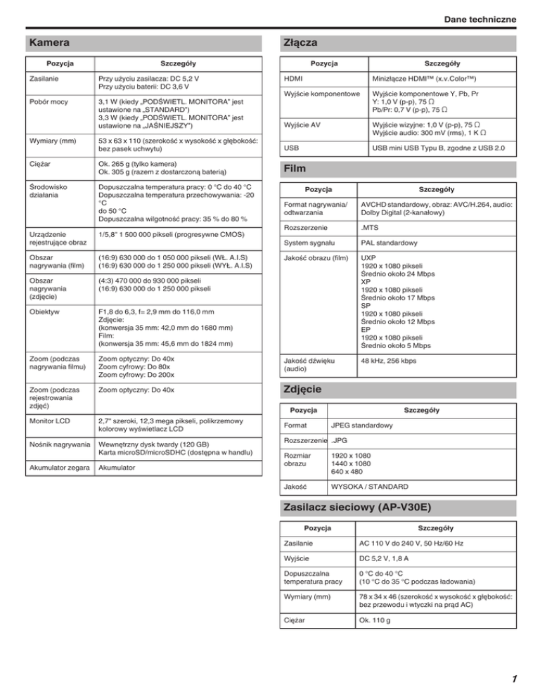 Dane techniczne Złącza Kamera Pozycja Pozycja Szczegóły Zasilanie Przy użyciu zasilacza: DC 5,2 V Przy użyciu baterii: DC 3,6 V Pobór mocy 3,1 W (kiedy „PODŚWIETL. MONITORA” jest ustawione na „STANDARD”) 3,3 W (kiedy „PODŚWIETL. MONITORA” jest ustawione na „JAŚNIEJSZY”) Szczegóły HDMI Minizłącze HDMI™ (x.v.Color™) Wyjście komponentowe Wyjście komponentowe Y, Pb, Pr Y: 1,0 V (p-p), 75 Ω Pb/Pr: 0,7 V (p-p), 75 Ω Wyjście AV Wyjście wizyjne: 1,0 V (p-p), 75 Ω Wyjście audio: 300 mV (rms), 1 K Ω USB mini USB Typu B, zgodne z USB 2.0 Wymiary (mm) 53 x 63 x 110 (szerokość x wysokość x głębokość: bez pasek uchwytu) USB Ciężar Ok. 265 g (tylko kamera) Ok. 305 g (razem z dostarczoną baterią) Film Środowisko działania Dopuszczalna temperatura pracy: 0 °C do 40 °C Dopuszczalna temperatura przechowywania: -20 °C do 50 °C Dopuszczalna wilgotność pracy: 35 % do 80 % Urządzenie rejestrujące obraz 1/5,8" 1 500 000 pikseli (progresywne CMOS) Obszar nagrywania (film) (16:9) 630 000 do 1 050 000 pikseli (WŁ. A.I.S) (16:9) 630 000 do 1 250 000 pikseli (WYŁ. A.I.S) Obszar nagrywania (zdjęcie) (4:3) 470 000 do 930 000 pikseli (16:9) 630 000 do 1 250 000 pikseli Obiektyw F1,8 do 6,3, f= 2,9 mm do 116,0 mm Zdjęcie: (konwersja 35 mm: 42,0 mm do 1680 mm) Film: (konwersja 35 mm: 45,6 mm do 1824 mm) Zoom (podczas nagrywania filmu) Pozycja Szczegóły Format nagrywania/ odtwarzania AVCHD standardowy, obraz: AVC/H.264, audio: Dolby Digital (2-kanałowy) Rozszerzenie .MTS System sygnału PAL standardowy Jakość obrazu (film) UXP 1920 x 1080 pikseli Średnio około 24 Mbps XP 1920 x 1080 pikseli Średnio około 17 Mbps SP 1920 x 1080 pikseli Średnio około 12 Mbps EP 1920 x 1080 pikseli Średnio około 5 Mbps Zoom optyczny: Do 40x Zoom cyfrowy: Do 80x Zoom cyfrowy: Do 200x Jakość dźwięku (audio) 48 kHz, 256 kbps Zoom (podczas rejestrowania zdjęć) Zoom optyczny: Do 40x Zdjęcie Monitor LCD 2,7" szeroki, 12,3 mega pikseli, polikrzemowy kolorowy wyświetlacz LCD Nośnik nagrywania Wewnętrzny dysk twardy (120 GB) Karta microSD/microSDHC (dostępna w handlu) Akumulator zegara Pozycja Akumulator Format Szczegóły JPEG standardowy Rozszerzenie .JPG Rozmiar obrazu 1920 x 1080 1440 x 1080 640 x 480 Jakość WYSOKA / STANDARD Zasilacz sieciowy (AP-V30E) Pozycja Szczegóły Zasilanie AC 110 V do 240 V, 50 Hz/60 Hz Wyjście DC 5,2 V, 1,8 A Dopuszczalna temperatura pracy 0 °C do 40 °C (10 °C do 35 °C podczas ładowania) Wymiary (mm) 78 x 34 x 46 (szerokość x wysokość x głębokość: bez przewodu i wtyczki na prąd AC) Ciężar Ok. 110 g 1 Dane techniczne Bateria (BN-VG114E) Pozycja Szczegóły Napięcie zasilające 3,6 V Pojemność 1400 mAh Wymiary (mm) 31 x 21,5 x 43 (szerokość x wysokość x głębokość) Ciężar Ok. 40 g UWAGA : 0 0 2 Niektóre funkcje wyjaśnione w tej instrukcji dotyczą wyłącznie szczególnych, wskazanych modeli. W celu udoskonalenia tego produktu jego dane techniczne i wygląd mogą ulec zmianie bez uprzedzenia.