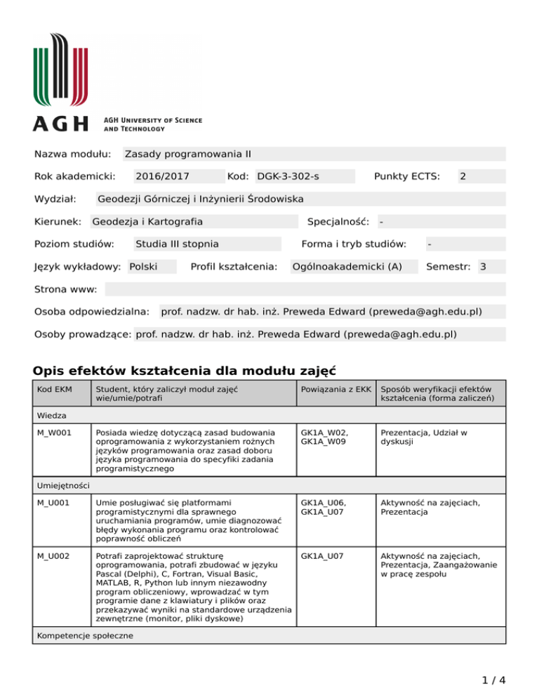 Nazwa modułu: Zasady programowania II Rok akademicki: Wydział: Kierunek: 2016/2017 Kod: DGK-3-302-s Punkty ECTS: 2 Geodezji Górniczej i Inżynierii Środowiska Geodezja i Kartografia Poziom studiów: Studia III stopnia Język wykładowy: Polski Profil kształcenia: Specjalność: - Forma i tryb studiów: Ogólnoakademicki (A) Semestr: 3 Strona www: Osoba odpowiedzialna: prof. nadzw. dr hab. inż. Preweda Edward ([email protected]) Osoby prowadzące: prof. nadzw. dr hab. inż. Preweda Edward ([email protected]) Opis efektów kształcenia dla modułu zajęć Kod EKM Student, który zaliczył moduł zajęć wie/umie/potrafi Powiązania z EKK Sposób weryfikacji efektów kształcenia (forma zaliczeń) Posiada wiedzę dotyczącą zasad budowania oprogramowania z wykorzystaniem rożnych języków programowania oraz zasad doboru języka programowania do specyfiki zadania programistycznego GK1A_W02, GK1A_W09 Prezentacja, Udział w dyskusji M_U001 Umie posługiwać się platformami programistycznymi dla sprawnego uruchamiania programów, umie diagnozować błędy wykonania programu oraz kontrolować poprawność obliczeń GK1A_U06, GK1A_U07 Aktywność na zajęciach, Prezentacja M_U002 Potrafi zaprojektować strukturę oprogramowania, potrafi zbudować w języku Pascal (Delphi), C, Fortran, Visual Basic, MATLAB, R, Python lub innym niezawodny program obliczeniowy, wprowadzać w tym programie dane z klawiatury i plików oraz przekazywać wyniki na standardowe urządzenia zewnętrzne (monitor, pliki dyskowe) GK1A_U07 Aktywność na zajęciach, Prezentacja, Zaangażowanie w pracę zespołu Wiedza M_W001 Umiejętności Kompetencje społeczne 1/4 Karta modułu - Zasady programowania II M_K001 Potrafi zorganizować pracę w zespole programistów, umie przygotować dokumentację użytkową oraz techniczną prostej aplikacji w wybranym języku GK1A_K05 Referat, Zaangażowanie w pracę zespołu M_K002 Rozumie potrzebę stałego poszerzania wiedzy i umiejętności programistycznych, potrafi samodzielnie opanować umiejętność programowania z wykorzystaniem rożnych języków programowania GK1A_K01 Aktywność na zajęciach, Prezentacja Matryca efektów kształcenia w odniesieniu do form zajęć Konwersatori um Zajęcia seminaryjne Zajęcia praktyczne Zajęcia terenowe Zajęcia warsztatowe - - - - - - - - - - - M_U001 Umie posługiwać się platformami programistycznymi dla sprawnego uruchamiania programów, umie diagnozować błędy wykonania programu oraz kontrolować poprawność obliczeń - - - - - - - - - - - M_U002 Potrafi zaprojektować strukturę oprogramowania, potrafi zbudować w języku Pascal (Delphi), C, Fortran, Visual Basic, MATLAB, R, Python lub innym niezawodny program obliczeniowy, wprowadzać w tym programie dane z klawiatury i plików oraz przekazywać wyniki na standardowe urządzenia zewnętrzne (monitor, pliki dyskowe) - - - - - - - - - - - E-learning Ćwiczenia projektowe Posiada wiedzę dotyczącą zasad budowania oprogramowania z wykorzystaniem rożnych języków programowania oraz zasad doboru języka programowania do specyfiki zadania programistycznego Inne Ćwiczenia laboratoryjne Forma zajęć Ćwiczenia audytoryjne Student, który zaliczył moduł zajęć wie/umie/potrafi Wykład Kod EKM Wiedza M_W001 Umiejętności Kompetencje społeczne 2/4 Karta modułu - Zasady programowania II M_K001 Potrafi zorganizować pracę w zespole programistów, umie przygotować dokumentację użytkową oraz techniczną prostej aplikacji w wybranym języku - - - - - - - - - - - M_K002 Rozumie potrzebę stałego poszerzania wiedzy i umiejętności programistycznych, potrafi samodzielnie opanować umiejętność programowania z wykorzystaniem rożnych języków programowania - - - - - - - - - - - Treść modułu zajęć (program wykładów i pozostałych zajęć) Ćwiczenia laboratoryjne - Sposób obliczania oceny końcowej Ocena końcowa = 0.5(Ocena prezentacji) + 0.3(Ocena odpowiedzi na pytania uczestników seminarium) + 0.2(Aktywnośc na zajęciach) Wymagania wstępne i dodatkowe Studenci są zobowiązani do obecności na zajęciach. W przypadku nieobecności należy uzgodnić z prowadzącym formę odrobienia zajęć. Zalecana literatura i pomoce naukowe N. Wirth: Algorytmy+struktury danych = programy. WNT, Warszawa 2002 D. Van Tessel: Praktyka programowania. WNT Warszawa, 1989 A. Marciniak: Język programowania Delphi. Wyd. Nakom, 2012 Dattatri K., Język C++. Efektywne programowanie obiektowe, Helion, 2005 Signer A.: Programowanie w języku C++. Szybki start, Helion 2006 Publikacje naukowe osób prowadzących zajęcia związane z tematyką modułu Preweda E.: Rachunek wyrównawczy ⇒ modele statystyczne. PROGRES, Kraków 2013. Preweda E.: Estymacja parametrów kinematycznego modelu przemieszczeń. Rozprawy Monografie. AGH Kraków 2002. Preweda E.: System pomiaru, obliczeń i wizualizacji zmian geometrycznych obiektów powłokowych o powierzchni stopnia drugiego. Rozprawa doktorska. AGH Kraków 1995. Informacje dodatkowe Brak 3/4 Karta modułu - Zasady programowania II Nakład pracy studenta (bilans punktów ECTS) Forma aktywności studenta Obciążenie studenta Udział w zajęciach seminaryjnych 14 godz Dodatkowe godziny kontaktowe z nauczycielem 10 godz Przygotowanie do zajęć 20 godz Przygotowanie sprawozdania, pracy pisemnej, prezentacji, itp. 10 godz Sumaryczne obciążenie pracą studenta 54 godz Punkty ECTS za moduł 2 ECTS 4/4