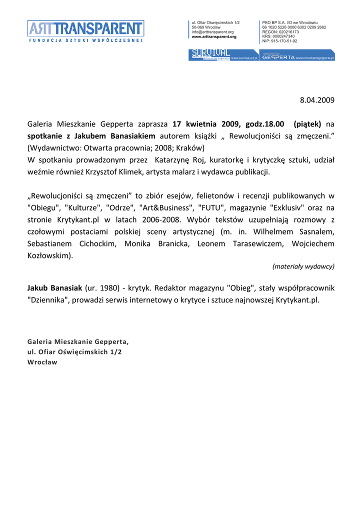ul. Ofiar Oświęcimskich 1/2 50-069 Wrocław [email protected] www.arttransparent.org PKO BP S.A. I/O we Wrocławiu 66 1020 5226 0000 6302 0209 2682 REGON: 020216173 KRS: 0000247340 NIP: 915-170-51-92 8.04.2009 Galeria Mieszkanie Gepperta zaprasza 17 kwietnia 2009, godz.18.00 (piątek) na spotkanie z Jakubem Banasiakiem autorem książki „ Rewolucjoniści są zmęczeni.” (Wydawnictwo: Otwarta pracownia; 2008; Kraków) W spotkaniu prowadzonym przez Katarzynę Roj, kuratorkę i krytyczkę sztuki, udział weźmie również Krzysztof Klimek, artysta malarz i wydawca publikacji. „Rewolucjoniści są zmęczeni” to zbiór esejów, felietonów i recenzji publikowanych w "Obiegu", "Kulturze", "Odrze", "Art&Business", "FUTU", magazynie "Exklusiv" oraz na stronie Krytykant.pl w latach 2006-2008. Wybór tekstów uzupełniają rozmowy z czołowymi postaciami polskiej sceny artystycznej (m. in. Wilhelmem Sasnalem, Sebastianem Cichockim, Monika Branicka, Leonem Tarasewiczem, Wojciechem Kozłowskim). (materiały wydawcy) Jakub Banasiak (ur. 1980) - krytyk. Redaktor magazynu "Obieg", stały współpracownik "Dziennika", prowadzi serwis internetowy o krytyce i sztuce najnowszej Krytykant.pl. Galeria Mieszkanie Gepperta, ul. Ofiar Oświęcimskich 1/2 Wrocław