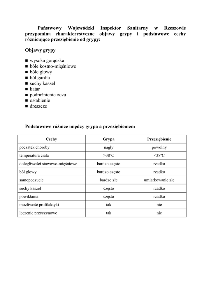 Państwowy Wojewódzki Inspektor Sanitarny w Rzeszowie przypomina charakterystyczne objawy grypy i podstawowe cechy róŜnicujące przeziębienie od grypy: Objawy grypy wysoka gorączka bóle kostno-mięśniowe bóle głowy ból gardła suchy kaszel katar podraŜnienie oczu osłabienie dreszcze Podstawowe róŜnice między grypą a przeziębieniem Cechy Grypa Przeziębienie początek choroby nagły powolny temperatura ciała >38ºC <38ºC dolegliwości stawowo-mięśniowe bardzo często rzadko ból głowy bardzo często rzadko samopoczucie bardzo złe umiarkowanie złe suchy kaszel często rzadko powikłania często rzadko moŜliwość profilaktyki tak nie leczenie przyczynowe tak nie