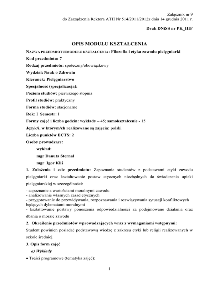 Załącznik nr 9 do Zarządzenia Rektora ATH Nr 514/2011/2012z dnia 14 grudnia 2011 r. Druk DNiSS nr PK_IIIF OPIS MODUŁU KSZTAŁCENIA NAZWA PRZEDMIOTU/MODUŁU KSZTAŁCENIA: Filozofia i etyka zawodu pielęgniarki Kod przedmiotu: 7 Rodzaj przedmiotu: społeczny/obowiązkowy Wydział: Nauk o Zdrowiu Kierunek: Pielęgniarstwo Specjalność (specjalizacja): Poziom studiów: pierwszego stopnia Profil studiów: praktyczny Forma studiów: stacjonarne Rok: I Semestr: I Formy zajęć i liczba godzin: wykłady – 45; samokształcenie - 15 Język/i, w którym/ch realizowane są zajęcia: polski Liczba punktów ECTS: 2 Osoby prowadzące: wykład: mgr Danuta Sternal mgr Igor Kliś 1. Założenia i cele przedmiotu: Zapoznanie studentów z podstawami etyki zawodu pielęgniarki oraz kształtowanie postaw etycznych niezbędnych do świadczenia opieki pielęgniarskiej w szczególności: - zapoznanie z wartościami moralnymi zawodu - analizowanie własnych zasad etycznych - przygotowanie do przewidywania, rozpoznawania i rozwiązywania sytuacji konfliktowych będących dylematami moralnymi - kształtowanie postawy ponoszenia odpowiedzialności za podejmowane działania oraz dbania o morale zawodu 2. Określenie przedmiotów wprowadzających wraz z wymaganiami wstępnymi: Student powinien posiadać podstawową wiedzę z zakresu etyki lub religii realizowanych w szkole średniej. 3. Opis form zajęć a) Wykłady Treści programowe (tematyka zajęć): 1 1. Ogólny zarys filozofii i jej znaczenie na przestrzeni wieków. Główne zagadnienia (1 godz.) 2. Filozofia pielęgniarstwa. Poglądy i koncepcje filozoficzne pielęgniarstwa (3 godz.). 3. Pojęcie filozofii człowieka i jej przedmiot. Wpływ wybranych koncepcji filozofii człowieka na kształtowanie współczesnego pielęgniarstwa (4 godz.). 4. Charakterystyka poglądów najwybitniejszych filozofów (4 godz.). 5. Etyka jako normatywna teoria powinności moralnej- definicja etyki i deontologii, podstawowe nurty i twierdzenia etyki normatywnej, miejsce etyki pielęgniarskiej w systemie nauk o moralności (3 godz.). 6. Aspekty moralne pracy pielęgniarek w świetle koncepcji etycznych (3 godz.). 7. Prawa pacjenta-źródła i rodzaje praw, egzekwowanie praw pacjenta (3 godz.). 8. Etyczne aspekty podejmowania decyzji w różnych warunkach - elementy niezbędne do podejmowaniu decyzji etycznych, czynniki warunkujące procesy decyzyjne (6 godz.). 9. Systemy wartości – szanowanie wartości, obyczajów, wierzeń religijnych, hierarchia wartości (3 godz.). 10. Dylematy moralne pielęgniarek- trudności powstające przy rozwiązywaniu dylematów etycznych w pracy pielęgniarek, próba rozwiązywania dylematów etycznych w oparciu o analizę przypadków (4 godz.). 11.Wybrane zagadnienia z bioetyki – eksperyment medyczny, przeszczepy komórek, tkanek i narządów, eutanazja, interwencje medyczne związane z reprodukcją (5 godz.). 12. Kodeksy deontologiczne- funkcje kodeksu - historia kodeksów etycznych w pielęgniarstwie (3 godz.). 13. Kodeks Międzynarodowej Rady Pielęgniarek (2 godz.). 14. Kodeks Etyki Zawodowej Polskiej Pielęgniarki i Położnej - przyrzeczenie pielęgniarek - aspekty prawne i deontologiczne standardów profesjonalnej pomocy pielęgniarkom i położnym (1 godz.). b) samokształcenie Student samodzielnie lub przy pomocy nauczyciela wybiera temat z przygotowanego zestawu. Zadanie ma charakter pisemny: esej Przykładowe tezy programowe do samokształcenia: 1. Uzasadnij, że ideał pielęgniarki w świetle koncepcji Teresy Kulczyńskiej zachował aktualność do dnia dzisiejszego. 2. Przeanalizuj związek między treścią ślubowania F. Nightingale a współczesną praktyką pielęgniarską. 3. Wyjaśnij na podstawie treści ślubowania . Nightingale istotę zawodu pielęgniarskiego. 4. Przeanalizuj na podstawie części wstępnej kodeksu Międzynarodowej Rady Pielęgniarek podstawową odpowiedzialność zawodową pielęgniarek i jej realizację w Polsce. 5. Moralność wybranej grupy społecznej, ocena norm w niej panujących przez otoczenie – na przykładzie własnego uczestnictwa. 6. Etyka a prawa pacjenta. 7. Sens życia. 8. Sens choroby. 9. Sens śmierci. 10. Cierpienie jako czynnik wpływający na wybór moralny. 11. Czy eutanazja jest sposobem łagodzenia beznadziejnych cierpień. 12. Autonomia chorego w zakresie myślenia, decyzji i działania. 13. Etyka powołania. 14. Rola etyki w procesie kształtowania postaw studentów pielęgniarstwa. 15. Rola zawodowa pielęgniarki jako układ powinności wynikających z zasad etycznych – refleksja własna. 16. Kobiecość jako wartość zawodowej roli pielęgniarki. 2 Metody dydaktyczne: Metody oparte na słowie: wykład (prezentacja multimedialna), dyskusja, analiza przypadku, film Forma i warunki zaliczenia: Warunkiem zaliczenia przedmiotu jest uzyskanie pozytywnej oceny z dwóch kolokwium zaliczeniowych z części teoretycznej oraz pracy samokształceniowej. Wykaz literatury podstawowej i uzupełniającej (maksymalnie 5 pozycji w każdej grupie): Literatura podstawowa: 1. Górajek- Jóźwik J. Filozofia i teorie pielęgniarstwa PZWL, Warszawa 2007 2. Kodeks Etyki Zawodowej Pielęgniarki i Położnej Rzeczypospolitej Polskiej. IV Krajowy Zjazd Pielęgniarek i Położnych, Warszawa 2003 3. Rogala Pawelczyk G.(red.): Odpowiedzialność zawodowa pielęgniarek i położnych, NRPiP, Warszawa 2007 4. Wrońska I., Mariański I.: Etyka pracy pielęgniarskiej. Czelej, Lublin 2002 5. Ustawa o prawach pacjenta i Rzeczniku praw pacjenta. Dz.U. z dnia 31 marca 2009 r. Nr. 52, poz. 417 Literatura uzupełniająca: 1. Paździoch S.: Prawa pacjenta w ustawodawstwie polskim. CEM, Pielęgniarstwo 2000, 2 2. Tatarkiewicz W. Historia filozofii T. I- III, PWN, Warszawa 2003 3. Kodeks etyki ICN dla pielęgniarek. Polskie Towarzystwo Pielęgniarskie, Warszawa 2007 4. Opis sposobu wyznaczania punktów ECTS Bilans nakładu pracy przeciętnego studenta przedstawia się następująco: - udział w wykładach = 45 g