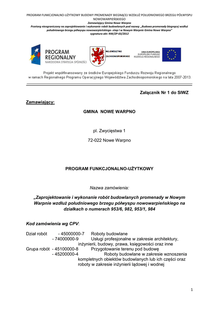 PROGRAM FUNKCJONALNO-UŻYTKOWY BUDOWY PROMENADY BIEGNĄCEJ WZDŁUŻ POŁUDNIOWEGO BRZEGU PÓŁWYSPU NOWOWARPIEOSKIEGO Zamawiający Gmina Nowe Warpno Przetarg nieograniczony na zaprojektowanie i wykonanie robót budowlanych pod nazwą: „Budowa promenady biegnącej wzdłuż południowego brzegu półwyspu nowowarpieoskiego- etap I w Nowym Warpnie Gmina Nowe Warpno” sygnatura akt: NW/ZP-03/2012 Załącznik Nr 1 do SIWZ Zamawiający: GMINA NOWE WARPNO pl. Zwycięstwa 1 72-022 Nowe Warpno PROGRAM FUNKCJONALNO-UŻYTKOWY Nazwa zamówienia: „Zaprojektowanie i wykonanie robót budowlanych promenady w Nowym Warpnie wzdłuż południowego brzegu półwyspu nowowarpieńskiego na działkach o numerach 953/6, 982, 953/1, 984 Kod zamówienia wg CPV: Dział robót - 45000000-7 Roboty budowlane - 74000000-9 Usługi profesjonalne w zakresie architektury, inżynierii, budowy, prawa, księgowości oraz inne Grupa robót - 45100000-8 Przygotowanie terenu pod budowę - 45200000-4 Roboty budowlane w zakresie wznoszenia kompletnych obiektów budowlanych lub ich części oraz roboty w zakresie inżynierii lądowej i wodnej 1 PROGRAM FUNKCJONALNO-UŻYTKOWY BUDOWY PROMENADY BIEGNĄCEJ WZDŁUŻ POŁUDNIOWEGO BRZEGU PÓŁWYSPU NOWOWARPIEOSKIEGO Zamawiający Gmina Nowe Warpno Przetarg nieograniczony na zaprojektowanie i wykonanie robót budowlanych pod nazwą: „Budowa promenady biegnącej wzdłuż południowego brzegu półwyspu nowowarpieoskiego- etap I w Nowym Warpnie Gmina Nowe Warpno” sygnatura akt: NW/ZP-03/2012 - 74200000-1 Usługi doradcze dotyczące architektury, inżynierii, budowy i podobne Klasy robót - 45110000-1 Roboty w zakresie burzenia i rozbiórki obiektów budowlanych, roboty ziemne - 45120000-4 Próbne wiercenia i wykopy - 45220000-2 Roboty inżynieryjne i budowlane - 45230000-8 Roboty budowlane w zakresie budowy rurociągów, linii komunikacyjnych i elektroenergetycznych, autostrad, dróg, lotnisk i kolei, wyrównywanie terenu - 74230000-0 Usługi inżynieryjne - 74240000-3 Zintegrowane usługi inżynieryjne - 74260000-9 Usługi związane z budownictwem - 74270000-2 Usługi inżynieryjne naukowe i techniczne Kategorie robót - 45111000-8 Roboty w zakresie burzenia, roboty ziemne - 45112000-5 Roboty w zakresie usuwania gleby - 45113000-2 Roboty na placu budowy - 45121000-1 Próbne wiercenia - 45231000-5 Roboty budowlane w zakresie budowy rurociągów, ciągów komunikacyjnych i linii elektroenergetycznych - 45232000-2 Roboty pomocnicze w zakresie rurociągów i kabli - 45233000-9 Roboty w zakresie konstruowania fundamentowania oraz wykonywania nawierzchni autostrad, dróg - 45236000-0 Wyrównywanie terenu - 74231000-7 Doradcze usługi inżynieryjne i budowlane - 74232000-4 Usługi inżynieryjne w zakresie projektowania - 74233000-1 Różne usługi inżynieryjne. - 74261000-6 Usługi badania terenu - 74262000-3 Usługi nadzoru budowlanego - 74263000-0 Doradcze usługi budowlane - 74272000-6 Usługi badania podłoża - 74274000-0 Usługi sporządzania map Autor opracowania: inż. Marek Kurdyła NCBS New Creation Business Solution ul. Niedziałkowskiego 24; 71 – 410 Szczecin 2 PROGRAM FUNKCJONALNO-UŻYTKOWY BUDOWY PROMENADY BIEGNĄCEJ WZDŁUŻ POŁUDNIOWEGO BRZEGU PÓŁWYSPU NOWOWARPIEOSKIEGO Zamawiający Gmina Nowe Warpno Przetarg nieograniczony na zaprojektowanie i wykonanie robót budowlanych pod nazwą: „Budowa promenady biegnącej wzdłuż południowego brzegu półwyspu nowowarpieoskiego- etap I w Nowym Warpnie Gmina Nowe Warpno” sygnatura akt: NW/ZP-03/2012 ZAWARTOŚĆ OPRACOWANIA I. OPIS OGÓLNY PRZEDMIOTU ZAMÓWIENIA 1. Charakterystyczne parametry określające wielkość obiektu lub zakres robót budowlanych 2. Aktualne uwarunkowania wykonania przedmiotu zamówienia 3. Ogólne właściwości funkcjonalno – użytkowe 4. Szczegółowe właściwości funkcjonalno - użytkowe II. WYMAGANIA SZCZEGÓŁOWE ZAMAWIAJĄCEGO 1. Przygotowanie terenu budowy 2. Architektura 3. Konstrukcja 4. Sieci zewnętrzne i przyłącza 5. Pozostałe standardy wykończenia i wyposażenia pawilonów gastronomiczno – handlowych i toalety publicznej 6. Wykończenie 7. Zagospodarowanie terenu III. CZĘŚĆ INFORMACYJNA PROGRAMU FUNKCJONALNO - UŻYTKOWEGO 1. Dokumenty potwierdzające zgodność zamierzenia budowlanego z wymaganiami wynikającymi z odrębnych przepisów 2. Oświadczenie zamawiającego stwierdzające jego prawo do dysponowania nieruchomością na cele budowlane 3. Przepisy prawne i normy związane z projektowaniem i wykonaniem zamierzenia budowlanego 4. Badania gruntowo - wodne na terenie budowy dla potrzeb posadowienia obiektu 5. Zalecenia konserwatorskie konserwatora zabytków 3 PROGRAM FUNKCJONALNO-UŻYTKOWY BUDOWY PROMENADY BIEGNĄCEJ WZDŁUŻ POŁUDNIOWEGO BRZEGU PÓŁWYSPU NOWOWARPIEOSKIEGO Zamawiający Gmina Nowe Warpno Przetarg nieograniczony na zaprojektowanie i wykonanie robót budowlanych pod nazwą: „Budowa promenady biegnącej wzdłuż południowego brzegu półwyspu nowowarpieoskiego- etap I w Nowym Warpnie Gmina Nowe Warpno” sygnatura akt: NW/ZP-03/2012 6. Inwentaryzacja zieleni 7. Dane dotyczące zanieczyszczeń atmosfery do analizy ochrony powietrza oraz posiadane raporty , opinie lub ekspertyzy z zakresu ochrony środowiska 8. Pomiary ruchu drogowego , hałasu i innych uciążliwości 9. Dokumentacja obiektów budowlanych 10. Porozumienia , zgody lub pozwolenia oraz warunki techniczne i realizacyjne związane z przyłączeniem obiektów do istniejących sieci wodociągowych , kanalizacyjnych , energetycznych i teletechnicznych oraz dróg samochodowych 11. Dodatkowe wytyczne inwestorskie i uwarunkowania związane z projektem IV. INFORMACJA O WŁASCICIELACH ( ZARZĄDCACH ) INFRASTRUKTURY TECHNICZNEJ 1. Wodociągi i kanalizacja sanitarna 2. Sieci elektroenergetyczne 3. Sieci teletechniczne 4. Droga gminna 4 PROGRAM FUNKCJONALNO-UŻYTKOWY BUDOWY PROMENADY BIEGNĄCEJ WZDŁUŻ POŁUDNIOWEGO BRZEGU PÓŁWYSPU NOWOWARPIEOSKIEGO Zamawiający Gmina Nowe Warpno Przetarg nieogra
