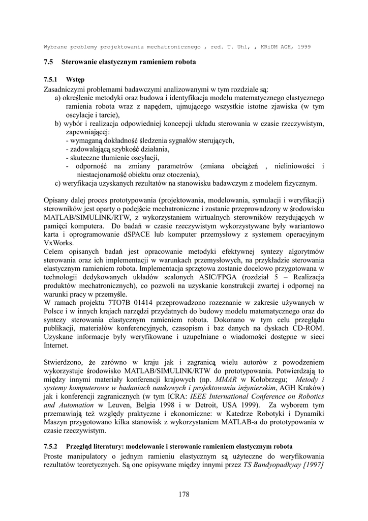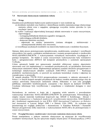 Wybrane problemy projektowania mechatronicznego , red. T. Uhl, , KRiDM AGH, 1999 7.5 7.5.1 Sterowanie elastycznym ramieniem robota Wst p Zasadniczymi problemami badawczymi analizowanymi w tym rozdziale s : a) okre lenie metodyki oraz budowa i identyfikacja modelu matematycznego elastycznego ramienia robota wraz z nap dem, ujmuj cego wszystkie istotne zjawiska (w tym oscylacje i tarcie), b) wybór i realizacja odpowiedniej koncepcji układu sterowania w czasie rzeczywistym, zapewniaj cej: - wymagan dokładno ledzenia sygnałów steruj cych, - zadowalaj c szybko działania, - skuteczne tłumienie oscylacji, - odporno na zmiany parametrów (zmiana obci e , nieliniowo ci i niestacjonarno obiektu oraz otoczenia), c) weryfikacja uzyskanych rezultatów na stanowisku badawczym z modelem fizycznym. Opisany dalej proces prototypowania (projektowania, modelowania, symulacji i weryfikacji) sterowników jest oparty o podej cie mechatroniczne i zostanie przeprowadzony w rodowisku MATLAB/SIMULINK/RTW, z wykorzystaniem wirtualnych sterowników rezyduj cych w pami ci komputera. Do bada w czasie rzeczywistym wykorzystywane były wariantowo karta i oprogramowanie dSPACE lub komputer przemysłowy z systemem operacyjnym VxWorks. Celem opisanych bada jest opracowanie metodyki efektywnej syntezy algorytmów sterowania oraz ich implementacji w warunkach przemysłowych, na przykładzie sterowania elastycznym ramieniem robota. Implementacja sprz towa zostanie docelowo przygotowana w technologii dedykowanych układów scalonych ASIC/FPGA (rozdział 5 – Realizacja produktów mechatronicznych), co pozwoli na uzyskanie konstrukcji zwartej i odpornej na warunki pracy w przemy le. W ramach projektu 7TO7B 01414 przeprowadzono rozeznanie w zakresie u ywanych w Polsce i w innych krajach narz dzi przydatnych do budowy modelu matematycznego oraz do syntezy sterowania elastycznym ramieniem robota. Dokonano w tym celu przegl du publikacji, materiałów konferencyjnych, czasopism i baz danych na dyskach CD-ROM. Uzyskane informacje były weryfikowane i uzupełniane o wiadomo ci dost pne w sieci Internet. Stwierdzono, e zarówno w kraju jak i zagranic wielu autorów z powodzeniem wykorzystuje rodowisko MATLAB/SIMULINK/RTW do prototypowania. Potwierdzaj to mi dzy innymi materiały konferencji krajowych (np. MMAR w Kołobrzegu; Metody i systemy komputerowe w badaniach naukowych i projektowaniu in ynierskim, AGH Kraków) jak i konferencji zagranicznych (w tym ICRA: IEEE International Conference on Robotics and Automation w Leuven, Belgia 1998 i w Detroit, USA 1999). Za wyborem tym przemawiaj te wzgl dy praktyczne i ekonomiczne: w Katedrze Robotyki i Dynamiki Maszyn przygotowano kilka stanowisk z wykorzystaniem MATLAB-a do prototypowania w czasie rzeczywistym. 7.5.2 Przegl d literatury: modelowanie i sterowanie ramieniem elastycznym robota Proste manipulatory o jednym ramieniu elastycznym s u yteczne do weryfikowania rezultatów teoretycznych. S one opisywane mi dzy innymi przez TS Bandyopadhyay [1997] 178 (model o zmiennej strukturze), Ge-Ss Lee-Th Zhu-G, [1997] (elementy sko czone). Krishnan-H i Vidyasagar-M [1998] wykorzystuje norm Hankel'a a. [Depince, 1998] proponuje sposób oszacowania parametrów, których nie mo na zidentyfikowa . Znajomo k tów pomi dzy ramionami robota nie okre la przestrzennego poło enia ko ca ramienia – je li robot ma elastyczne ramiona. Rozwi zanie tego problemu przy u yciu obserwatorów zostało opisane przez Jing-Xin Shi et al.,[1998]. Z kolei Akira Mohri. [1998] wykorzystuje, podobnie jak Lisowski [1995], metod elementów sko czonych i zasad Lagrange’a do opisu (i wytłumienia) drga ko ca ramienia. Philippe Depince [1998] prezentuje podej cie heurystyczne do tego problemu, dla robota planarnego z jednym ramieniem elastycznym. Dynamiczne generowanie trajektorii dla robota o ramionach elastycznych jest równie opisywane przez Yue-Sg, [1998], ]. Kovecses-J [1997]., Akira Mohri at al, [1998] oraz Nagaraj [1997]. Jeszcze inne podej cie opisuje Thomas-S Bandyopadhyay [1997]. F. Boyer [1998] uwzgl dnia nieliniowo ci zwi zane z kinematyk ramion elastycznych poprzez wykorzystanie nie tylko pierwszego, ale i dwu nast pnych członów we wzorze Taylora. Z kolei Li-Dg i Zu-Jw Goldenberg-Aa [1998] oraz Lisowski [1995] u ywaj analizy modalnej do identyfikacji. Model o parametrach rozło onych jest opisywany przez Kovecses [1998]. Dokładno modelu dyskretnego jest badana przez Moulin i Bayo [1997]. Fan-Zj LuBh i Ku-Ch [1997] uwzgl dniaj tarcie wiskotyczne przy ruchu ramion elastycznych. Inne prace na ten temat to: Nagaraj [1997] i Theodore [1997]. Regulatory PID (oraz PI i PD) s proste i łatwe w stosowaniu. Daj one zauwa aln popraw własno ci dynamicznych do skutecznie tłumi c oscylacje, s jednak wra liwe na zmian parametrów modelu (Uhl [1998]). S mniej skuteczne dla obiektów z opó nieniem i nieminimalno fazowych. Metoda lokacji biegunów obiektu wymaga znajomo ci parametrów rzeczywistego obiektu Nie ma wpływu na poło enie zer, ale pozwala przesuwa bieguny obiektu na płaszczy nie zespolonej. Daje to mo liwo zmiany cz stotliwo ci własnych obiektu (a zarazem szybko ci jego reakcji na wymuszenie) i okre lenia jego współczynników tłumienia. Metoda ta (w przypadku modelu w przestrzeni stanu) wymaga pomiaru wszystkich zmiennych stanu. W warunkach przemysłowych, je li jaka współrz dna stanu nie mo e by mierzona lub nie ma do niej wygodnego dost pu (np. poło enie ko ca ramienia robota), stosowane s obserwatory. Jednym z nich jest filtr Kalmana. W przypadku transmitancji układu SISO wystarczy znajomo warto ci aktualnej i poprzednich warto ci sygnału wyj ciowego Wad metody lokacji biegunów jest jej wra liwo na niedokładno ci modelu matematycznego i mo liwo wyst powania wysokich warto ci współczynnika wzmocnienia. Współczynniki wzmocnienia mo na oblicza z u yciem metody LQ lub LQG. Cz autorów bada modele typu „czarna skrzynka”. Nale do nich modele transmitancyjne opisane w rozdziale 7.5.6.