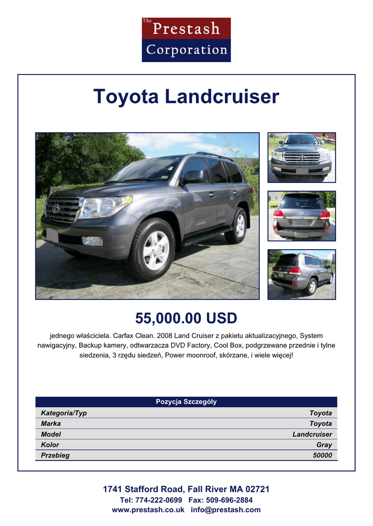 Toyota Landcruiser 55,000.00 USD jednego właściciela. Carfax Clean. 2008 Land Cruiser z pakietu aktualizacyjnego, System nawigacyjny, Backup kamery, odtwarzacza DVD Factory, Cool Box, podgrzewane przednie i tylne siedzenia, 3 rzędu siedzeń, Power moonroof, skórzane, i wiele więcej! Pozycja Szczegóły Kategoria/Typ Toyota Marka Toyota Model Landcruiser Kolor Gray Przebieg 50000 1741 Stafford Road, Fall River MA 02721 Tel: 774-222-0699 Fax: 509-696-2884 www.prestash.co.uk [email protected]