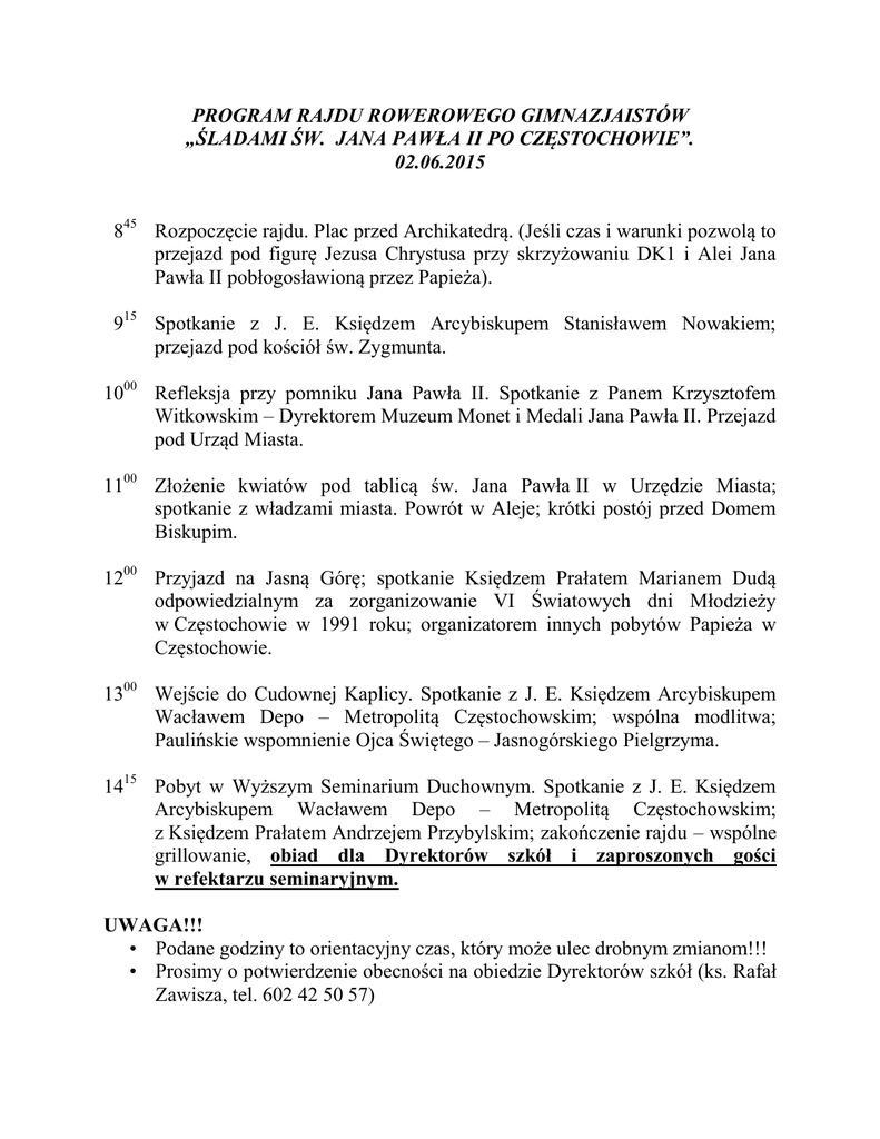 PROGRAM RAJDU ROWEROWEGO GIMNAZJAISTÓW „ŚLADAMI ŚW. JANA PAWŁA II PO CZĘSTOCHOWIE”. 02.06.2015 845 Rozpoczęcie rajdu. Plac przed Archikatedrą. (Jeśli czas i warunki pozwolą to przejazd pod figurę Jezusa Chrystusa przy skrzyżowaniu DK1 i Alei Jana Pawła II pobłogosławioną przez Papieża). 915 Spotkanie z J. E. Księdzem Arcybiskupem Stanisławem Nowakiem; przejazd pod kościół św. Zygmunta. 1000 Refleksja przy pomniku Jana Pawła II. Spotkanie z Panem Krzysztofem Witkowskim – Dyrektorem Muzeum Monet i Medali Jana Pawła II. Przejazd pod Urząd Miasta. 1100 Złożenie kwiatów pod tablicą św. Jana Pawła II w Urzędzie Miasta; spotkanie z władzami miasta. Powrót w Aleje; krótki postój przed Domem Biskupim. 1200 Przyjazd na Jasną Górę; spotkanie Księdzem Prałatem Marianem Dudą odpowiedzialnym za zorganizowanie VI Światowych dni Młodzieży w Częstochowie w 1991 roku; organizatorem innych pobytów Papieża w Częstochowie. 1300 Wejście do Cudownej Kaplicy. Spotkanie z J. E. Księdzem Arcybiskupem Wacławem Depo – Metropolitą Częstochowskim; wspólna modlitwa; Paulińskie wspomnienie Ojca Świętego – Jasnogórskiego Pielgrzyma. 1415 Pobyt w Wyższym Seminarium Duchownym. Spotkanie z J. E. Księdzem Arcybiskupem Wacławem Depo – Metropolitą Częstochowskim; z Księdzem Prałatem Andrzejem Przybylskim; zakończenie rajdu – wspólne grillowanie, obiad dla Dyrektorów szkół i zaproszonych gości w refektarzu seminaryjnym. UWAGA!!! • Podane godziny to orientacyjny czas, który może ulec drobnym zmianom!!! • Prosimy o potwierdzenie obecności na obiedzie Dyrektorów szkół (ks. Rafał Zawisza, tel. 602 42 50 57)