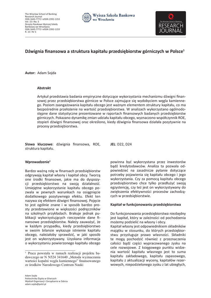 The Wroclaw School of Banking Research Journal ISSN 1643-7772 I eISSN 2392-1153 Vol. 15 I No. 5 Zeszyty Naukowe Wyższej Szkoły Bankowej we Wrocławiu ISSN 1643-7772 I eISSN 2392-1153 R. 15 I Nr 5 Dźwignia finansowa a struktura kapitału przedsiębiorstw górniczych w Polsce1 Autor: Adam Sojda Abstrakt Artykuł przedstawia badania empiryczne dotyczące wykorzystania mechanizmu dźwigni finansowej przez przedsiębiorstwa górnicze w Polsce zajmujące się wydobyciem węgla kamiennego. Poziom zaangażowania kapitału obcego jest ważnym elementem struktury kapitału, co ma bezpośrednie przełożenie na wartość przedsiębiorstwa. W analizach wykorzystano ogólnodostępne dane statystyczne prezentowane w raportach finansowych badanych przedsiębiorstw górniczych. Pokazano dynamikę zmian udziału kapitału obcego, wyznaczono współczynnik ROE, stopień dźwigni finansowej oraz określono, kiedy dźwignia finansowa działała pozytywnie na procesy przedsiębiorstwa. Słowa kluczowe: dźwignia finansowa, ROE, struktura kapitału. JEL: D22, D24 Wprowadzenie1 powinna być wykorzystana przez inwestorów bądź kredytodawców. Analiza ta pozwala odpowiedzieć na zasadnicze pytanie dotyczące potrzeby pojawienia się kapitału obcego i jego wykorzystania. Czy za pomocą kapitału obcego przedsiębiorstwo chce tylko przedłużyć swoją egzystencję, czy też jest on wykorzystywany do zwiększenia efektywności procesów zachodzących w przedsiębiorstwie. Bardzo ważną rolę w finansach przedsiębiorstw odgrywają kapitał własny i kapitał obcy. Tworzą one środki finansowe, jakie ma do dyspozycji przedsiębiorstwo na swoją działalność. Umiejętne wykorzystanie kapitału obcego pozwala w pewnych warunkach na osiągnięcie dodatkowego pozytywnego efektu. Efekt ten nazywa się efektem dźwigni finansowej. Pojęcie to jest ogólnie znane i w sposób bardzo prosty przedstawione w większości podręczników na szkolnych przykładach. Brakuje jednak publikacji wykorzystujących rzeczywiste dane finansowe przedsiębiorstw. Należy zauważyć, że w każdym przypadku, kiedy przedsiębiorstwo w swoim bilansie wykazuje istnienie kapitału obcego, należałoby sprawdzić, w jaki sposób jest on wykorzystywany. Uzyskana informacja o wykorzystaniu powierzonego kapitału obcego Praca powstała w ramach realizacji projektu badawczego nr N N524 341640 „Metoda wyznaczania wartości kopalni węgla kamiennego” finansowanego ze środków Narodowego Centrum Nauki 1 Adam Sojda Politechnika Śląska w Gliwicach Wydział Organizacji i Zarządzania w Zabrzu [email protected] Kapitał w funkcjonowaniu przedsiębiorstwa Do funkcjonowania przedsiębiorstwa niezbędny jest kapitał, który w zależności od pochodzenia możemy podzielić na własny i obcy. Kapitał własny jest odpowiednikiem składników majątku w stosunku, do których przedsiębiorstwu przysługuje prawo własności. Składniki te mogą pochodzić również z przeznaczenia całości bądź części wypracowanego zysku na cele rozwojowe. Z księgowego punktu widzenia wartość kapitału własnego jest to suma kapitału zakładowego, kapitału zapasowego, kapitału z aktualizacji wyceny, kapitałów rezerwowych, niepodzielonego zysku z lat ubiegłych, The Wroclaw School of Banking Research Journal I ISSN 1643-7772 I eISSN 2392-1153 I Vol. 15 I No. 5 Dźwignia finansowa jak i zysku netto z działalności bieżącej. Suma ta jest pomniejszona o sumę wartości należnych wypłat na kapitał zakładowy, wartość akcji własnych, niepokrytej straty z lat ubiegłych czy też straty netto z bieżącej działalności, jak i odpisów zysku netto w ciągu roku obrotowego. Kapitał własny zgodnie z art. 28 ust. 1 pkt 10 ustawy o rachunkowości wycenia się wg wartości nominalnej. Należy zwrócić uwagę, że kapitał własny w działalności przedsiębiorstwa pełni ważną rolę, bowiem jest podstawowym źródłem finansowania działalności przedsiębiorstwa. Jest to źródło pozostające w dyspozycji przedsiębiorstwa bezterminowo i stanowiące jednocześnie zabezpieczenie dla wierzycieli. Wielkość kapitału własnego powinna być na poziomie umożliwiającym dalszą działalność, inwestycje czy też zaciągnięcie kredytu. Kapitał obcy jest to kapitał, którym przedsiębiorstwo dysponuje na określony czas i po tym czasie musi być zwrócony. Korzystanie z kapitału obcego jest jednak dodatkowo obarczone dodatkowym kosztem w postaci odsetek. Przeważnie dawca kapitału chce mieć wpływ na jego wykorzystanie. Do czasu zwrotu pożyczony kapitał stanowi zobowiązania przedsiębiorstwa. Zobowiązania można podzielić na: • kredyty bankowe, • zobowiązania wobec dostawców materiałów towarów i usług, • zobowiązania z tytułu zaciągniętych pożyczek od różnych osób prawych, • zobowiązania publicznoprawne, np. rozliczenia z budżetem państwa, • zobowiązania wobec własnych pracowników. Kapitały obce można podzielić ze względu na czas: • zobowiązani długoterminowe – do nich zaliczamy długoterminowe pożyczki i obligacje, długoterminowe kredyty bankowe i inne zobowiązania długoterminowe powyżej 1 roku liczonego od dnia bilansowego, • zobowiązania krótkoterminowe – do tych zobowiązań zaliczamy: pożyczki, obligacje, kredyty bankowe, różne zobowiązania z tytułu dostaw, podatków i wynagrodzeń o terminie spłaty do 1 roku bilansowego. Korzystanie z kapitału obcego oznacza dla przedsiębiorstwa konieczność dzielenia się przyszłymi zyskami, jakie przedsiębiorstwo wygeneruje, wykorzystując pożyczony kapitał z właścicielem kapitału i płacąc mu odsetki. Korzystanie z kapitału obcego powinno przekładać się na podniesienie efektywności realizowanych procesów, co powinno być widoczne poprzez zwiększenie rentowności i pośrednio wpływać na wartości. Aleksandra Duliniec stwierdza, że „zaciąganie przez przedsiębiorstwo oprocentowanych zobowiązań uruchamia mechanizm tzw. 