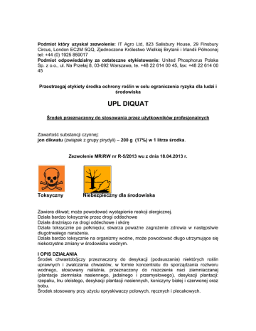 Podmiot który uzyskał zezwolenie: IT Agro Ltd, 823 Salisbury House, 29 Finsbury Circus, London EC2M 5QQ, Zjednoczone Królestwo Wielkiej Brytanii i Irlandii Północnej tel: +44 (0) 1925 859017 Podmiot odpowiedzialny za ostateczne etykietowanie: United Phosphorus Polska Sp. z o.o., ul. Na Przełaj 8, 03-092 Warszawa, te. +48 22 614 00 45, fax: +48 22 614 00 45 Przestrzegaj etykiety środka ochrony roślin w celu ograniczenia ryzyka dla ludzi i środowiska UPL DIQUAT Środek przeznaczony do stosowania przez użytkowników profesjonalnych Zawartość substancji czynnej: jon dikwatu (związek z grupy pirydyli) – 200 g (17%) w 1 litrze środka. Zezwolenie MRiRW nr R-5/2013 wu z dnia 18.04.2013 r. Toksyczny Niebezpieczny dla środowiska Zawiera dikwat; może powodować wystąpienie reakcji alergicznej. Działa bardzo toksycznie przez drogi oddechowe Działa drażniąco na drogi oddechowe i skórę Działa toksycznie po połknięciu; stwarza poważne zagrożenie zdrowia w następstwie długotrwałego narażenia. Działa bardzo toksycznie na organizmy wodne, może powodować długo utrzymujące się niekorzystne zmiany w środowisku wodnym. I OPIS DZIAŁANIA Środek chwastobójczy przeznaczony do desykacji (podsuszania) niektórych roślin uprawnych i zwalczania chwastów, w formie koncentratu do sporządzania roztworu wodnego, stosowany nalistnie, przeznaczony do niszczenia naci ziemniaczanej (plantacje ziemniaka nasiennego, jadalnego i przemysłowego), desykacji plantacji: rzepaku, lnu oleistego, desykacji plantacji nasiennych, koniczyny białej i czerwonej oraz bobu. Środek stosowany przy użyciu opryskiwaczy polowych, ręcznych i plecakowych. DZIAŁANIE NA CHWASTY Środek działa kontaktowo i przemieszcza się w ograniczonym stopniu w roślinie. Niszczy nadziemne zielone części roślin, przez które jest szybko absorbowany. Opady deszczu wkrótce po opryskiwaniu nie obniżają skuteczności działania środka. Wyższe temperatury i silniejsze nasłonecznienie przyspieszają jego działanie. Środek traci aktywność po zetknięciu się z glebą w ciągu 1-3 dni, najszybciej następuje to na glebie gliniastej. II ZAKRES STOSOWANIA, TERMINY I DAWKI Wyższe z zalecanych dawek środka stosować na zwarte łany roślin, rośliny wyrośnięte, w warunkach silnego zachwaszczenia i w późniejszych fazach rozwojowych chwastów. ROŚLINY ROLNICZE 1. Desykacja - niszczenie naci ziemniaczanej. Środek ochrony roślin UPL Diquat stosuje się w celu: − polepszenia zdrowotności i jakości bulw poprzez zapobieganie przemieszczaniu się wirusów z liści i łodyg do bulw, zapobieganie i ograniczanie porażenia bulw zarazą ziemniaka oraz zmniejszenie liczby uszkodzeń mechanicznych podczas zbioru. − przygotowanie plantacji ziemniaka do zbioru bulw poprzez przyspieszenie dojrzewania bulw ziemniaka oraz zwiększenie udziału frakcji sadzeniakowej w plonie bulw − ułatwienie pracy maszyn (kopaczki, kombajny) podczas zbioru bulw ziemniaka. Termin stosowania środka ustala się w zależności od przebiegu warunków agrometeorologicznych w danym rejonie kraju, od grupy wczesności odmiany, przeznaczenia ziemniaków, wielkości bulw oraz stopnia dojrzałości skórki na bulwach ziemniaka. Uwzględniający zagrożenie chorobami wirusowymi na plantacjach nasiennych: Niszczenie naci ziemniaczanej daje najlepsze efekty, gdy zabieg wykonuje się do około 2 tygodni po głównym locie mszyc (wektorów chorób wirusowych), z tego powodu należy uzyskać szczegółowe informacje o przebiegu lotów w danym roku i rejonie (IHAR Oddział Bonin, lokalne oddziały Państwowej Inspekcji Ochrony Roślin i Nasiennictwa). Ze względu na dojrzałość skórki zabieg wykonuje się na ogół: – odmiany wczesne od III dekady lipca do I dekady sierpnia, – odmiany średniowczesne od I do II dekady sierpnia, – odmiany późne do końca sierpnia (ze znacznie słabszym efektem w ograniczaniu porażenia bulw ziemniaka). Uwzględniający zwalczanie zarazy ziemniaka: W programie ochrony plantacji przed zarazą ziemniaka niszczenie naci ziemniaczanej traktuje się jako ostatni zabieg ochronny, niszczący zarodniki grzyba, przemieszczające się z części nadziemnej roślin ziemniaka do bulw. Termin zbioru: w 10-14 dni po zastosowaniu środka UPL Diquat. Przetrzymywanie bulw ziemniaka w glebie przez okres dłuższy niż 3 tygodnie może spowodować odrastanie części nadziemnych roślin oraz zwiększa zagrożenie porażeniem bulw rizoktoniozą. UPL Diquat należy stosować w dawkach dzielonych: Pierwszy zabieg w dawce 2-3 l/ha, Drugi zabieg w 4-7 dni po pierwszym zabiegu, w dawce 2 l/ha. Uwagi: 1. W okresie długotrwałej suszy nie wykonywać niszczenia naci. Zabieg wykonać, gdy rośliny ziemniaka znajdują się w pełni turgoru (najlepiej po deszczu, na obeschnięte rośliny, we wczesnych godzinach rannych). 2. Nie wykonywać niszczenia naci ziemniaczanej, gdy gleba jest popękana i bulwy ziemniaka są widoczne na powierzchni. 3. Na plantacjach nasiennych ziemniaka zaleca się stosowanie dawek dzielonych, ze względu na możliwość równomiernego zniszczenia naci. 4. Stosując środek do niszczenia naci ziemniaczanej, do cieczy użytkowej nie dodawać zwilżacza. 2. Desykacja roślin uprawianych na nasiona. Desykacja wyrównuje dojrzewanie roślin eliminując wpływ nierównomiernego rozsiania nawozów mineralnych i zróżnicowania glebowego oraz likwiduje wtórne zachwaszczenie, powodując zasychanie chwastów. W roślinach krzyżowych, np.: w rzepaku zmniejsza skłonność łuszczyn do pękania, obniża wilgotność nasion i decyduje o terminie zbioru. A) Rzepak ozimy i jary (desykacja plantacji nasiennych i przeznaczonych na przerób przemysłowy). Termin stosowania: gdy na plantacji rzepaku na pędach głównych roślin 70% łuszczyn jest żółtawo-seledynowych, nasiona w górnej części pędu są ciemnobrązowe, a w części środkowej i dolnej pędu czarne, tj. 3-4 dni po terminie koszenia w przypadku sprzętu 