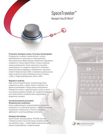 SpaceTraveler™ Navigate Your3D World™ Przenośny. Dostępny cenowo. Po prostu niewiarygodny. Pożegnaj się z nudnymi, powtarzalnymi ruchami wykonywanymi w czasie pracy z wykorzystaniem zwyczajnej myszy. Wykorzystując wielokrotnie nagradzane urządzenie o nazwie SpaceTraveler możesz zwiększyć swoją produktywność. Sześć optycznych czujników zastosowanych w urządzeniu zapewnia Ci możliwość jednoczesnego przeglądania, powiększania i obracania modeli trójwymiarowych (3D), z możliwością jednoczesnej edycji za pomocą myszy. Redukujesz pracę z myszką o 50%, a Twoja produktywność rośnie o 30%. Wygodny w podróży. Mały rozmiar SpaceTraveler umożliwia jego łatwe ustawienie na stole, a dzięki małemu ciężarowi, nie będzie przeszkadzał w Twojej torbie z komputerem. Dlatego też możesz z niego korzystać w pracy, w domu oraz podczas podróży. Ponadto, do urządzenia dodawany jest modny futerał z włoskiej skóry, zapewniający bezpieczny transport. 8 programowalnych przycisków. Nieograniczone możliwości. Osiem podświetlanych, programowalnych przycisków, umożliwia Ci uruchamianie poleceń, z których korzystasz najczęściej w trakcie pracy z Twoimi ulubionymi aplikacjami, za pomocą jednego naciśnięcia. Dostępny dla każdego. SpaceTraveler kosztuje jedynie 199 EUR, tak więc z łatwością zwróci się po pierwszym projekcie dzięki oszczędności czasu... a także będzie przynosił korzyści zawsze, kiedy będziesz z niego korzystał. 3Dconnexion | SpaceTraveler Ponad 100 wspieranych aplikacji – przykładowe programy Projektowanie i modelowanie • AutoCAD • Autodesk Inventor • CATIA • Google SketchUp • Pro/ENGINEER • NX • Solid Edge • SolidWorks Po prostu naciskaj, odciągaj, przekręcaj i przechylaj drążek manipulatora, aby zapewnić właściwe sterowanie. Przesuwanie w prawo i w lewo Przesuwanie do góry i w dół Przechylenie Okręcanie Obracanie Przybliżanie / Oddalanie Digital Content Creation • Autodesk 3ds Max • Autodesk AliasStudio • Autodesk Maya • form•Z • SOFTIMAGE|XSI Narzędzia do wizualizacji • Google Earth • Autodesk DWF Viewer • Autodesk Design Review • SolidWorks eDrawings • Dassault Systemes XML player • 3Dconnexion Picture Viewer Kompletna lista wszystkich wspieranych aplikacji znajduje się na stronie www.3dconnexion.com Specyfikacje Kontrola nawigacji Zaawansowany optyczny sensor, 6 stopni swobody ruchu Szybkość urządzenia Dostosowana do preferencji Klawisze funkcyjne 8 dowolnie programowanych klawiszy szybkiego dostępu Typ interfejsu USB Waga 0.51 lb (0.23 kg) Wymiary 1.8”x1.7” (Średnica x Wysokość) (46x46x43mm) Gwarancja 2 lata Standardy bezpieczeństwa FCC, CE, VCCI, RRL, WHQL, CTICK, UL Wymagania systemowe • Procesor Intel Pentium 4/III, AMD/Athlon lub wyższy • Windows: 140 MB wolnego dysku na instalację sterownika i plug-in • Unix/Linux: 2 MB wolnego dysku na instalację sterownika • USB 1.1 lub 2.0 Wspomagane systemy operacyjne • Windows XP, x86 lub x64 • UNIX (HP-UX 11, IBM AIX 5.2, Sun Solaris 8 lub wyższy) • Linux (Redhat Enterprise Linux WS 3, SuSE 9.0 lub wyższy) Europe/EMEA Europe/Eastern Europe 3Dconnexion GmbH Seefeld, Germany P: +49 (0) 8152 9919 0 F: +49 (0) 8152 9919 50 E: [email protected] 3Dconnexion Wrocław, Poland P: +48 71 343 5798 F: +48 71 788 5483 E: [email protected] © 2006 3Dconnexion. All rights reserved. 3Dconnexion, the 3Dconnexion logo, and other 3Dconnexion marks are owned by 3Dconnexion and may be registered. All other trademarks are the property of their respective owners.