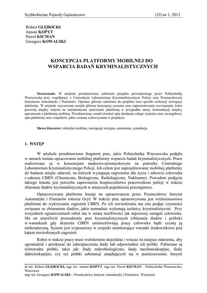Szybkobieżne Pojazdy Gąsienicowe (32) nr 1, 2013 Robert GŁĘBOCKI Antoni KOPYT Paweł KICMAN Grzegorz KOWALSKI KONCEPCJA PLATFORMY MOBILNEJ DO WSPARCIA BADAŃ KRYMINALISTYCZNYCH Streszczenie. W artykule przedstawiono założenia projektu prowadzonego przez Politechnikę Warszawską przy współpracy z Centralnym Laboratorium Kryminalistycznym Policji oraz Przemysłowym Instytutem Automatyki i Pomiarów. Opisano główne założenia do projektu oraz sposób realizacji nawigacji platformy. W artykule zarysowana została główna koncepcja systemu oraz zaprezentowano rozwiązania, które pozwolą między innymi na autonomiczne sterowanie platformą w przypadku utraty komunikacji między operatorem a platformą mobilną. Przedstawiony został również opis działania całego systemu oraz szczegółowy opis platformy oraz czujników, jakie zostaną wykorzystane w projekcie. Słowa kluczowe: robotyka mobilna, nawigacja wizyjna, autonomia, symulacja. 1. WSTĘP W artykule przedstawiono fragment prac, jakie Politechnika Warszawska podjęła w ramach tematu opracowania mobilnej platformy wsparcia badań kryminalistycznych. Prace realizowane są w konsorcjum naukowo-przemysłowym na potrzeby Centralnego Laboratorium Kryminalistycznego Policji. Ich celem jest zaprojektowanie mobilnej platformy do badania miejsc zdarzeń, na których występują zagrożenia dla życia i zdrowia człowieka z zakresu CBRN (Chemiczne, Biologiczne, Radiologiczne, Nuklearne). Powodem podjęcia takiego tematu jest potrzeba zapewnienia bezpieczeństwa pracownikom policji w trakcie zbierania śladów kryminalistycznych w miejscach popełnienia przestępstwa. Opracowywana platforma bazuje na opracowanym przez Przemysłowy Instytut Automatyki i Pomiarów robocie Gryf. W trakcie prac opracowywana jest wielosensorowa platforma do wykrywania zagrożeń CBRN. Po ich stwierdzeniu ma ona podjąć czynności związane ze zbieraniem śladów, jakie normalnie wykonują technicy kryminalistyczni. Przy wszystkich ograniczeniach robot ma w miarę możliwości jak najszerzej zastąpić człowieka. Ma on umożliwić prowadzenie prac kryminalistycznych (zbierania śladów i próbek) w warunkach gdy skażenia CBRN uniemożliwiają pracę człowieka bądź czynią ją niebezpieczną. System jest wyposażony w czujniki monitorujące warunki środowiskowe pod kątem stwierdzonych zagrożeń. Robot w trakcie pracy musi wielokrotnie dojeżdżać i wracać na miejsce zdarzenia, aby zgromadzić i przekazać do zabezpieczenia ślady lub odpowiednie ich próbki. Pobierane są różnorodne próbki, takie jak: ślady mikrobiologiczne, ślady mechanoskopijne, ślady daktyloskopijne, czy też próbki substancji znajdujących się w pomieszczeniu. Innymi dr inż. Robert GŁĘBOCKI, mgr inż. Antoni KOPYT, mgr inż. Paweł KICMAN – Politechnika Warszawska, Warszawa mgr inż. Grzegorz KOWALSKI – Przemysłowy Instytut Automatyki i Pomiarów, Warszawa Robert GŁĘBOCKI, Antoni KOPYT, Paweł KICMAN czynnościami mogą być: zebranie niektórych przedmiotów z miejsca zdarzenia celem ich dalszej analizy lub np. rejestracja fotograficzna miejsca zdarzenia. Scenariusz prac przewiduje wielokrotne misje robota w trakcie jednych oględzin miejsca zdarzenia. Najpierw platforma, wyposażona w zestaw czujników CBRN, wjeżdża na miejsce zdarzenia, celem sprawdzenia występowania zagrożeń. Jeżeli zostaną one stwierdzone, dalsze prace są również wykonywane za pośrednictwem robota. Kolejnym etapem jest dokumentacja fotograficzna miejsca zdarzenia. Ma to być wykonane przy użyciu specjalnej kamery 3D oraz tradycyjnych zdjęć. Dalsza kolejność działań zależy od prowadzącego akcję. Składa się standardowo z następujących etapów: rozpoznanie przez operatora wyraźnych, często charakterystycznych śladów danego zdarzenia lub ewentualnych skutków przestępstwa czy przedmiotów mających istotny związek z czynem, również przedmiotów, z których mógł korzystać sprawca. Na tym etapie operator musi rozpoznać wyraziste, nadające się do natychmiastowego zabrania ślady kryminalistyczne i dowody rzeczowe, w szczególności te, które mogą ograniczać swobodne poruszanie się platformy po miejscu zdarzenia; zabezpieczenie w całości śladów w postaci przedmiotów o małych i średnich gabarytach (np. butelki, niedopałki papierosów, szklanki, odzież, torebki lub inne pojemniki z substancjami stałymi lub ciekłymi).W celu wstępnej oceny jakościowej substancji pod względem chemicznym operator ma możliwość użycia spektrometru ramanowskiego (po zamontowaniu przez operatora wymiennie z modułami próbkobiorczymi); gdy nie można pobrać już więcej śladów, platforma wyjeżdża z miejsca zdarzenia. Platforma zostaje opróżniona i zdezynfekowana. Zabezpieczone przedmioty będą przepakowane przez specjalistę i opatrzone metryczkami; platforma zostaje wyposażona w nowe narzędzia do pobierania próbek. Teleoperowana platforma wjeżdża ponownie na miejsce zdarzenia i wykonuje dalsze czynności zmierzające do ujawniania i zabezpieczania kolejnych śladów. Czynności opisane w powyższych punktach powtarzane są do momentu, aż wszystkie rozpoznane przez operatora przedmioty zostaną podjęte i wywiezione z miejsca zdarzenia. Po zabezpieczeniu śladów w całości następuje wymiana wyposażenia platformy na takie, które pozwoli na zabezpieczanie śladów, których nie można podjąć w całości (np. plamy krwi na różnych podłożach, rozsypane i rozlane substancje chemiczne). Tego typu scenariusz pracy wymusza na całości systemu, aby jego konstrukcja umożliwiała szybki montaż – demontaż specjalistycznego oprzyrządowania, to jest uchwytów, manipulatorów itp. które będą montowane w zależności od rodzaju zabezpieczanych śladów (biologicznych, chemicznych, daktyloskopijnych, mechanoskopijnych, mikrośladów, łusek, pocisków itp.) oraz niezbędnych pojemników do przechowywania tych śladów. W tym celu opracowywa