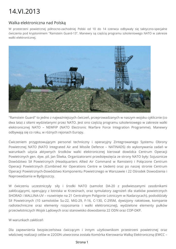 14.VI.2013 Walka elektroniczna nad Polską W przestrzeni powietrznej północno-zachodniej Polski od 10 do 14 czerwca odbywały się taktyczno-specjalne ćwiczenia pod kryptonimem "Ramstein Guard-13". Manewry są częścią programu szkoleniowego NATO w zakresie walki elektronicznej. "Ramstein Guard" to jedno z najważniejszych ćwiczeń, przeprowadzanych w naszym wojsku cyklicznie (co dwa lata) z siłami wydzielanymi przez NATO. Jest ono częścią programu szkoleniowego w zakresie walki elektronicznej NATO – NEWFIP (NATO Electronic Warfare Force Integration Programme). Manewry odbywają się co roku, w różnych rejonach Europy. Ćwiczeniem przygotowującym personel techniczny i operacyjny Zintegrowanego Systemu Obrony Powietrznej NATO (NATO Integrated Air and Missile Defence – NATINADS) do wykonywania zadań w warunkach użycia aktywnych środków walki elektronicznej kierował dowódca Centrum Operacji Powietrznych gen. dyw. pil. Jan Śliwka. Organizatorami przedsięwzięcia ze strony NATO były: Sojusznicze Dowództwo Sił Powietrznych (Headquarters Allied Air Command w Ramstein) i Połączone Centrum Operacji Powietrznych (Combined Air Operations Centre w Uedem) oraz po naszej stronie Centrum Operacji Powietrznych-Dowództwo Komponentu Powietrznego w Warszawie i 22 Ośrodek Dowodzenia i Naprowadzania w Bydgoszczy. W ćwiczeniu uczestniczyły siły i środki NATO (samolot DA-20 z podwieszanymi zasobnikami zakłócającymi, operujący z lotniska w Krzesinach, oraz symulatory zagrożeń dla statków powietrznych SHORAD i MALLINA-UV – rozwinięte na 21 Centralnym Poligonie Lotniczym w Nadarzycach), pododdziały Sił Powietrznych (10 samolotów Su-22, MiG-29, F-16, C-130, C-295M, dywizjony rakietowe, kompanie radiotechniczne oraz elementy rozpoznania i walki elektronicznej), wydzielone elementy pułków przeciwlotniczych Wojsk Lądowych oraz stanowisko dowodzenia 22 ODN oraz COP-DKP. W warunkach zakłóceń Dla zapewnienia bezpieczeństwa ćwiczącym i innym użytkownikom przestrzeni powietrznej oraz właściwej realizacji celów w 22ODN utworzona została Komórka Kierowania Walką Elektroniczną (EWCC – Strona 1 Electronic Warfare Coordination Cell), w skład której wchodzili przedstawiciele NATO, ćwiczących jednostek oraz Państwowej Agencji Żeglugi Powietrznej. Działania EWCC koordynował zastępca kierownika ćwiczenia, płk Stefan Walowski. Planowaniem działań i wydawaniem dokumentów rozkazodawczych dla lotnictwa zajmował się Pion Planowania Operacji COP-DKP. Nawigatorzy doskonalili umiejętności naprowadzania samolotów w warunkach zakłóceń elektronicznych, zarówno stacji radiolokacyjnych, jak i środków łączności. Piloci doskonalili umiejętności wykorzystania pokładowych urządzeń WE, stosowania aktywnych i pasywnych przeciwśrodków, działania w warunkach użycia lotniczych i naziemnych stacji zakłóceń pokładowych systemów kierowania uzbrojeniem. W trakcie ćwiczenia operatorzy stacji radiolokacyjnych, stacji naprowadzania rakiet oraz operatorzy sprzętu łączności doskonalili umiejętności prowadzenia pracy bojowej w warunkach zakłóceń elektronicznych, w tym: rozpoznania radiolokacyjnego przestrzeni powietrznej, zwalczania celów stosujących zakłócenia elektroniczne oraz działających pod przykryciem zakłóceń elektronicznych, obrony elektronicznej naziemnych urządzeń radioelektronicznych. Symulacja w podczerwieni Na poligonie w Nadarzycach, gdzie rozmieszczone były symulatory SHORAD i MALLINA-UV, piloci mieli możliwość wielokrotnego sprawdzenia taktyki samoobrony przed symulowanymi środkami przeciwlotniczymi naprowadzanymi radiolokacyjnie i na podczerwień. Używali flar i dipoli. Obsługi sprzętu rozpoznania i WE prowadziły ciągłe monitorowanie sytuacji elektronicznej – zakłócenia pokładowych systemów radiolokacyjnych. Ponadto obsługi urządzeń naziemnych oraz piloci doskonalili się w rozpoznawaniu różnych zakłóceń o zróżnicowanej mocy. Natomiast personel zmian dyżurnych 22ODN doskonalił umiejętności organizowania i kierowania obroną elektroniczną podczas działań bojowych. Kierownik "Ramstein Guard-13" generał Śliwka ocenił, że dzięki bardzo dobremu przygotowaniu oraz maksymalnemu zaangażowaniu uczestników ćwiczenie przebiegło pomyślnie i bezpiecznie, a sprzyjająca pogoda pozwoliła na osiągnięcie założonych celów szkoleniowych. Tekst: ppłk Grzegorz Sujkowski Zdjęcia: chor. szt. Robert Skowron, Ryszard Najder, Ryszard Tarnowski, kpt. Maciej Nojek, kpt. Tomasz Słowiński, kpt. Dariusz Kurowski, plut. Patryk Cieriński, st. sierż. Marcin Tycner Strona 2