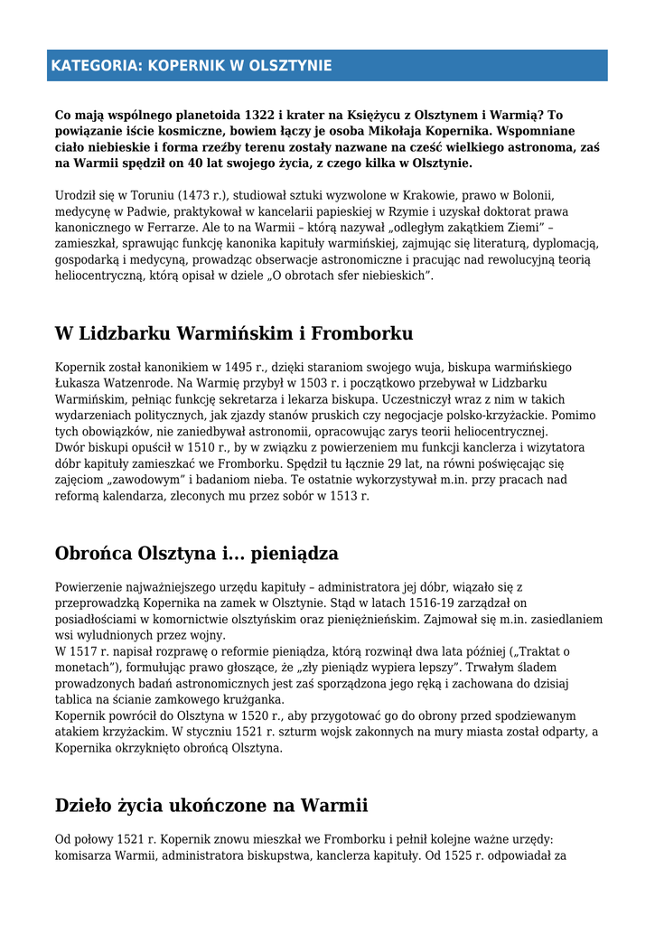 KATEGORIA: KOPERNIK W OLSZTYNIE Co mają wspólnego planetoida 1322 i krater na Księżycu z Olsztynem i Warmią? To powiązanie iście kosmiczne, bowiem łączy je osoba Mikołaja Kopernika. Wspomniane ciało niebieskie i forma rzeźby terenu zostały nazwane na cześć wielkiego astronoma, zaś na Warmii spędził on 40 lat swojego życia, z czego kilka w Olsztynie. Urodził się w Toruniu (1473 r.), studiował sztuki wyzwolone w Krakowie, prawo w Bolonii, medycynę w Padwie, praktykował w kancelarii papieskiej w Rzymie i uzyskał doktorat prawa kanonicznego w Ferrarze. Ale to na Warmii – którą nazywał „odległym zakątkiem Ziemi” – zamieszkał, sprawując funkcję kanonika kapituły warmińskiej, zajmując się literaturą, dyplomacją, gospodarką i medycyną, prowadząc obserwacje astronomiczne i pracując nad rewolucyjną teorią heliocentryczną, którą opisał w dziele „O obrotach sfer niebieskich”. W Lidzbarku Warmińskim i Fromborku Kopernik został kanonikiem w 1495 r., dzięki staraniom swojego wuja, biskupa warmińskiego Łukasza Watzenrode. Na Warmię przybył w 1503 r. i początkowo przebywał w Lidzbarku Warmińskim, pełniąc funkcję sekretarza i lekarza biskupa. Uczestniczył wraz z nim w takich wydarzeniach politycznych, jak zjazdy stanów pruskich czy negocjacje polsko-krzyżackie. Pomimo tych obowiązków, nie zaniedbywał astronomii, opracowując zarys teorii heliocentrycznej. Dwór biskupi opuścił w 1510 r., by w związku z powierzeniem mu funkcji kanclerza i wizytatora dóbr kapituły zamieszkać we Fromborku. Spędził tu łącznie 29 lat, na równi poświęcając się zajęciom „zawodowym” i badaniom nieba. Te ostatnie wykorzystywał m.in. przy pracach nad reformą kalendarza, zleconych mu przez sobór w 1513 r. Obrońca Olsztyna i... pieniądza Powierzenie najważniejszego urzędu kapituły – administratora jej dóbr, wiązało się z przeprowadzką Kopernika na zamek w Olsztynie. Stąd w latach 1516-19 zarządzał on posiadłościami w komornictwie olsztyńskim oraz pieniężnieńskim. Zajmował się m.in. zasiedlaniem wsi wyludnionych przez wojny. W 1517 r. napisał rozprawę o reformie pieniądza, którą rozwinął dwa lata później („Traktat o monetach”), formułując prawo głoszące, że „zły pieniądz wypiera lepszy”. Trwałym śladem prowadzonych badań astronomicznych jest zaś sporządzona jego ręką i zachowana do dzisiaj tablica na ścianie zamkowego krużganka. Kopernik powrócił do Olsztyna w 1520 r., aby przygotować go do obrony przed spodziewanym atakiem krzyżackim. W styczniu 1521 r. szturm wojsk zakonnych na mury miasta został odparty, a Kopernika okrzyknięto obrońcą Olsztyna. Dzieło życia ukończone na Warmii Od połowy 1521 r. Kopernik znowu mieszkał we Fromborku i pełnił kolejne ważne urzędy: komisarza Warmii, administratora biskupstwa, kanclerza kapituły. Od 1525 r. odpowiadał za pertraktacje z protestanckimi Prusami Książęcymi. Prowadził też dalsze badania astronomiczne i pisał kolejne rozdziały swojego dzieła. Jednak z opublikowaniem „O obrotach...” zwlekał, pomimo przychylnej opinii papieża. Ostatecznie dzieło życia Kopernika ukazało się tuż przed jego śmiercią w 1543 r. Ciało astronoma złożono we fromborskiej katedrze. Dzięki trwającemu od 2004 r. naukowemu śledztwu udało się odnaleźć jego grób i zidentyfikować szczątki. W 2010 r. powtórnie pochowano je w katedrze. Kopernik na zawsze w pamięci Na Warmii Kopernika upamiętniono na różne sposoby. Przez miejsca związane z jego życiem wiedzie turystyczny Szlak Kopernikowski. We Fromborku działa Muzeum Mikołaja Kopernika, prezentując m.in. ekspozycje poświęcone patronowi. Jego myśl i dzieło przybliża także wystawa w Muzeum Warmii i Mazur w Olsztynie. W tym mieście Kopernik ma też ulicę, popiersie i pomnik z ławeczką. Pomnikiem ku jego czci jest również planetarium, otwarte w pięćsetną rocznicę jego urodzin. Imię Kopernika nosi szpital, trzy szkoły i Wydział Nauk Medycznych UWM. W ramach obchodów Roku Mikołaja Kopernika w 2013 r. w Ośrodku Badań Naukowych utworzono Pracownię Kopernikańską, a olsztyński browar uwarzył lawendowy „Gruit Kopernikowski”. 500-lecie przybycia Mikołaja Kopernika do Olsztyna 500. rocznica przybycia wybitnego astronoma do Olsztyna przypada na rok 2016. Z tej okazji powstał m.in. klip podkreślający związek Mikołaja Kopernika z Olsztynem.